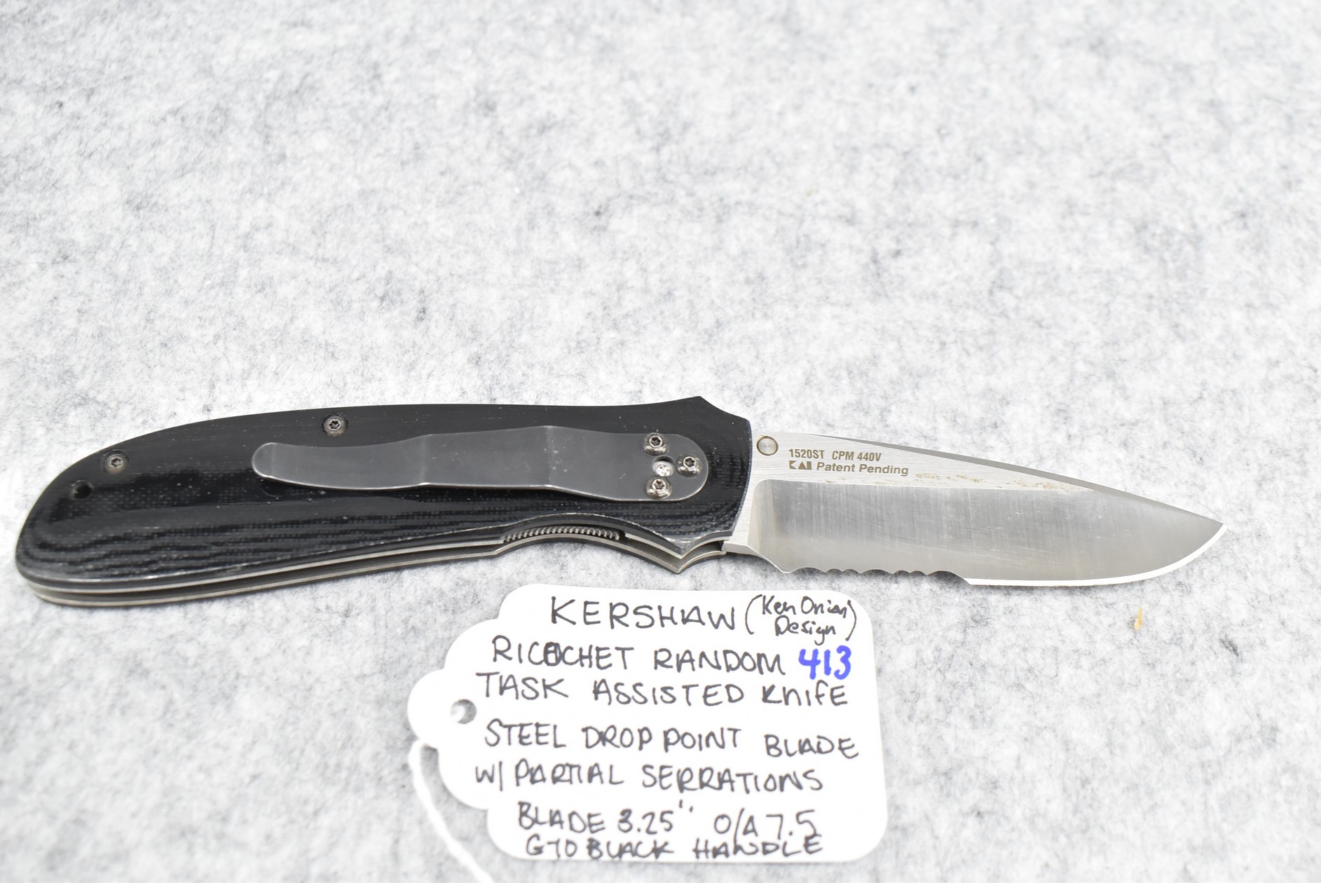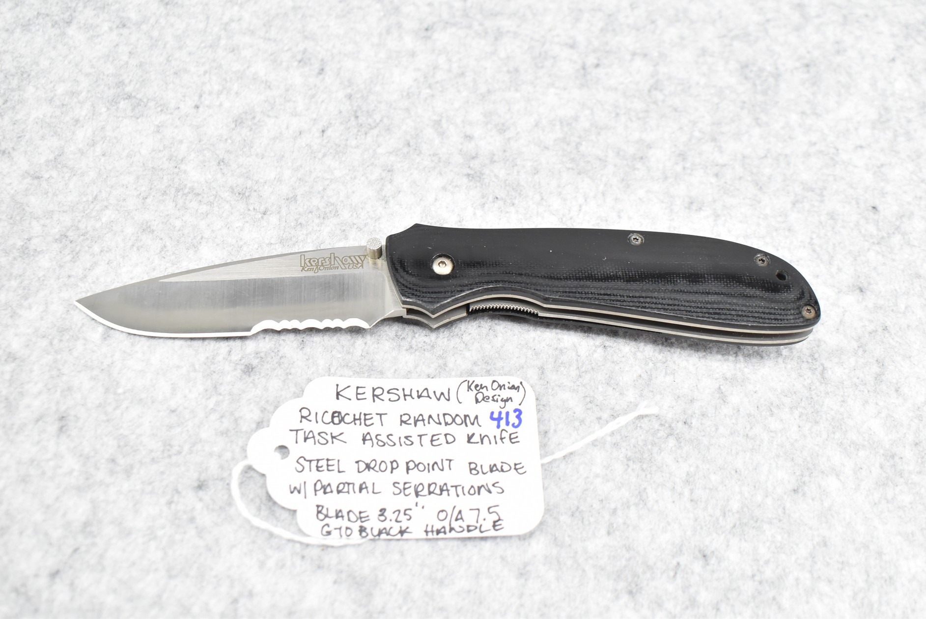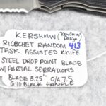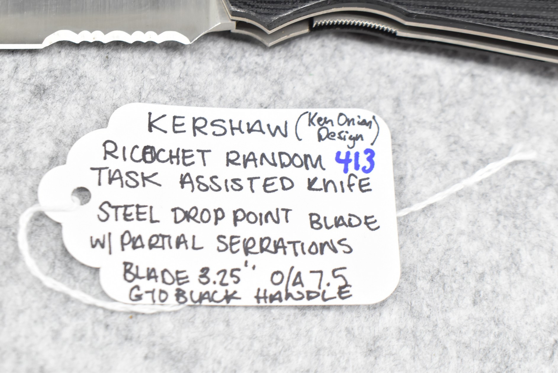 413. Kershaw – Ken Onion Design Ricochet Raman Task Assisted Knife – w/3.25” Steel Drop Point Partially Serrated Blade – 7.5” Overall Length – w/G10 Black Handle