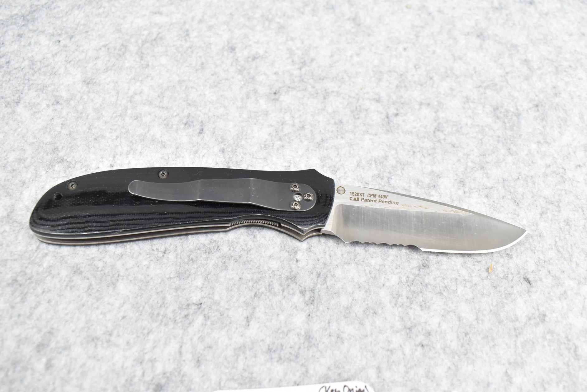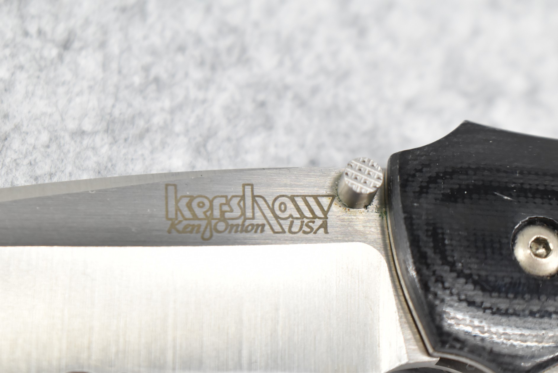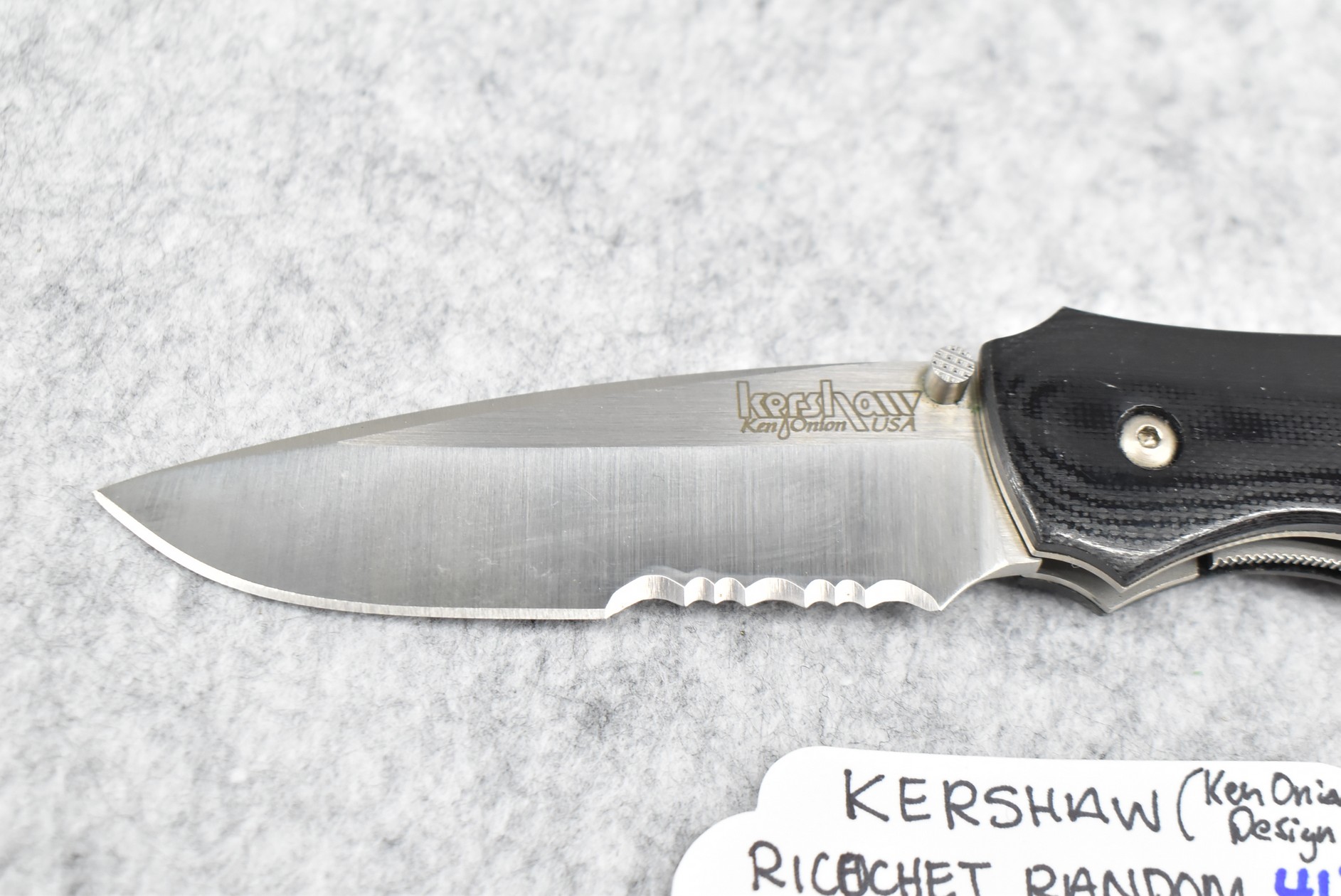 413. Kershaw – Ken Onion Design Ricochet Raman Task Assisted Knife – w/3.25” Steel Drop Point Partially Serrated Blade – 7.5” Overall Length – w/G10 Black Handle