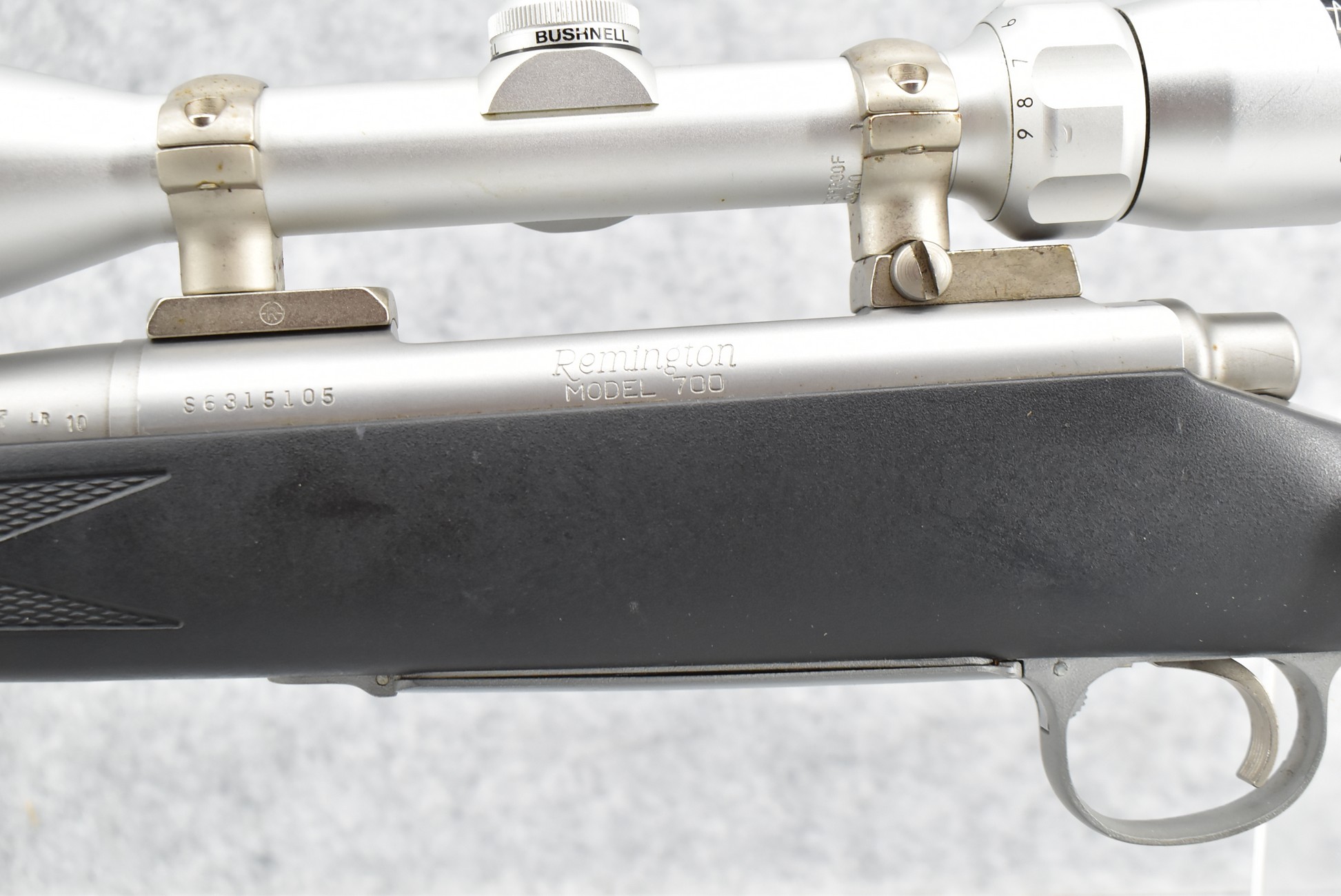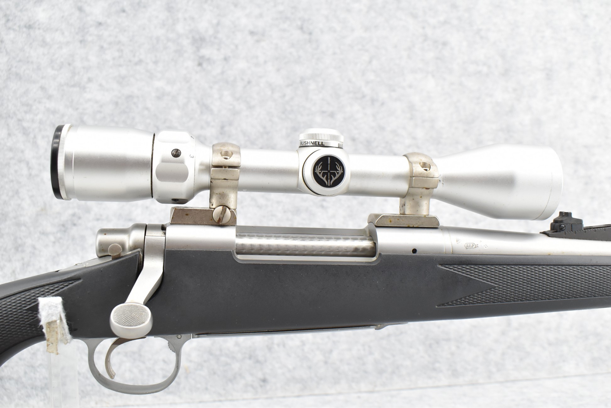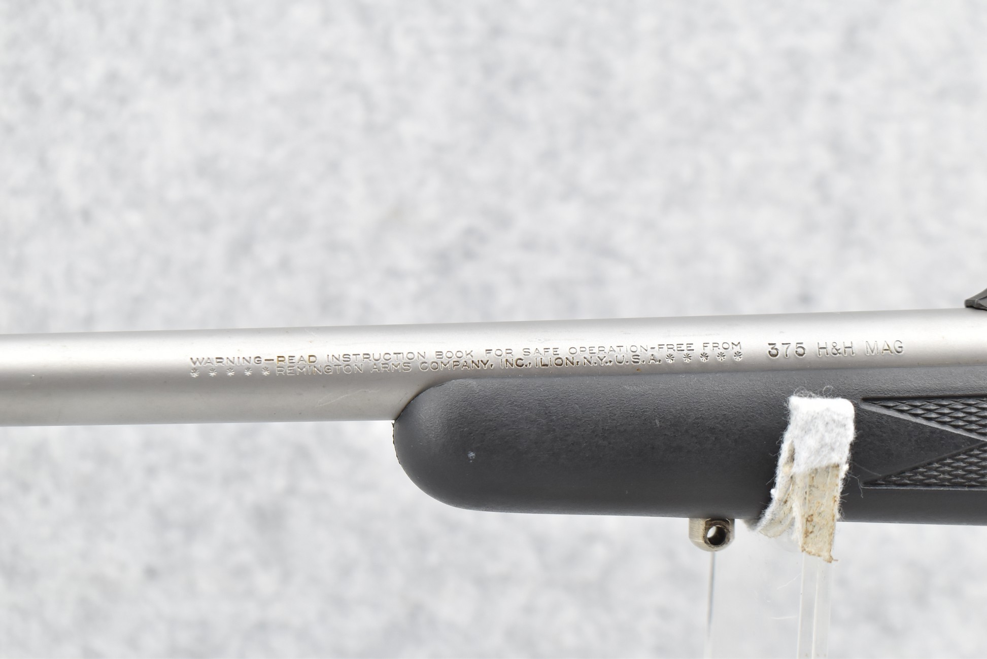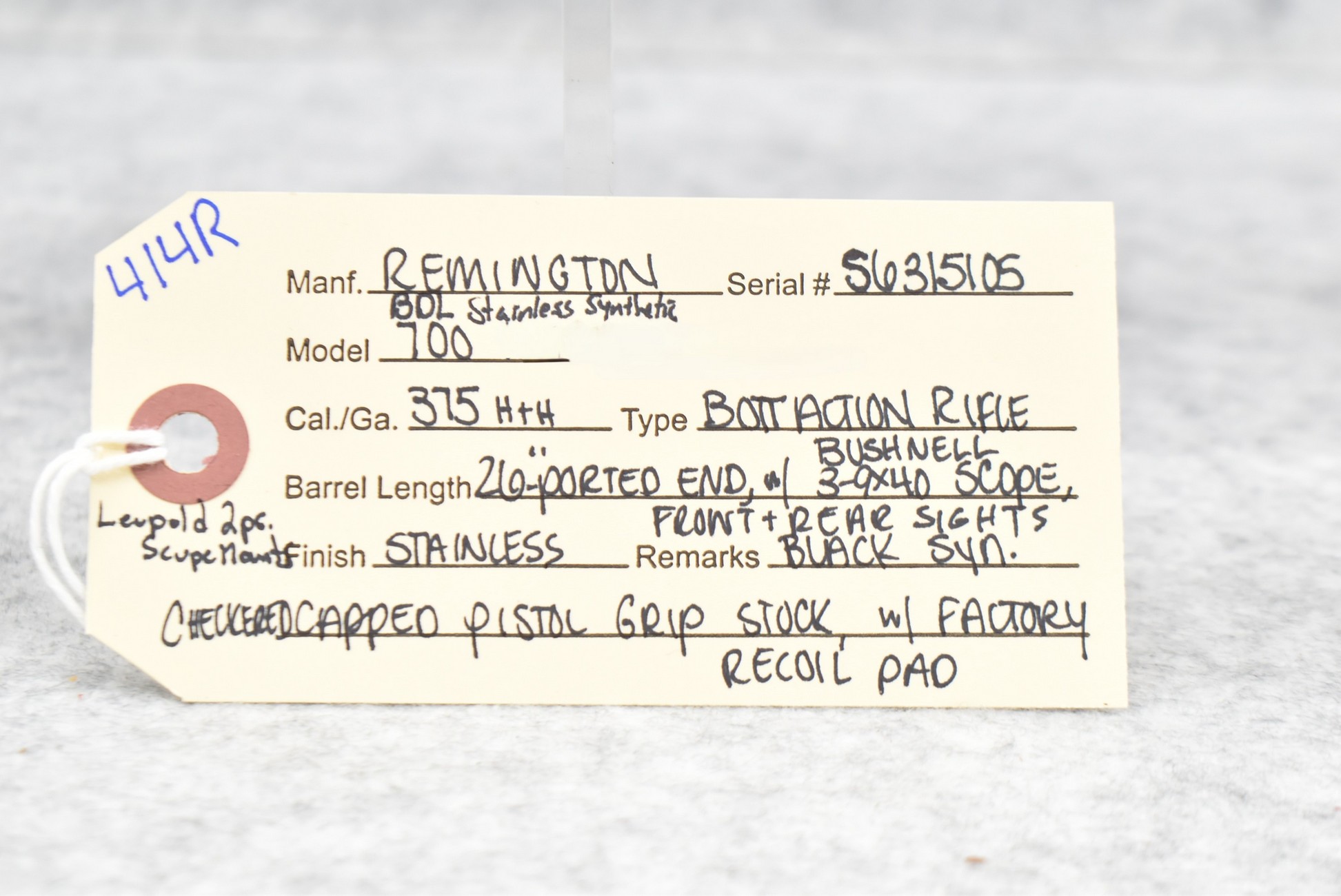 414R. Remington – Mod. 700 BDL Stainless Synthetic – 375 H&H Cal. Bolt Action Rifle – w/26” Ported Barrel w/Front & Rear Sights – Stainless Finish – w/Black Synthetic Checkered Capped Pistol Grip Stock w/Factory Recoil Pad – w/Bushnell 3-9×40 Scope – w/Leupold 2pc. Scope Mounts – 375 H&H Cal. Only Mfg. Between 1997-2002