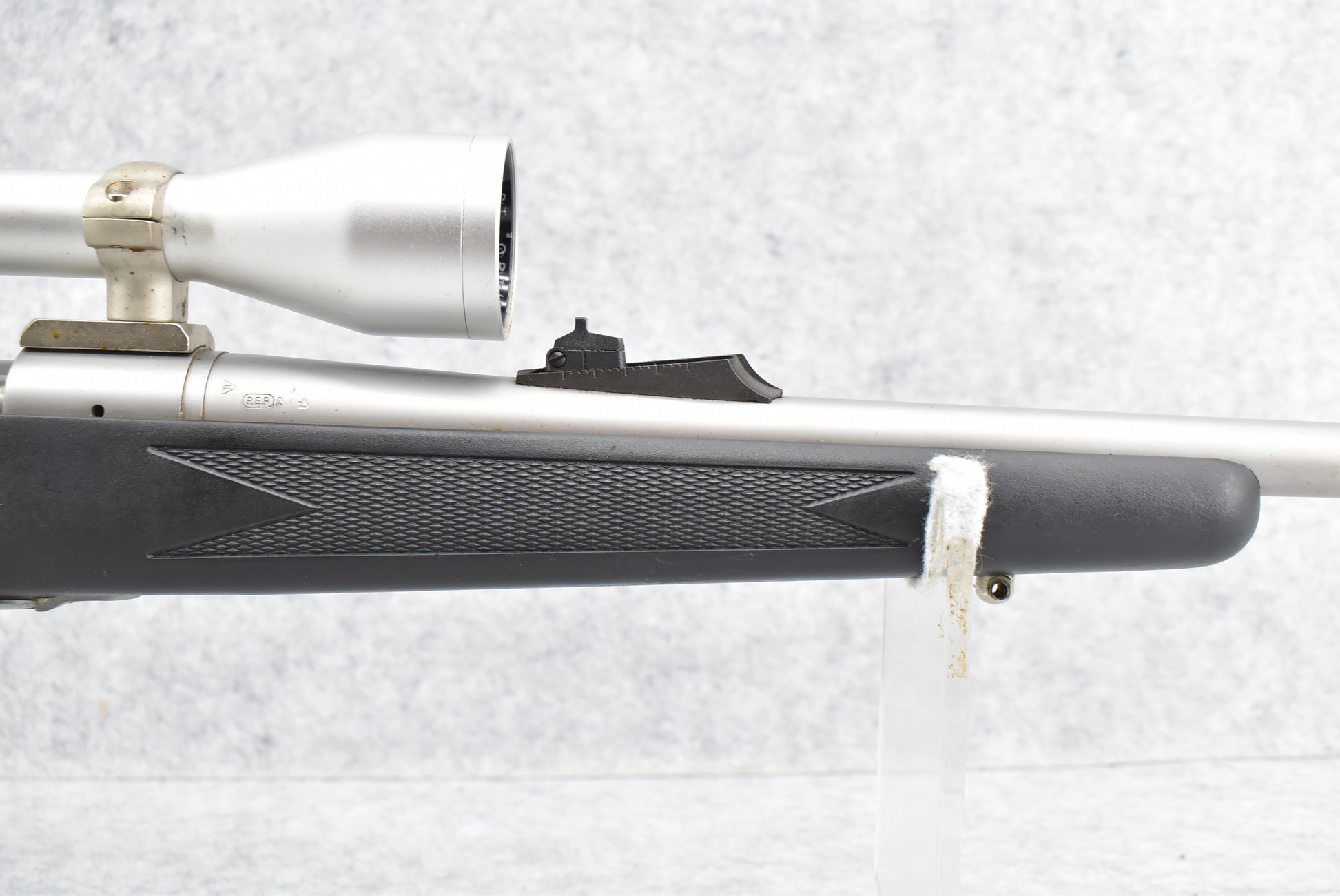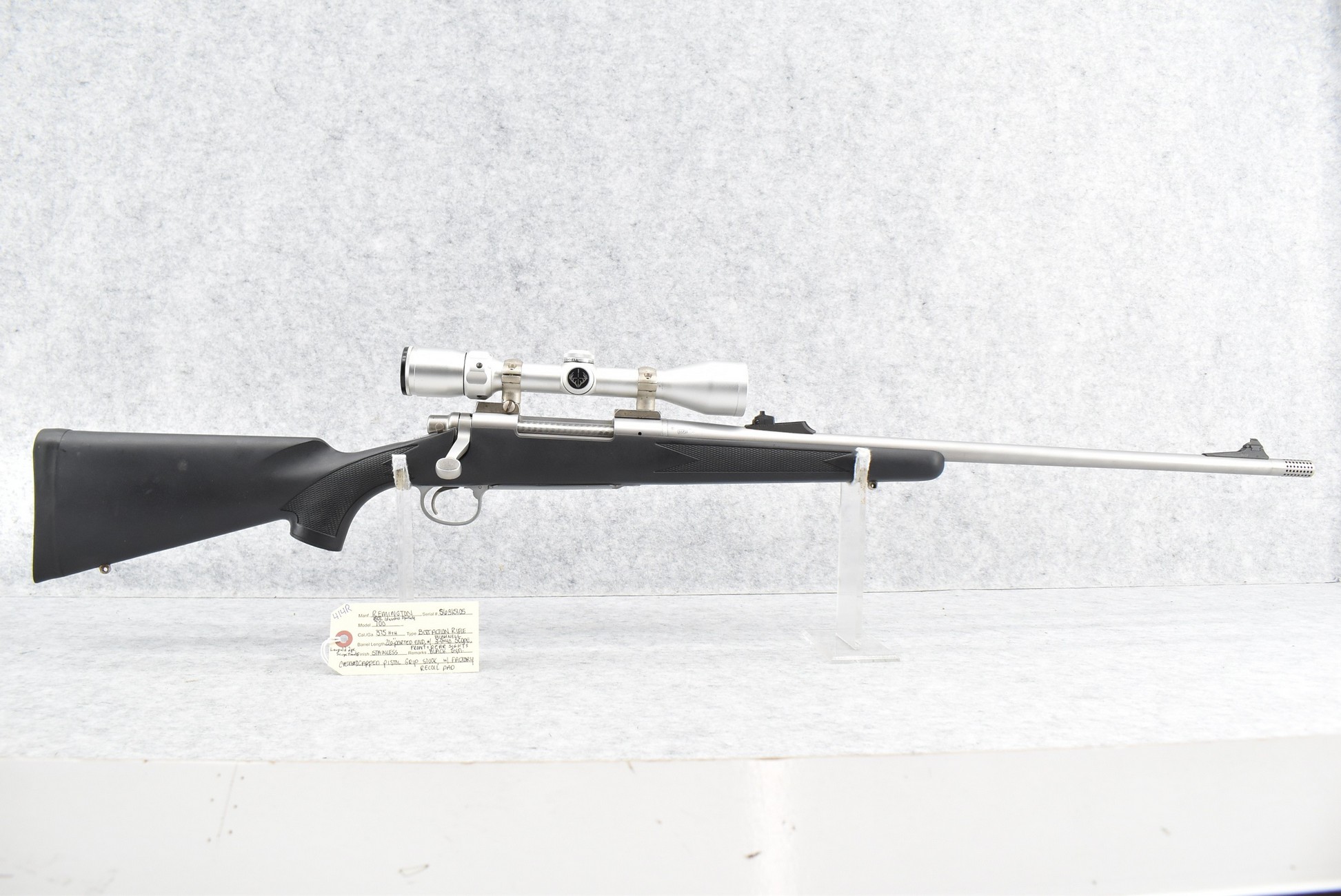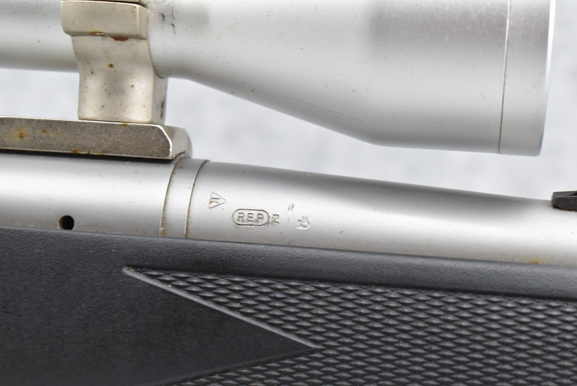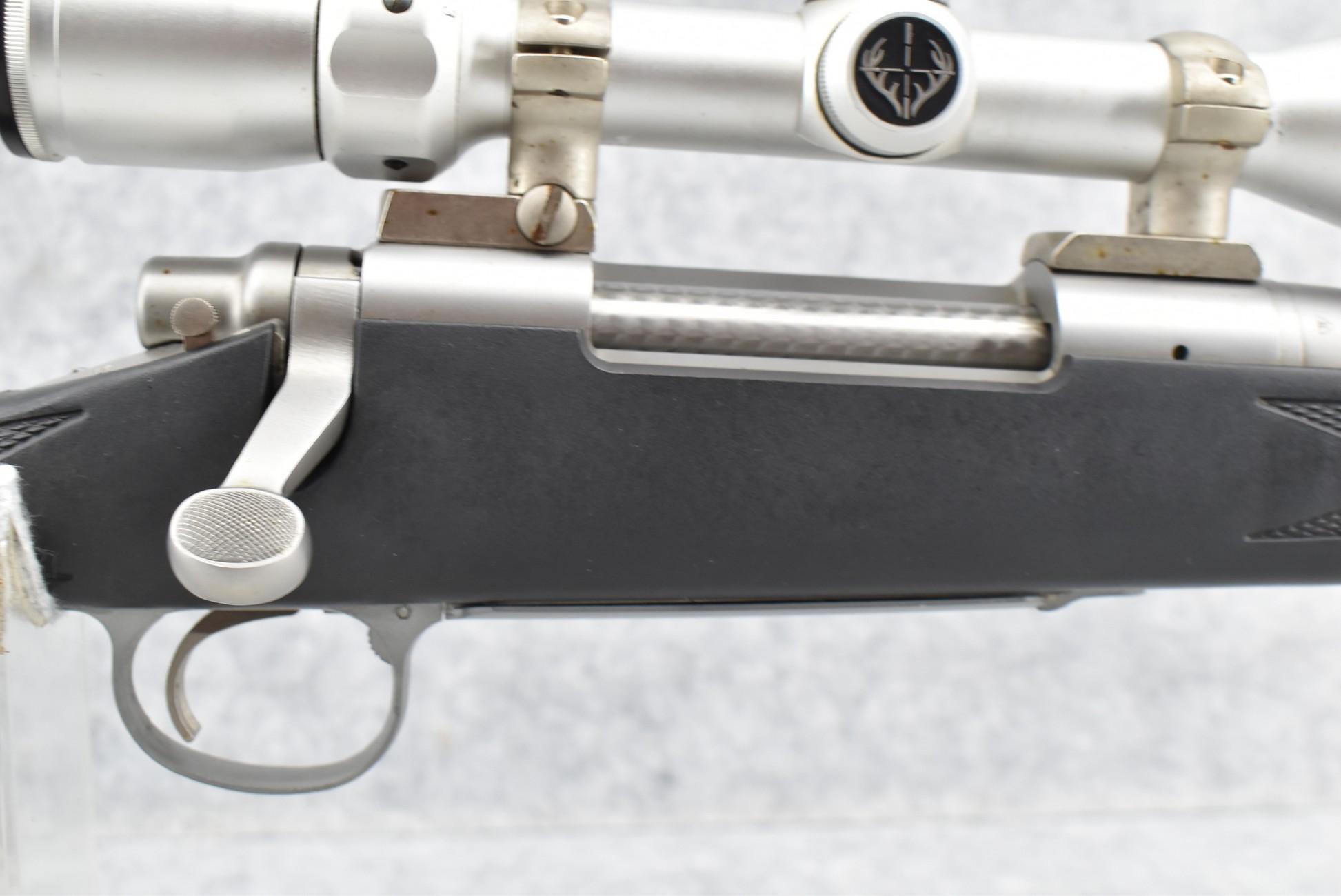 414R. Remington – Mod. 700 BDL Stainless Synthetic – 375 H&H Cal. Bolt Action Rifle – w/26” Ported Barrel w/Front & Rear Sights – Stainless Finish – w/Black Synthetic Checkered Capped Pistol Grip Stock w/Factory Recoil Pad – w/Bushnell 3-9×40 Scope – w/Leupold 2pc. Scope Mounts – 375 H&H Cal. Only Mfg. Between 1997-2002
