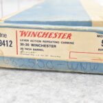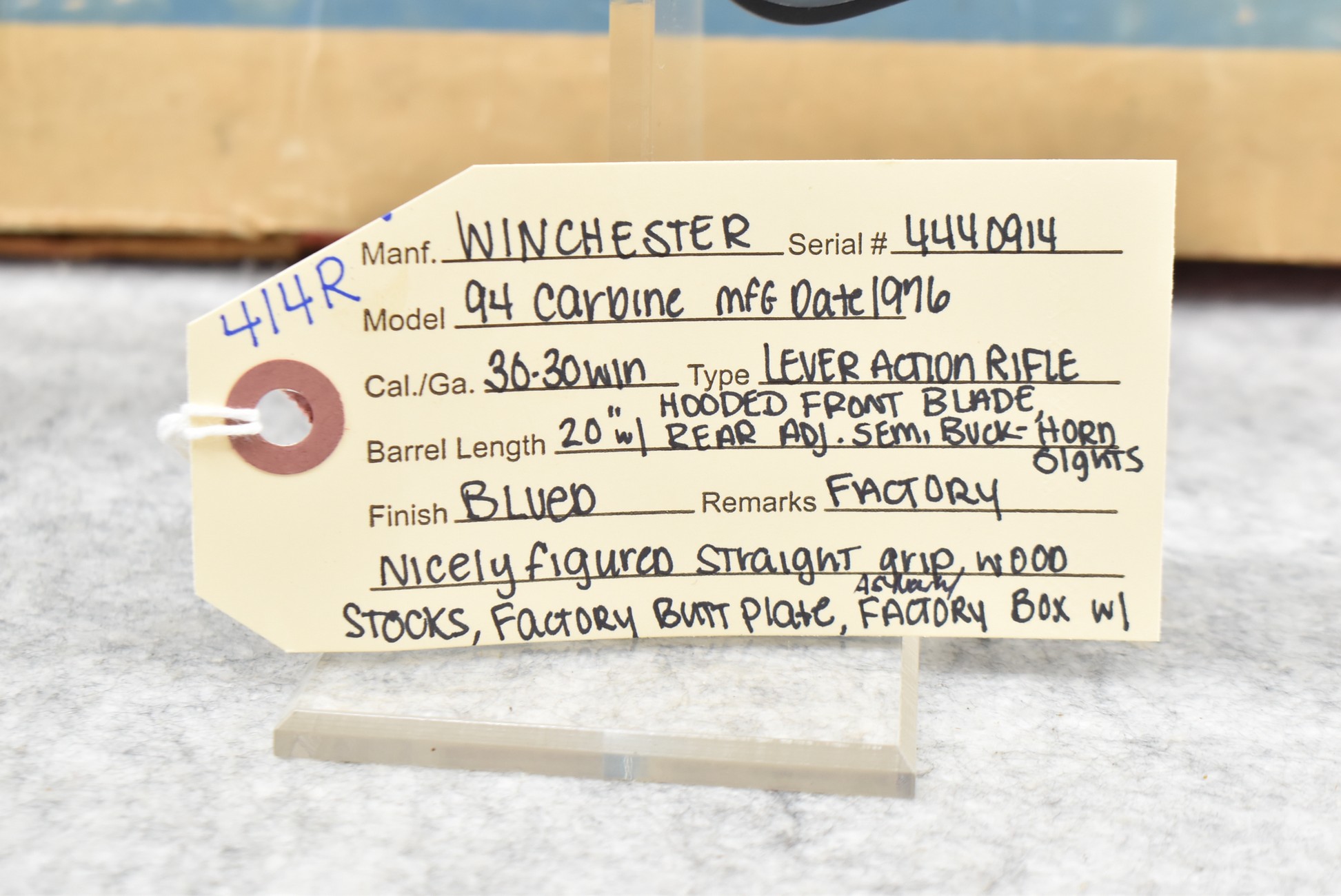 414R. Winchester – Mod. 94 Carbine – 30-30 Win. Cal. Lever Action Rifle – w/20” Barrel w/Hooded Blade Front and Adjustable Rear Semi-Buckhorn Sights – Blued Finish – w/Factory Nicely Figured Straight Grip Wood Stocks w/Factory Butt Plate – Manufactured 1976 – As New w/Factory Box and Manual
