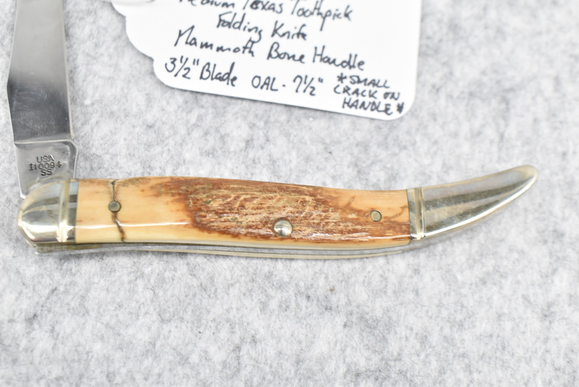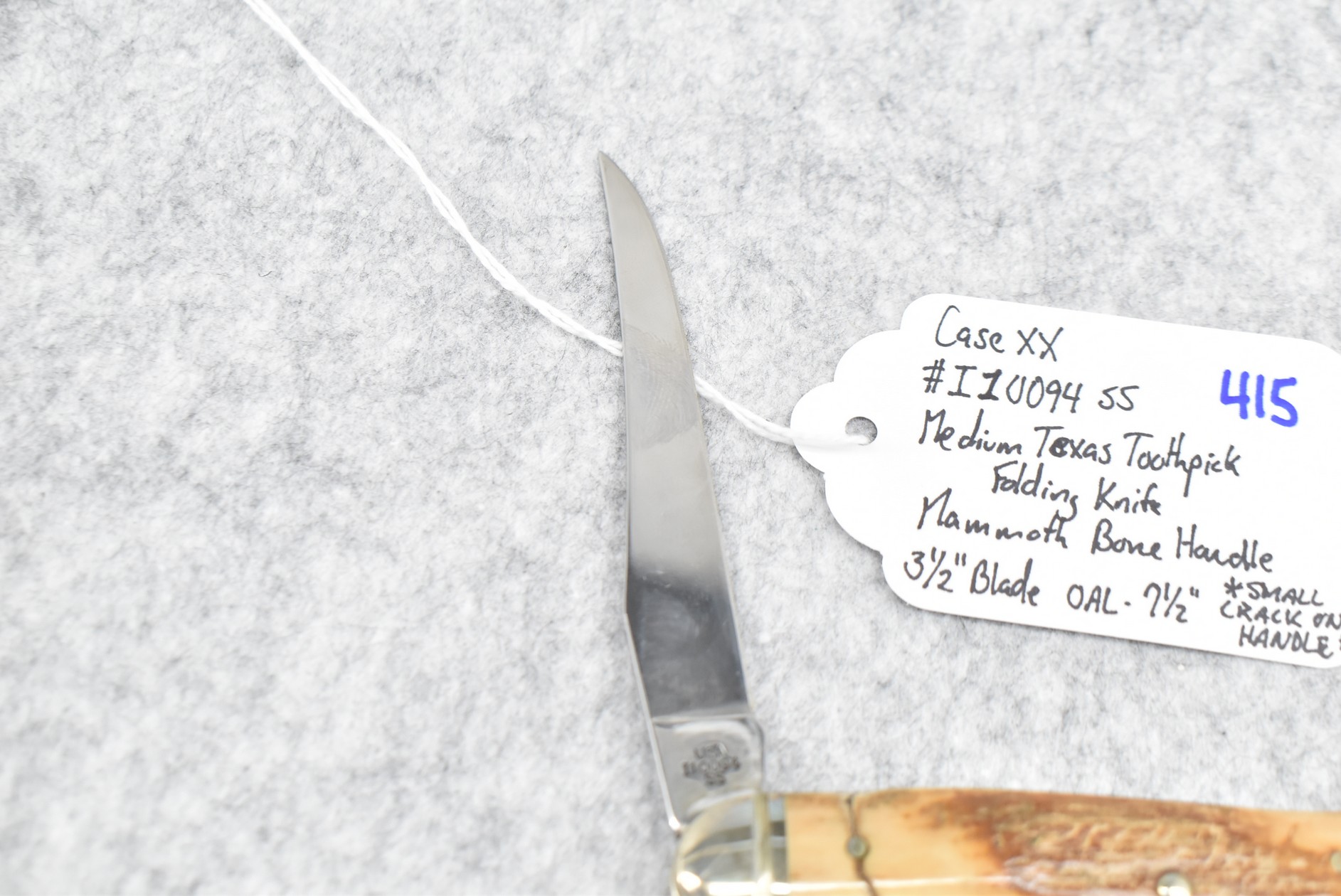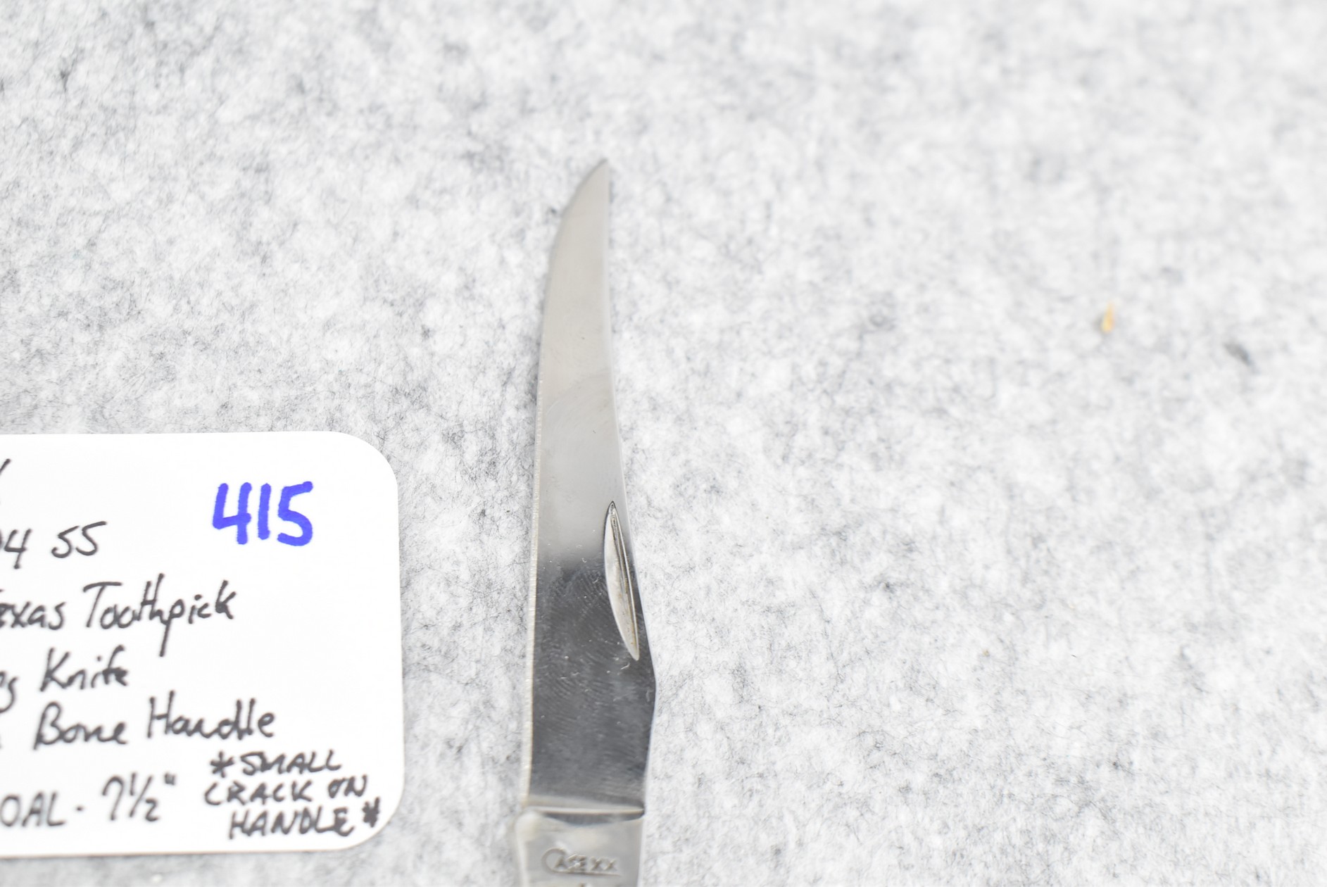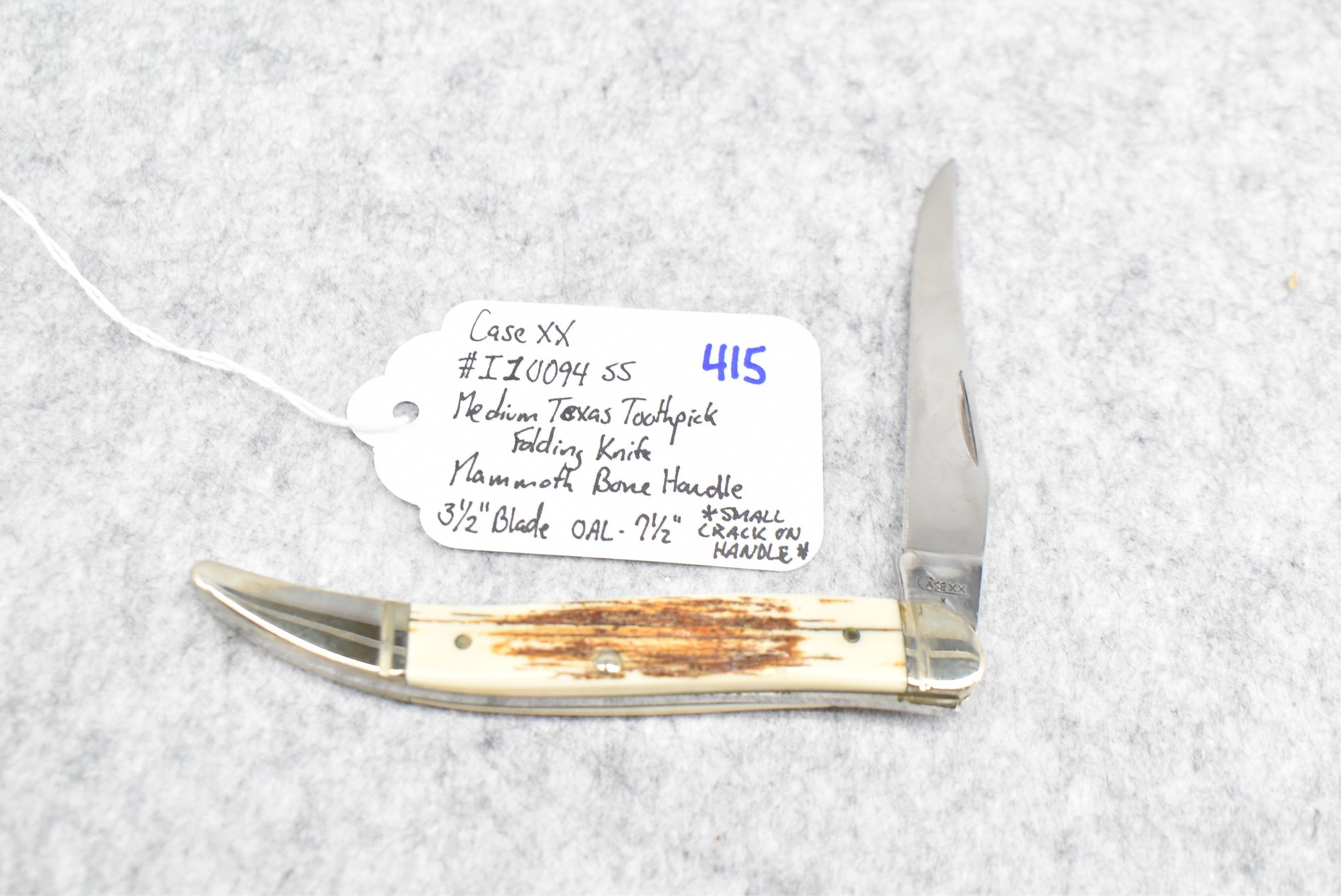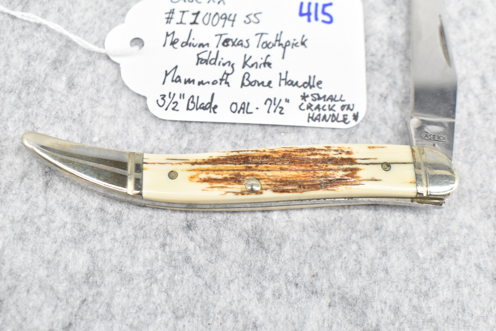 415. Case XX – #I10094 SS Medium Texas Toothpick Folding Knife – w/3 ½” Blade – 7 ½” Overall Length – Note: Small Crack on Handle