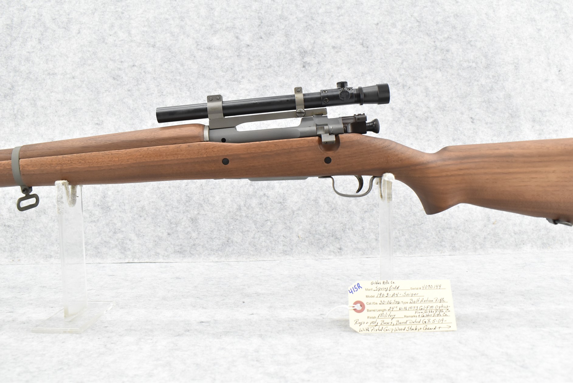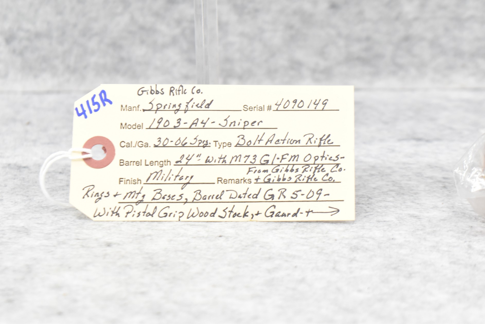 415R. Gibbs Rifle Co./Springfield – Mod. 1903-A4 Sniper – 30-06 Sprg. Cal. Bolt Action Rifle – w/24” GR 5-09 Dated Barrel – Military Finish – w/Pistol Grip Wood Stocks w/Metal Butt Plate & Sling Loops – w/Leather Sling – w/Gibbs Rifle Co. M73G1-FM Optics & Gibbs Rifle Co. Rings & Mounting Base – As New w/Manual