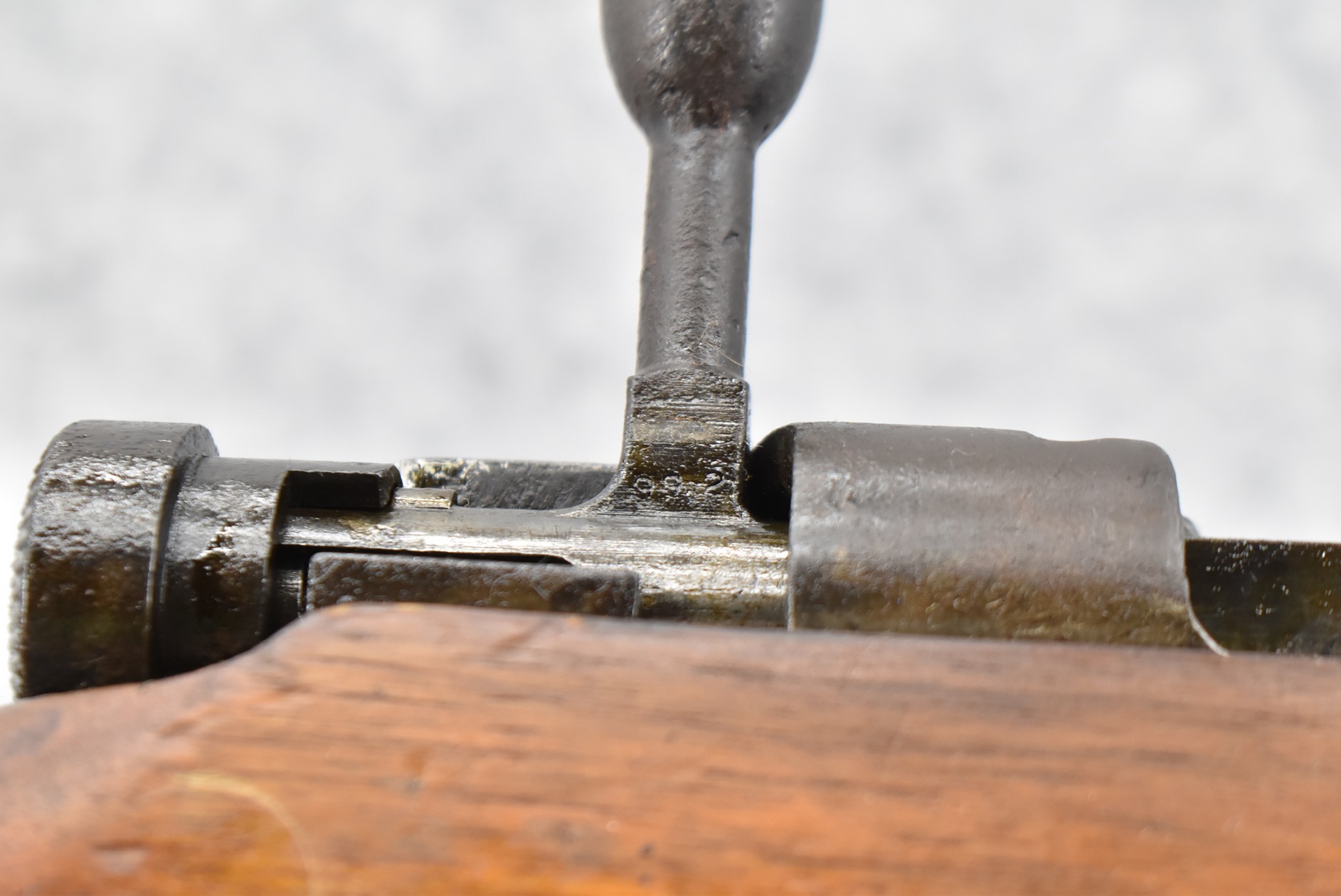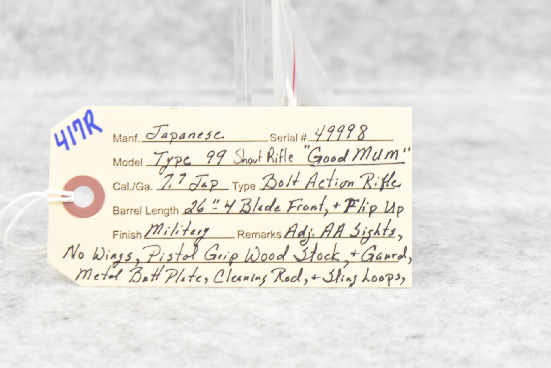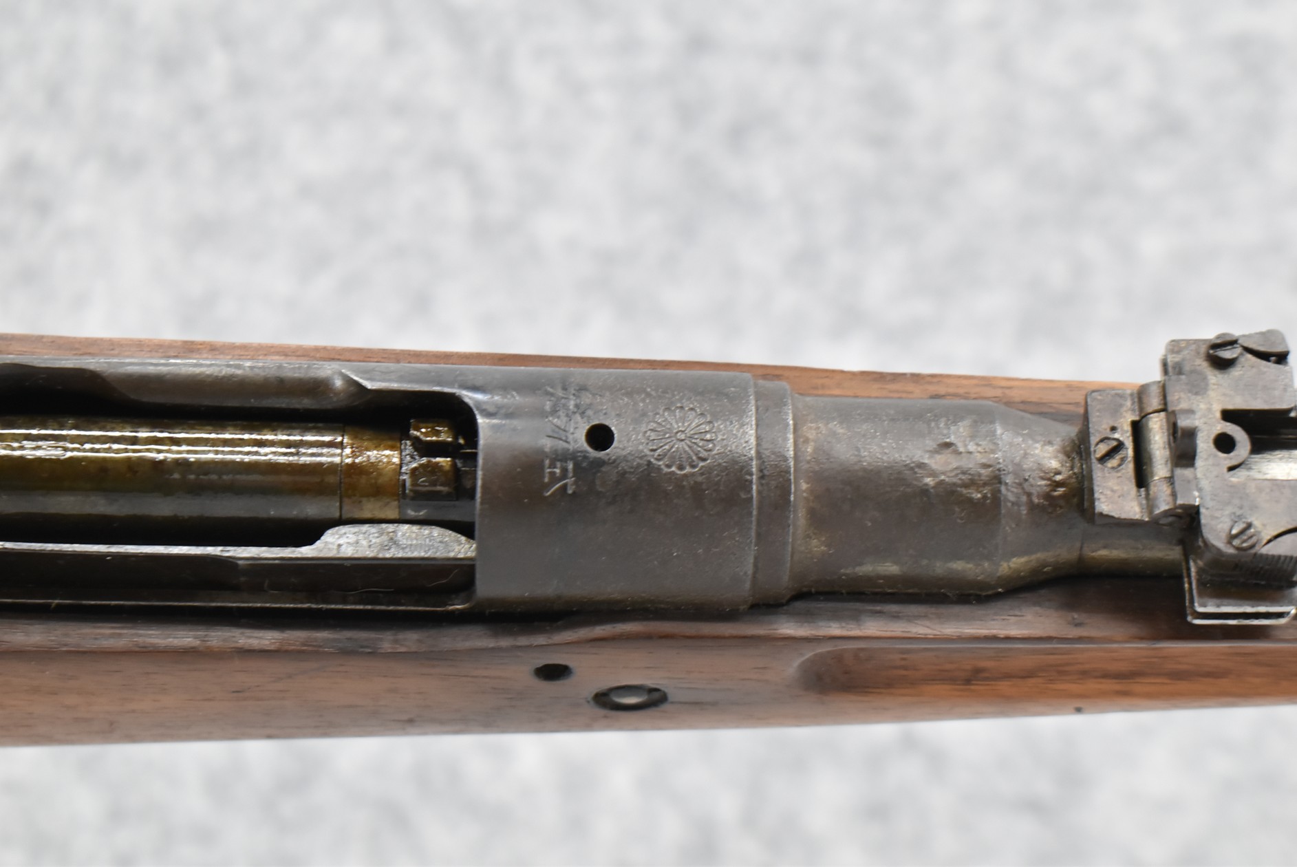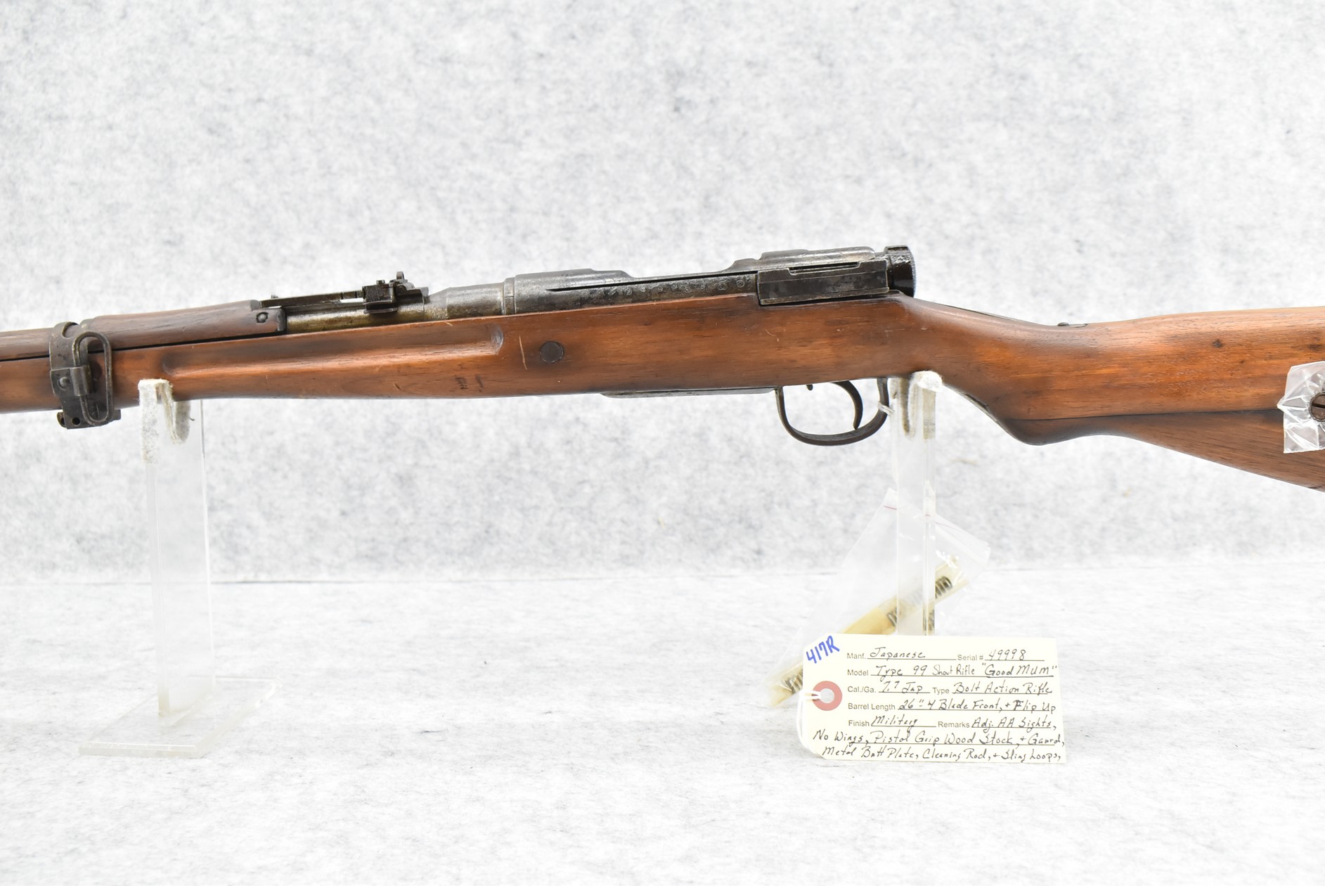 417R. Japanese – Type 99 Short Rifle – 7.7 Jap Cal. Bolt Action Rifle – w/26” Barrel w/Blade Front & Flip Up Adj. Anti-Aircraft Sights, No Wings – Military Finish – w/Pistol Grip Wood Stocks w/Metal Butt Plate & Sling Loops – w/Cleaning Rod – Matching Bolt – Unground Mum