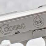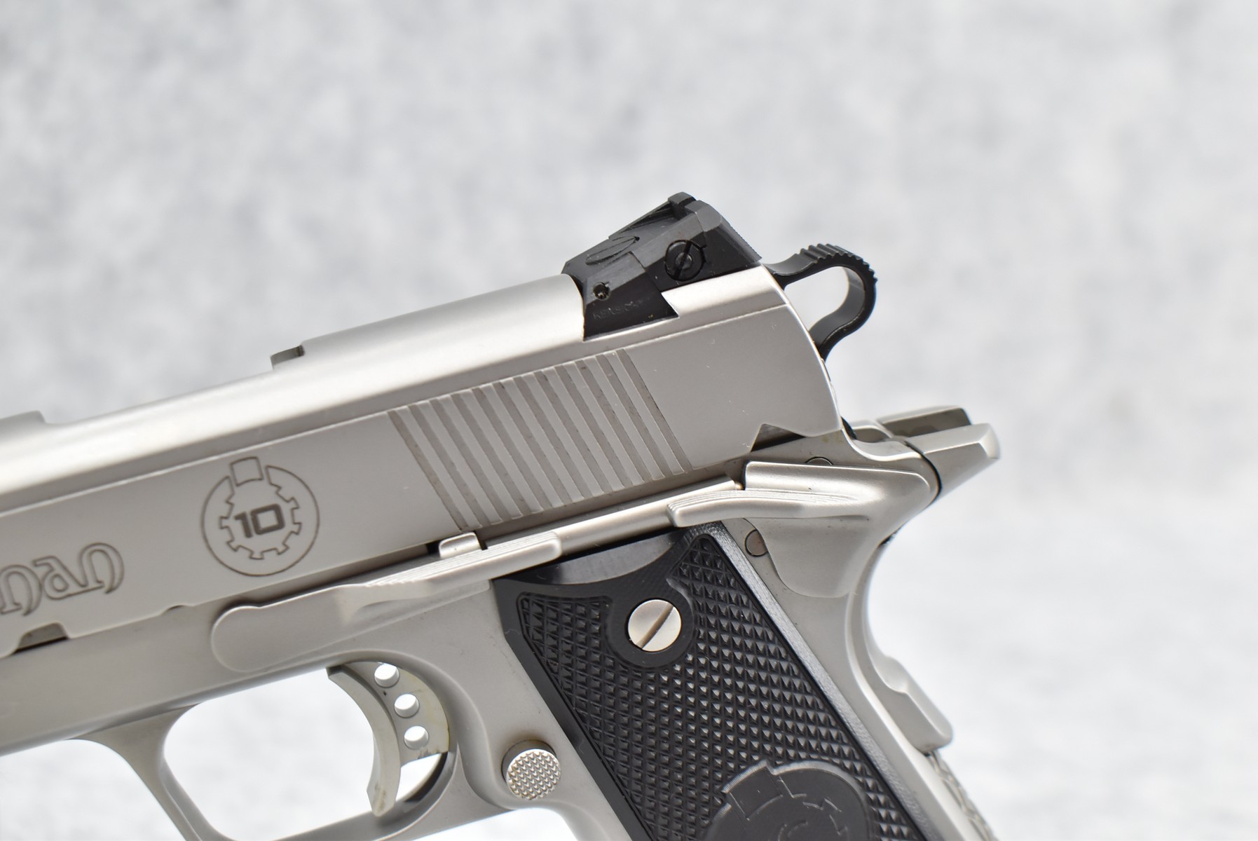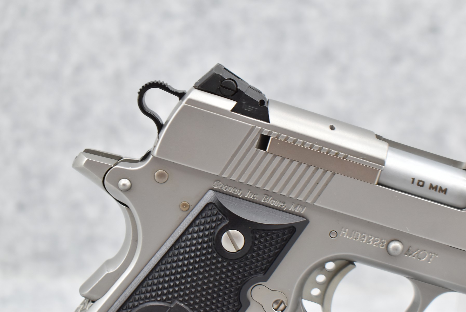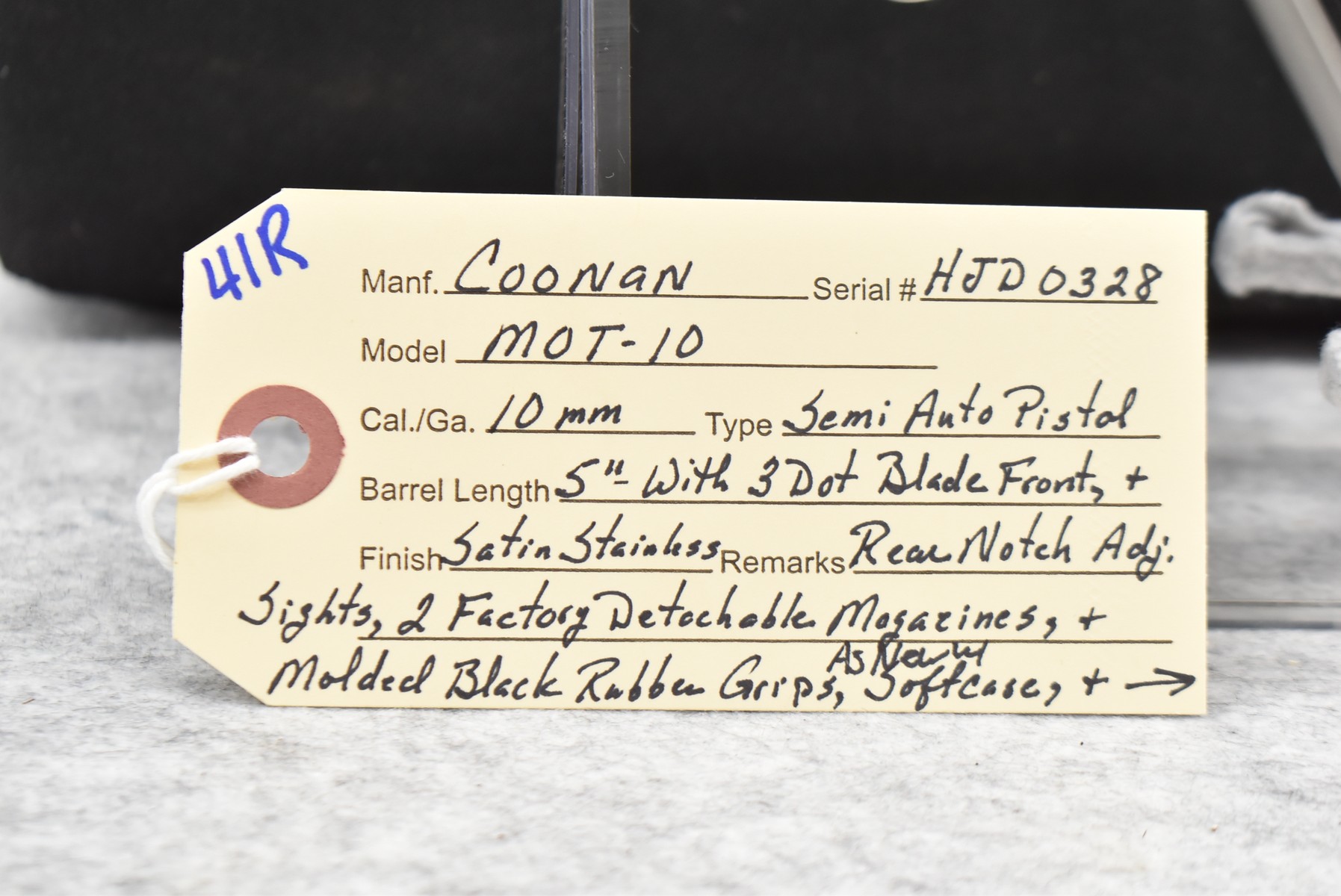 41R. Coonan- Mod. MOT-10 – 10mm Cal. Semi-Auto Pistol – w/5” Barrel – w/3-Dot Blade Front & Rear Notch Adj. Sights – Satin Stainless Finish – w/Molded Black Rubber Grips – w/2 Factory Detachable Magazines – As New w/Soft Case & Accessories