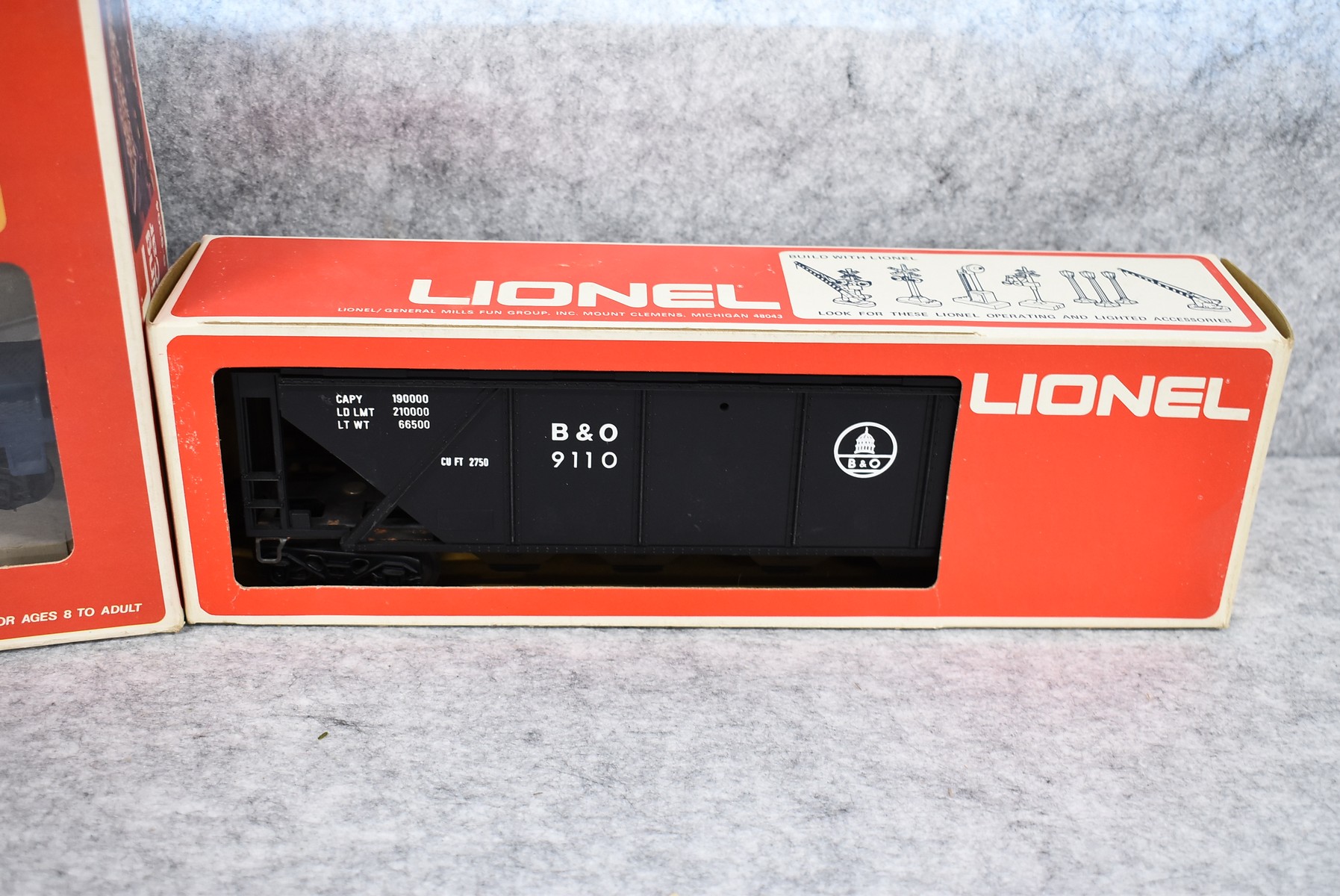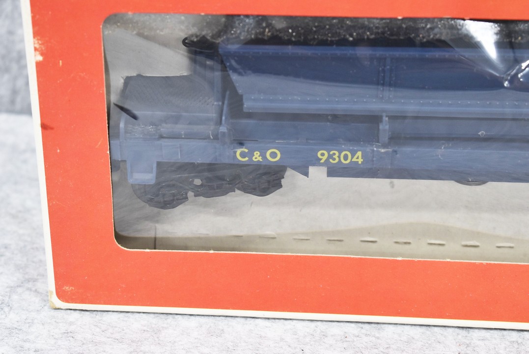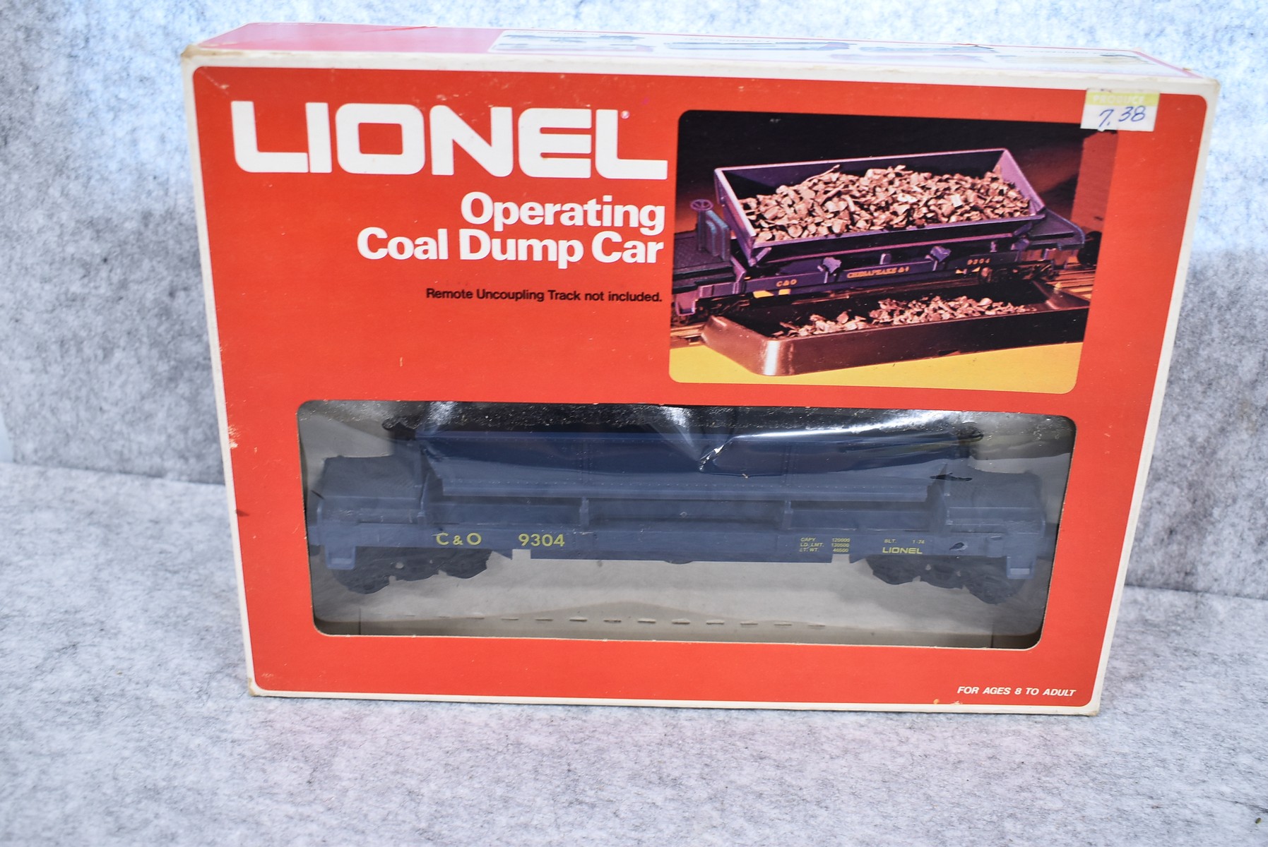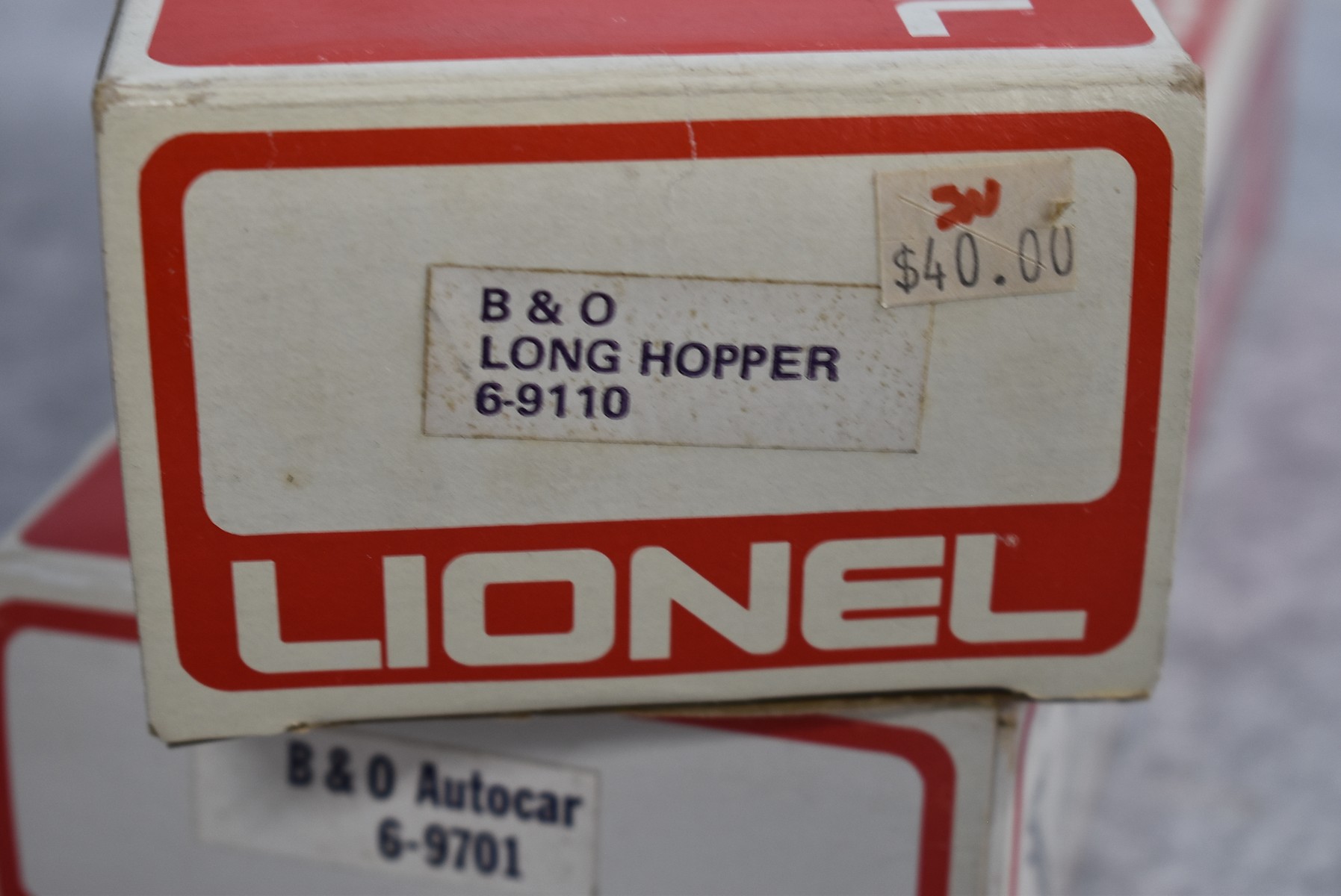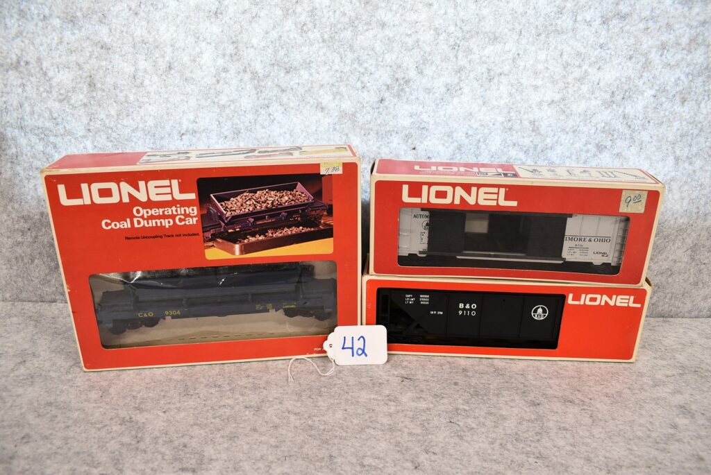 42. Lot of 3 Lionel O gauge train cars including 6-9110 B&O Long Hopper, 6-9701 B&O Auto car, 6-9304 Operating coal dump car, all with boxes