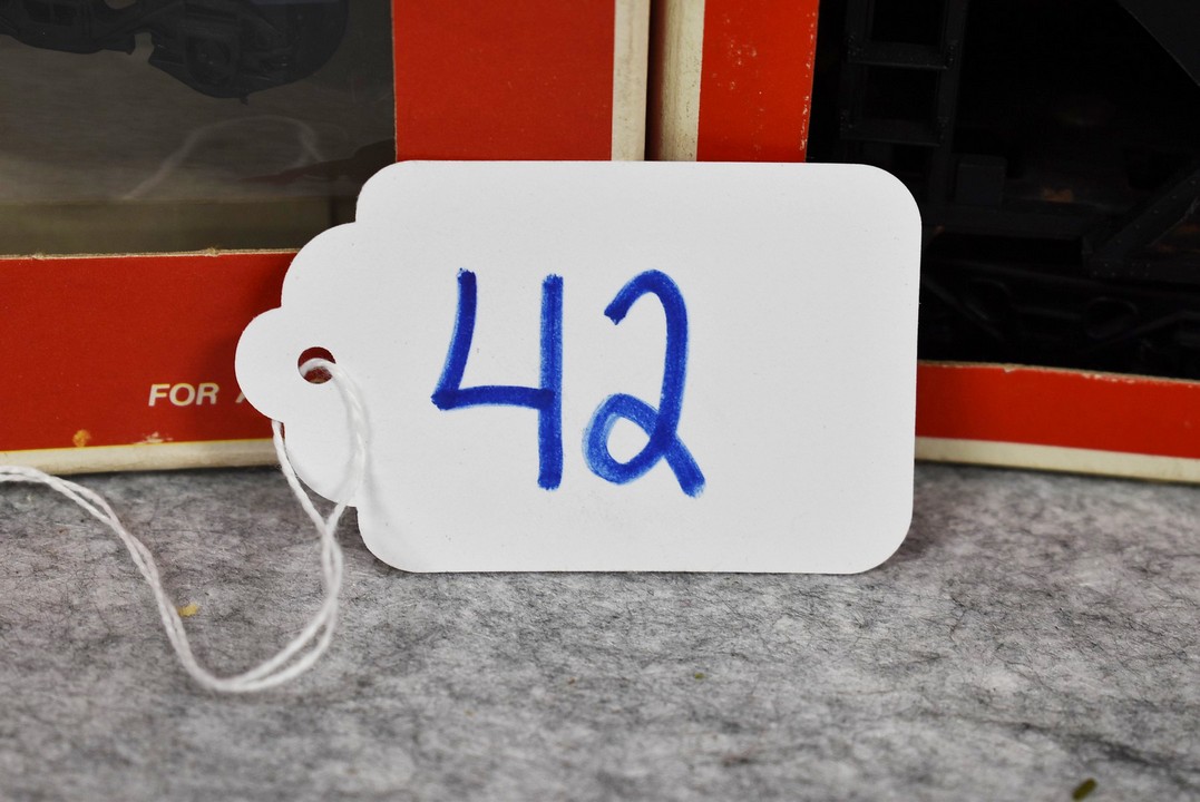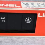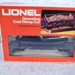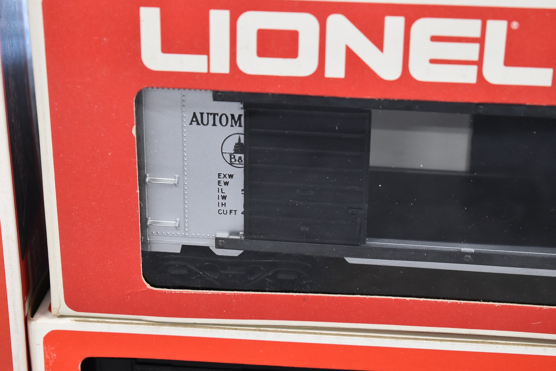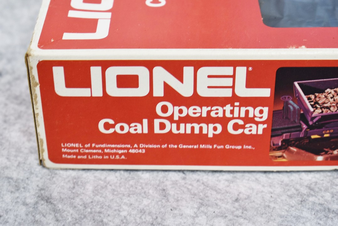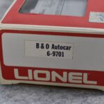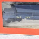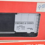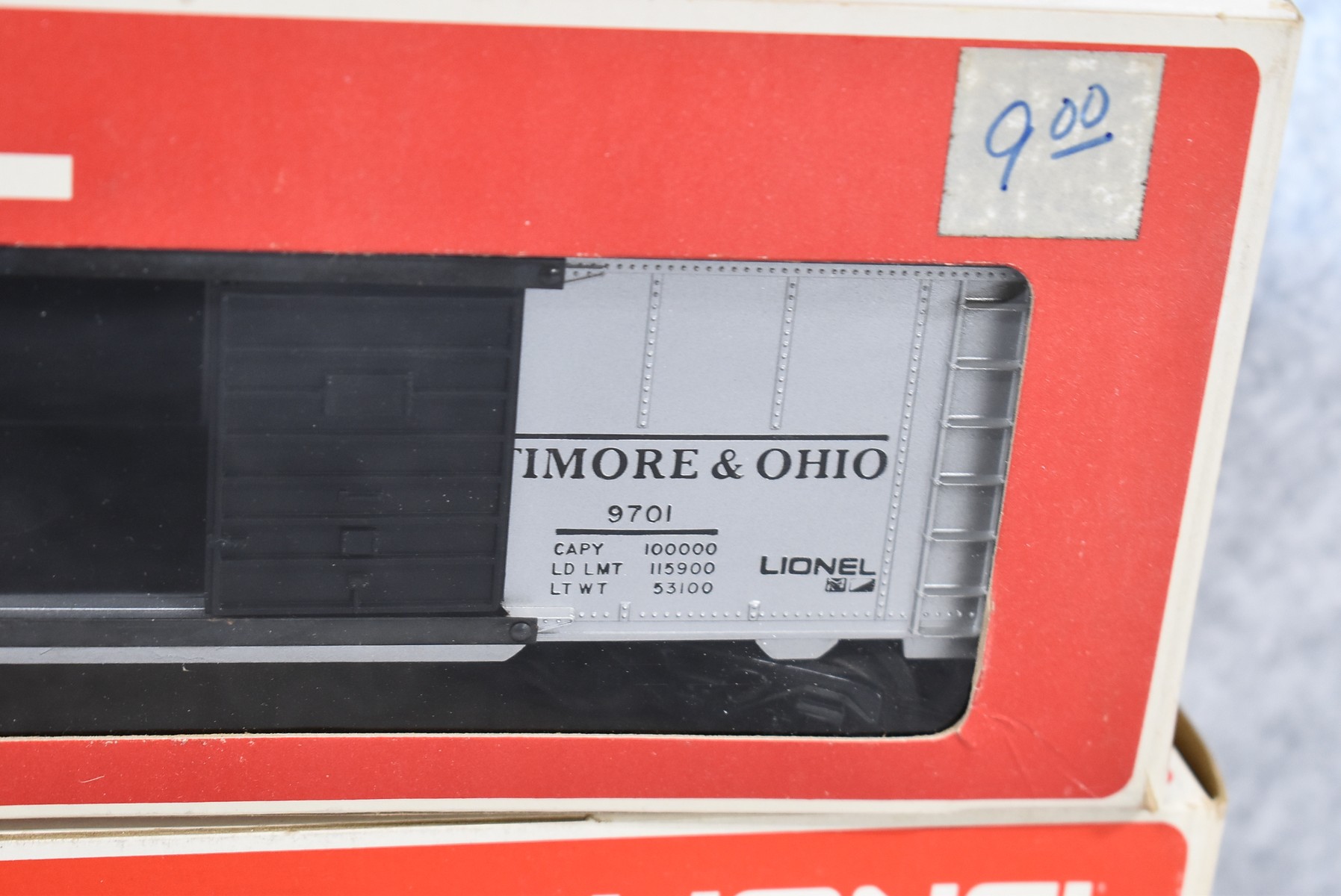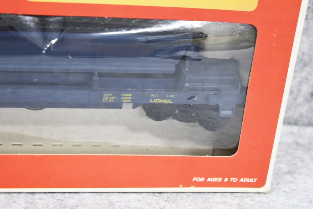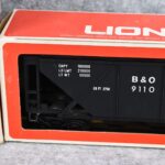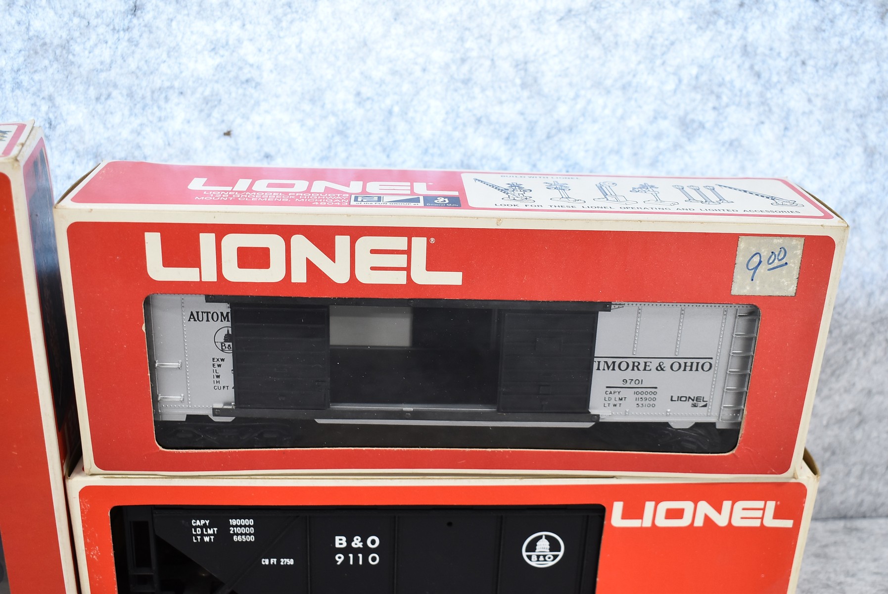 42. Lot of 3 Lionel O gauge train cars including 6-9110 B&O Long Hopper, 6-9701 B&O Auto car, 6-9304 Operating coal dump car, all with boxes