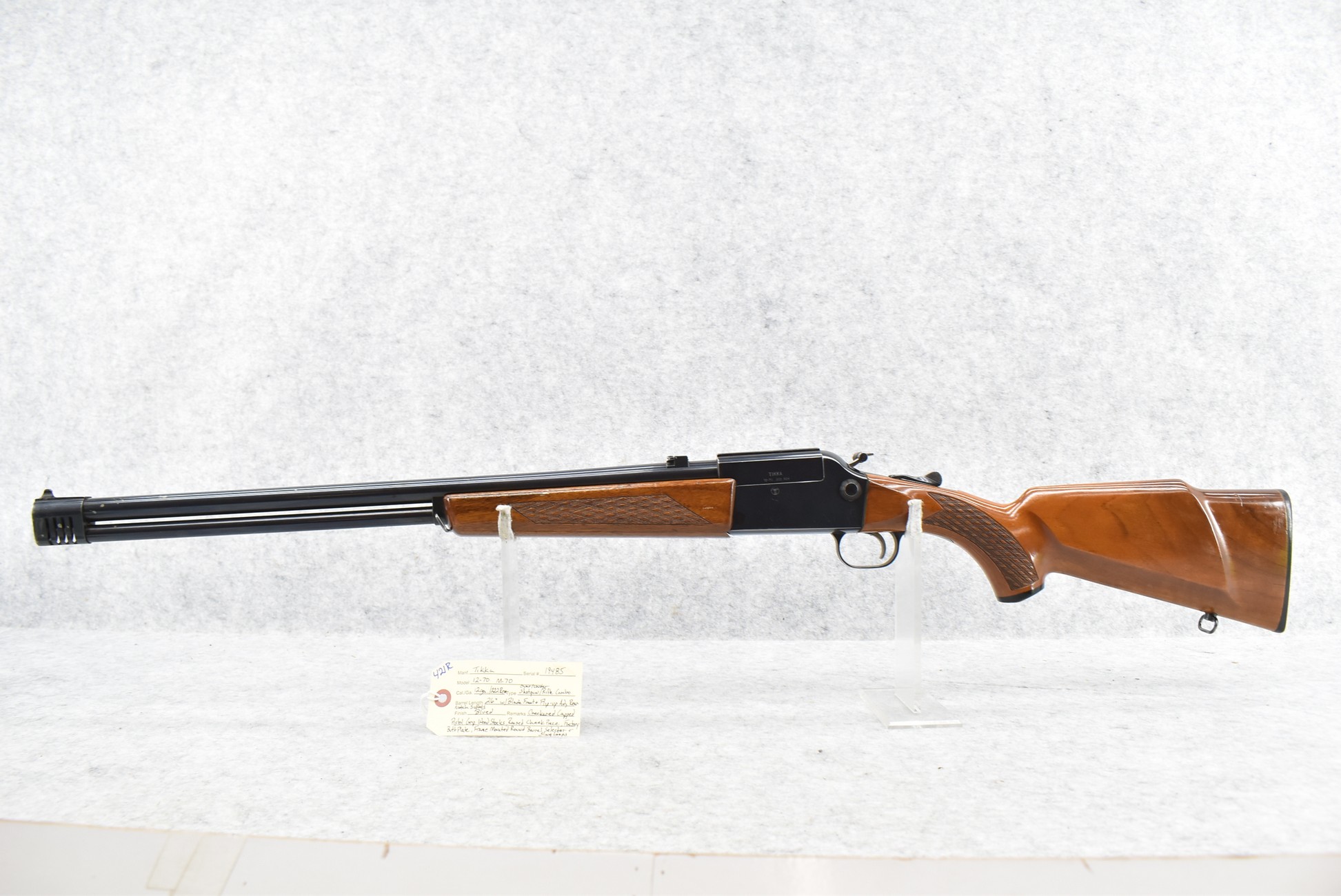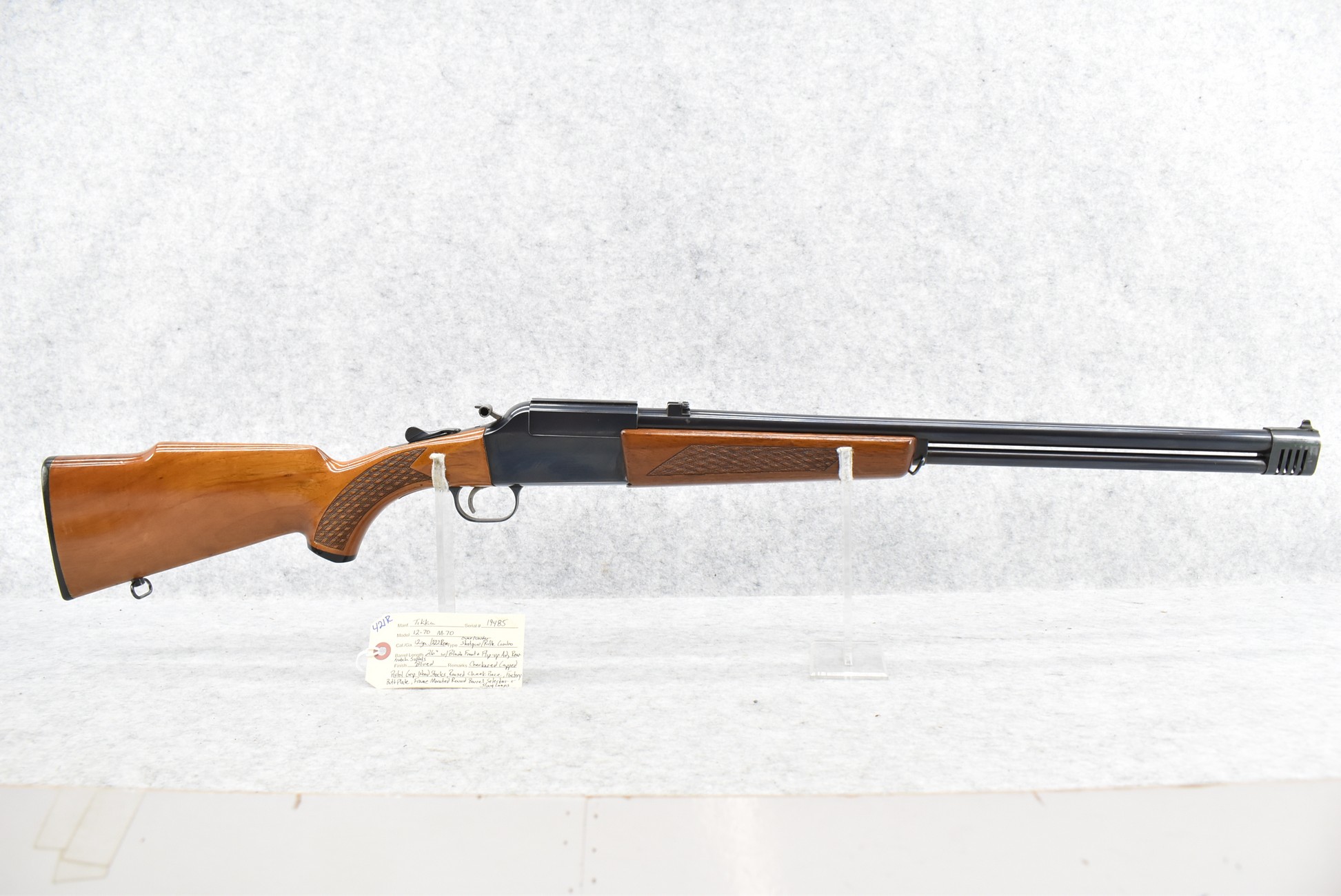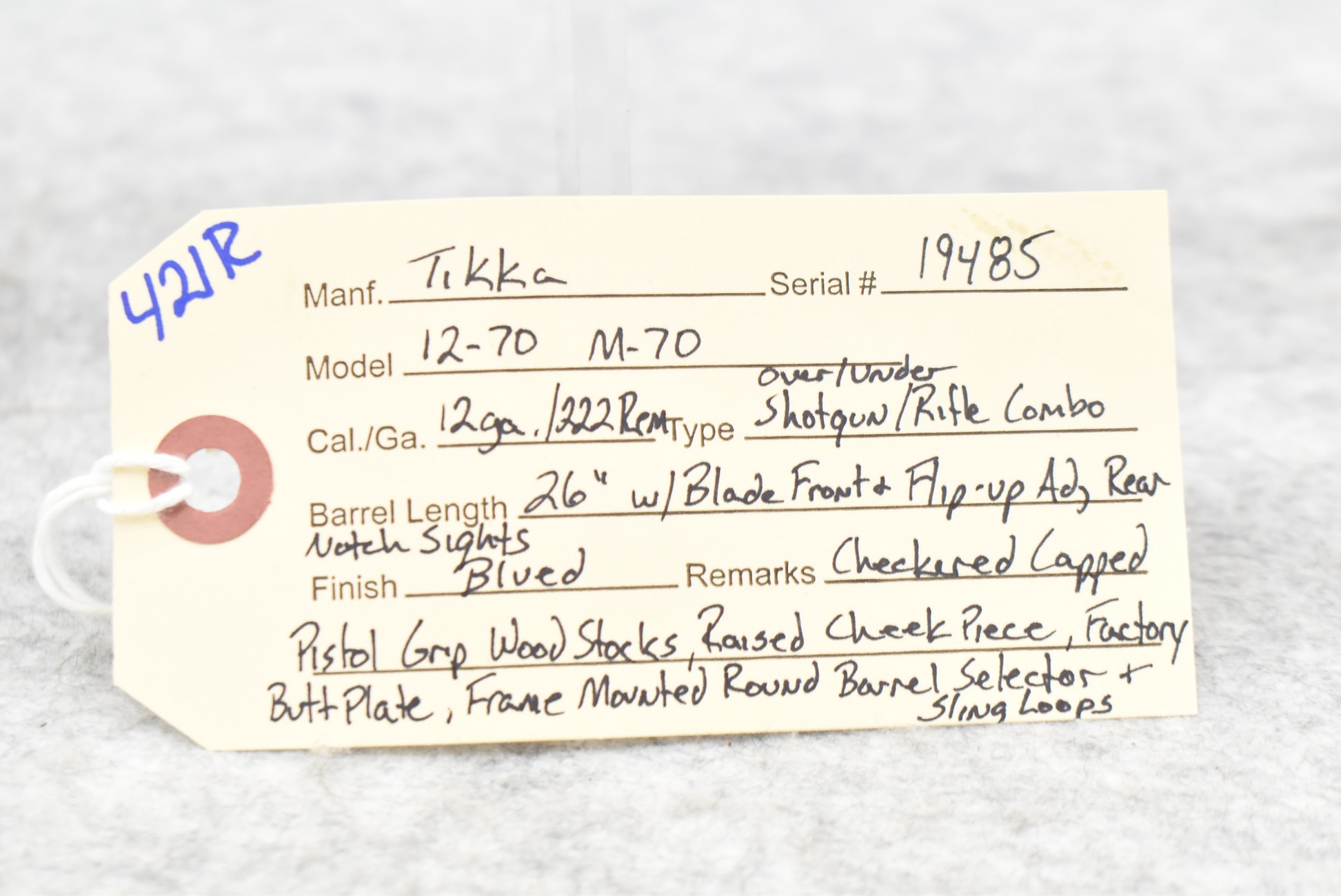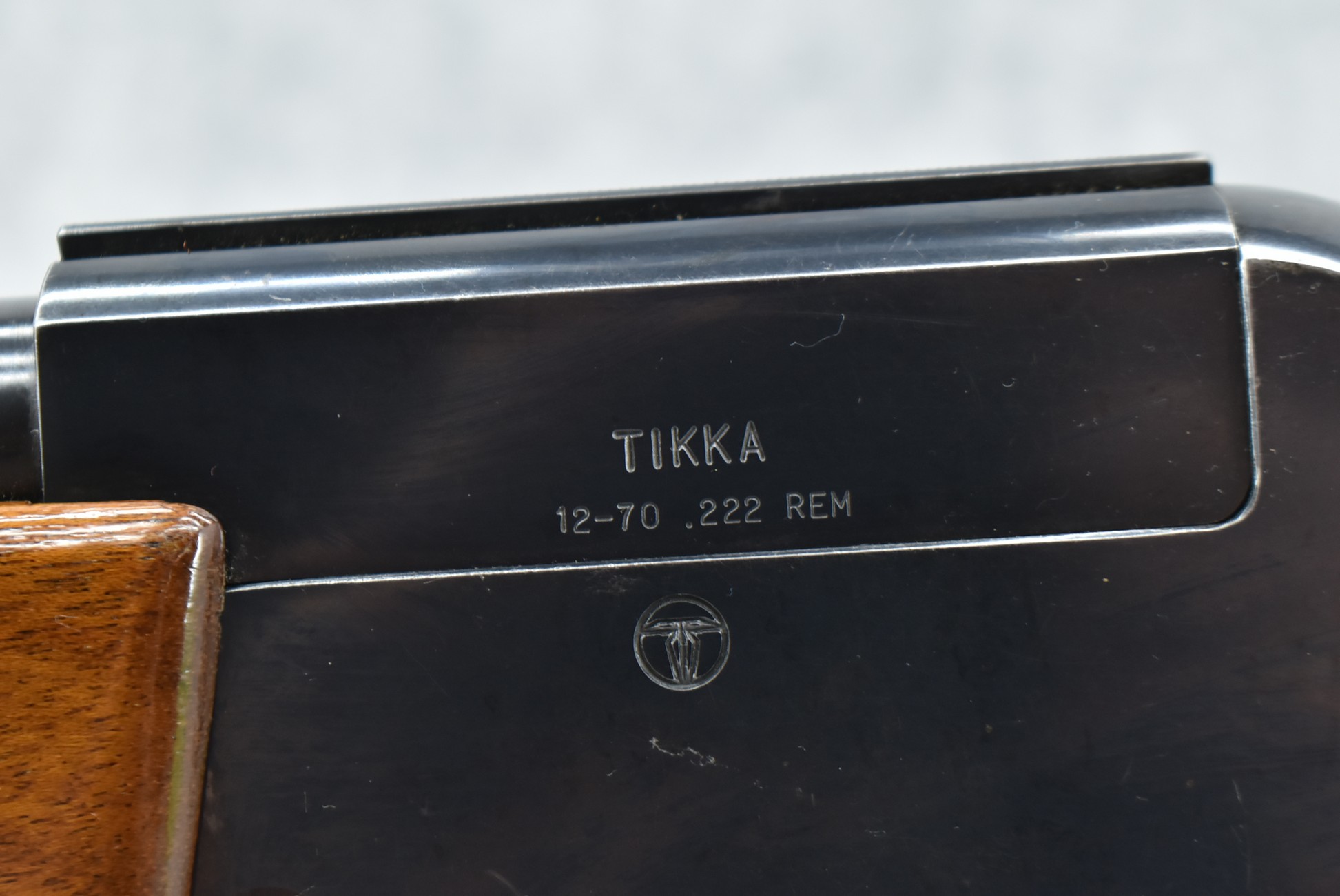 421R. Tikka – Mod. 12-70 – 12ga. Over 222 Rem. Cal. Shotgun/Rifle Over-Under Combo – w/26” Barrels w/Blade Front & Flip Up Adj. Rear Notch Sights – Blued Finish – w/Checkered Capped Pistol Grip Wood Stocks w/Raised Cheek Piece w/Factory Butt Plate – w/Frame Mounted Round Barrel Selector – w/Sling Loops