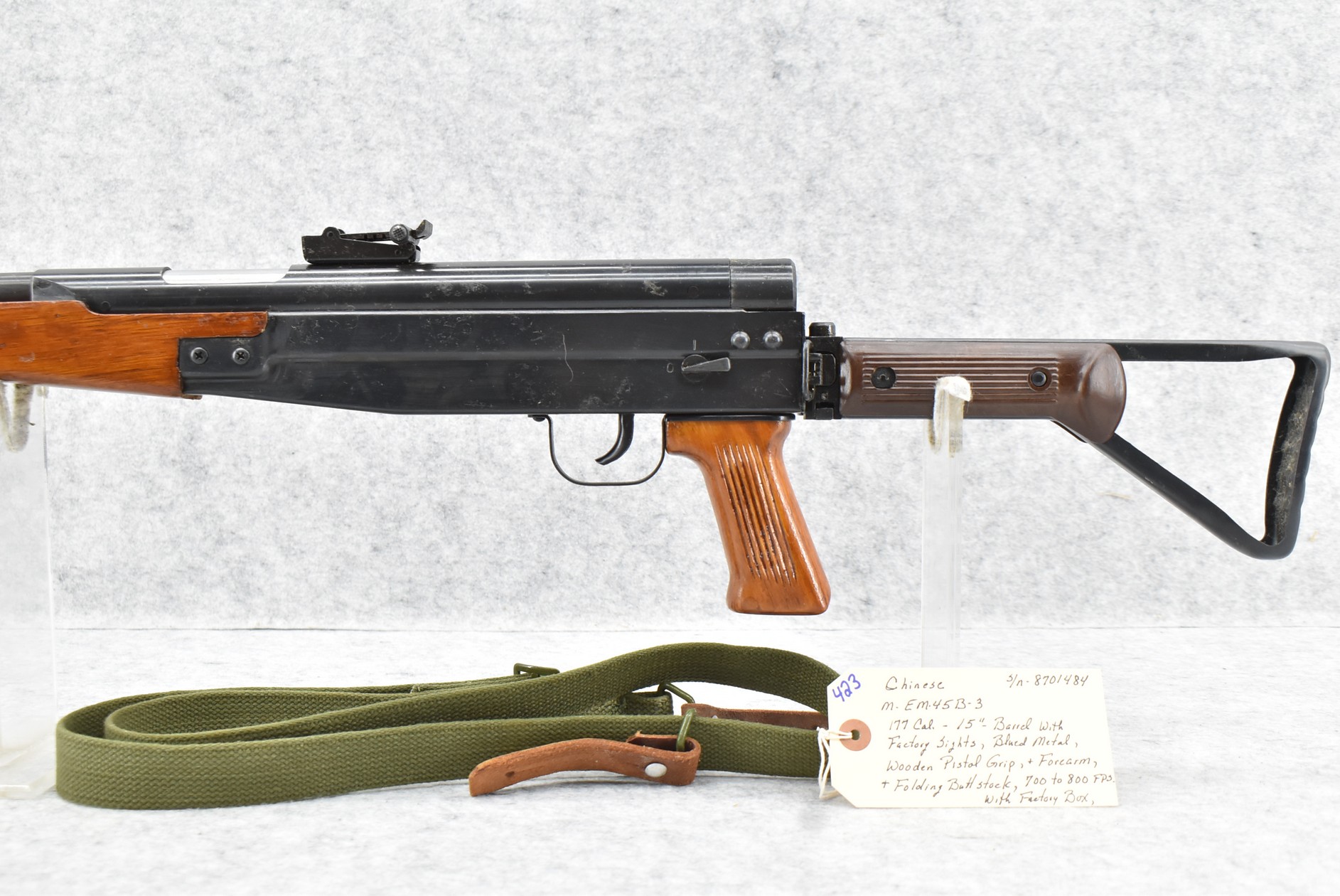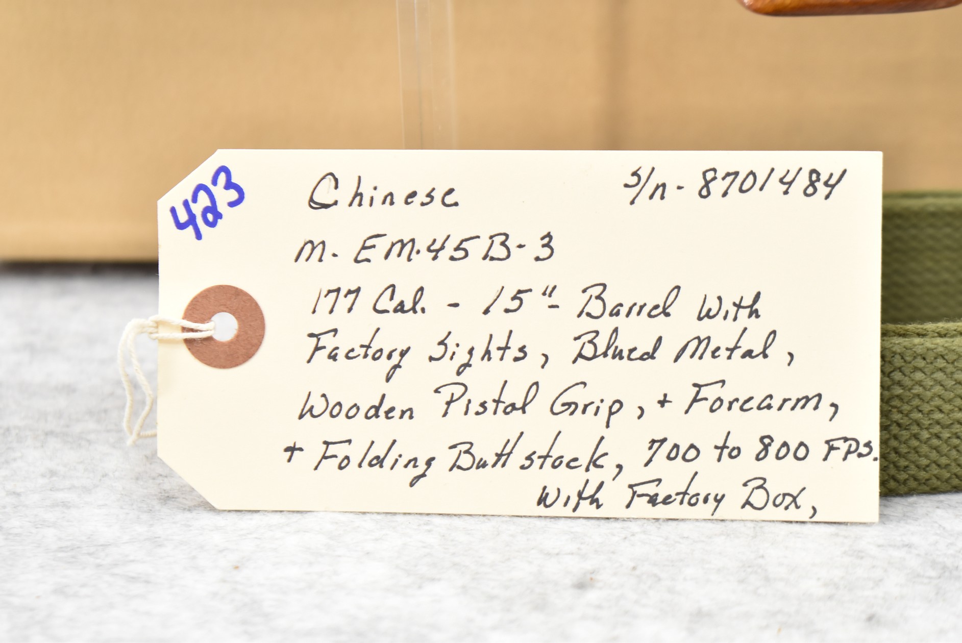 423. Chinese – Mod. EM-45B-3 – .177 Cal. 700-800 FPS Air Rifle – w/15” Barrel w/Factory Sights – Blued Finish – w/Wooden Pistol Grip & Forearm w/Folding Butt Stock – Appears New w/Factory Box