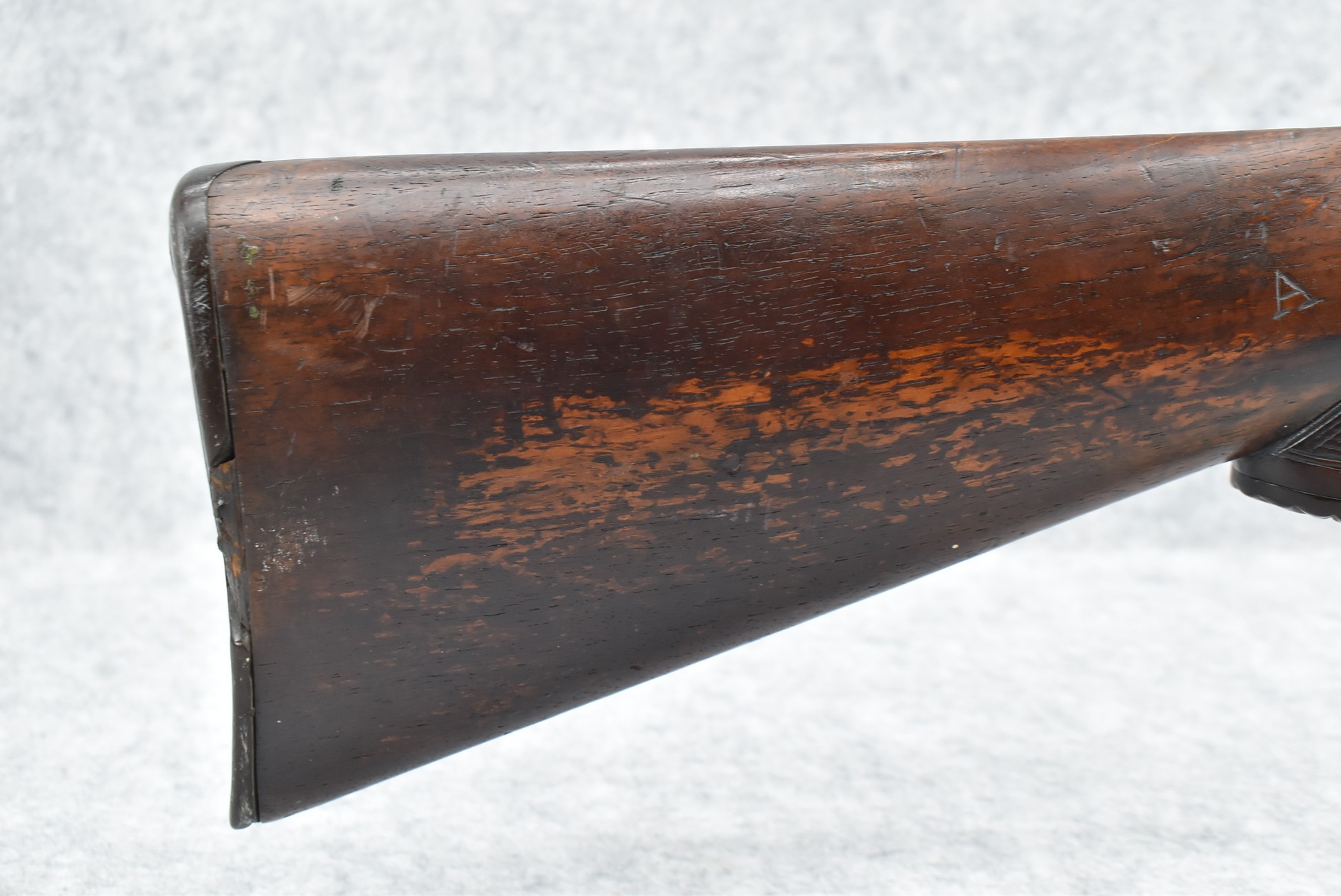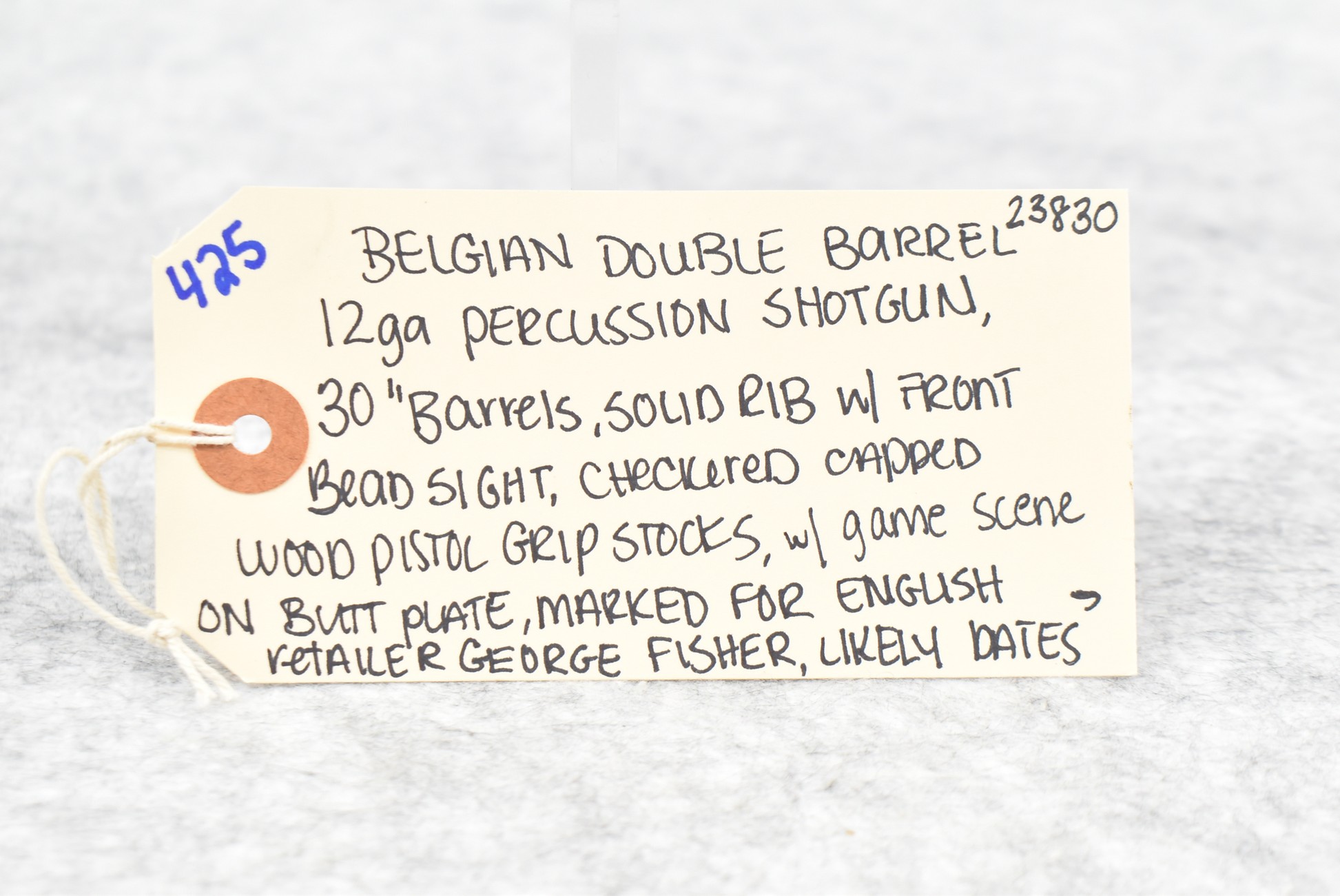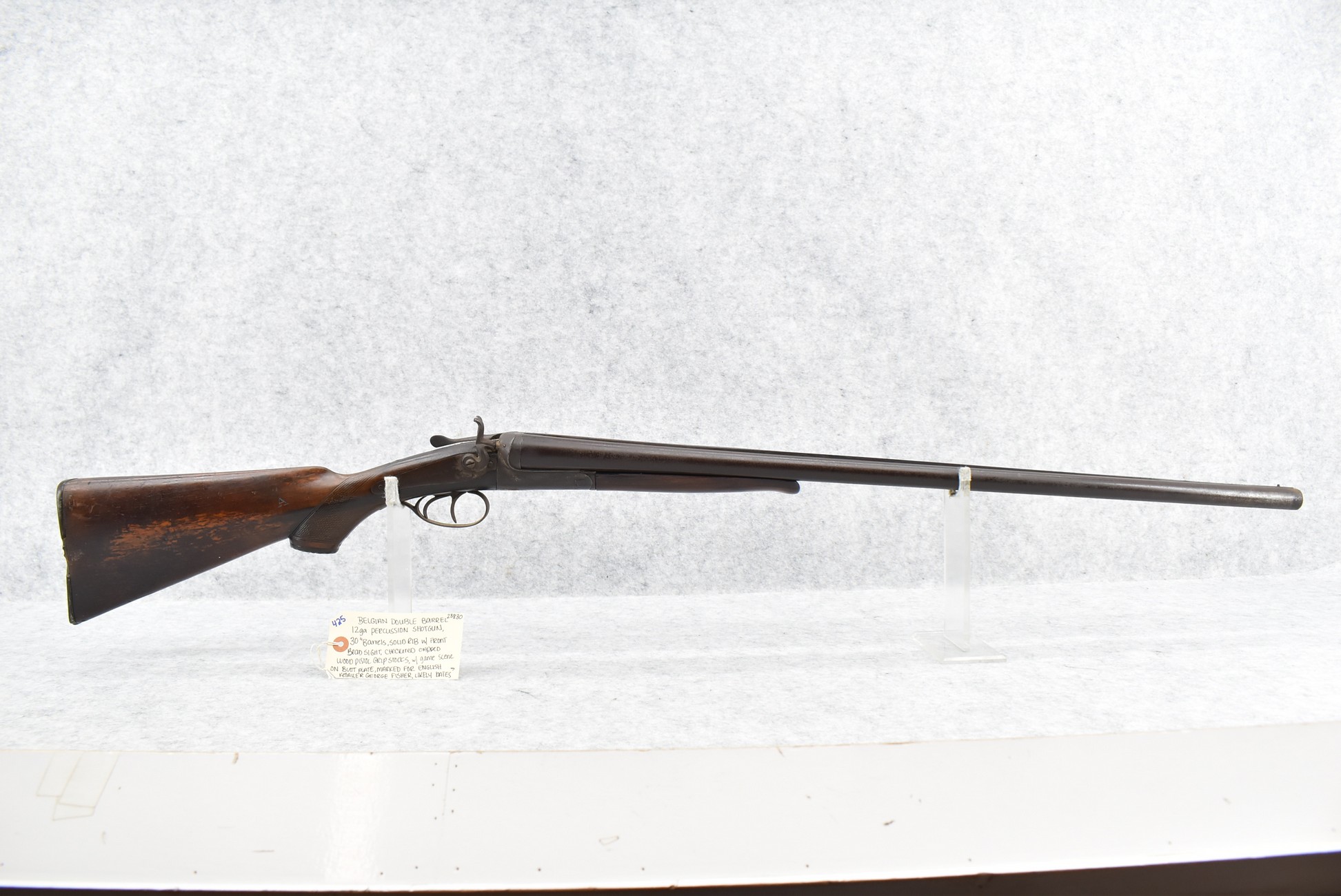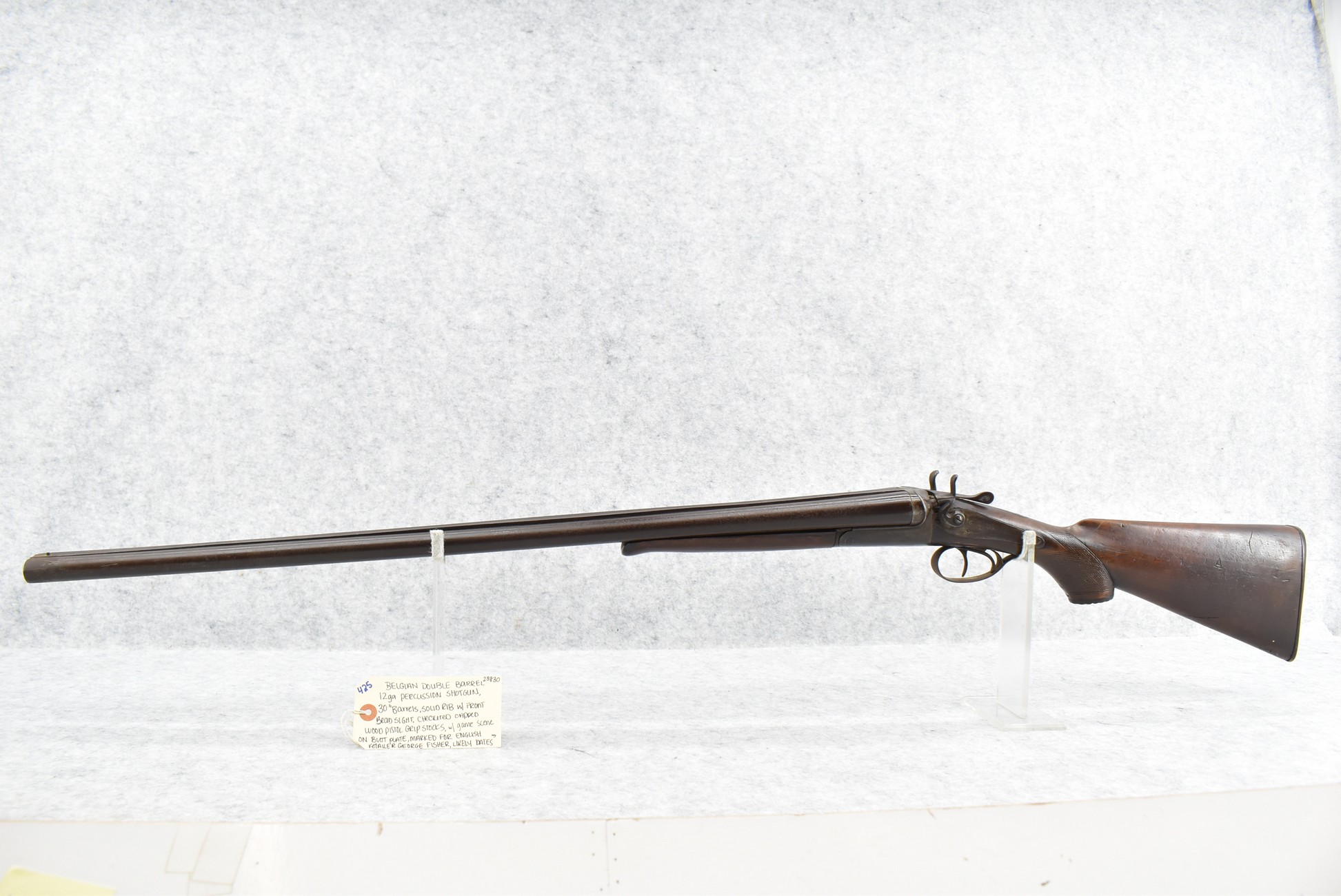 425. Belgian – 12ga. Percussion Double Barrel Shotgun – w/30” Solid Rib Barrels w/Front Bead Sight – w/Checkered Capped Wood Pistol Grip Stocks w/Game Scene on Butt Plate – Marked for English Retailer George Fisher