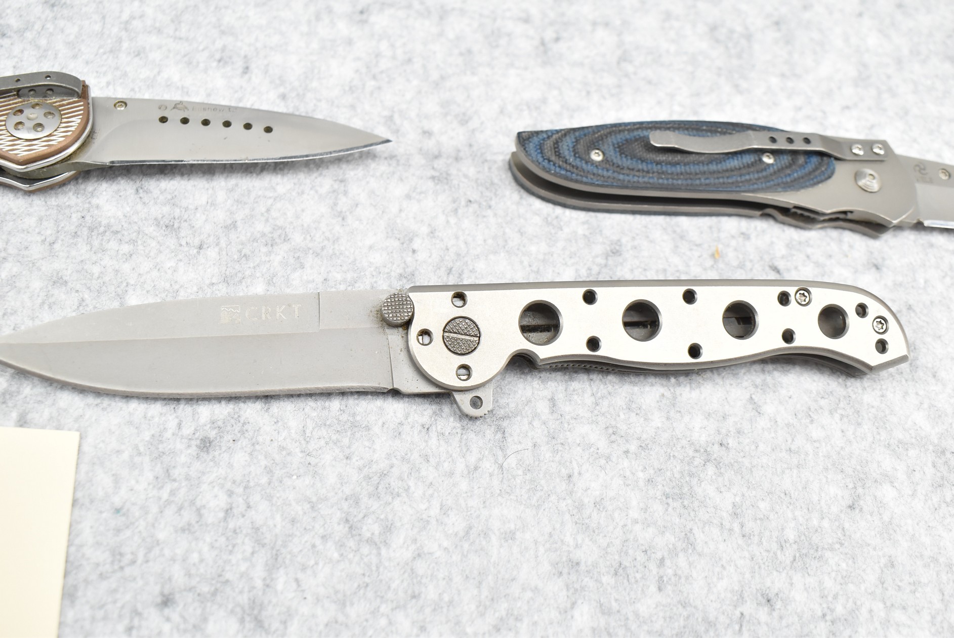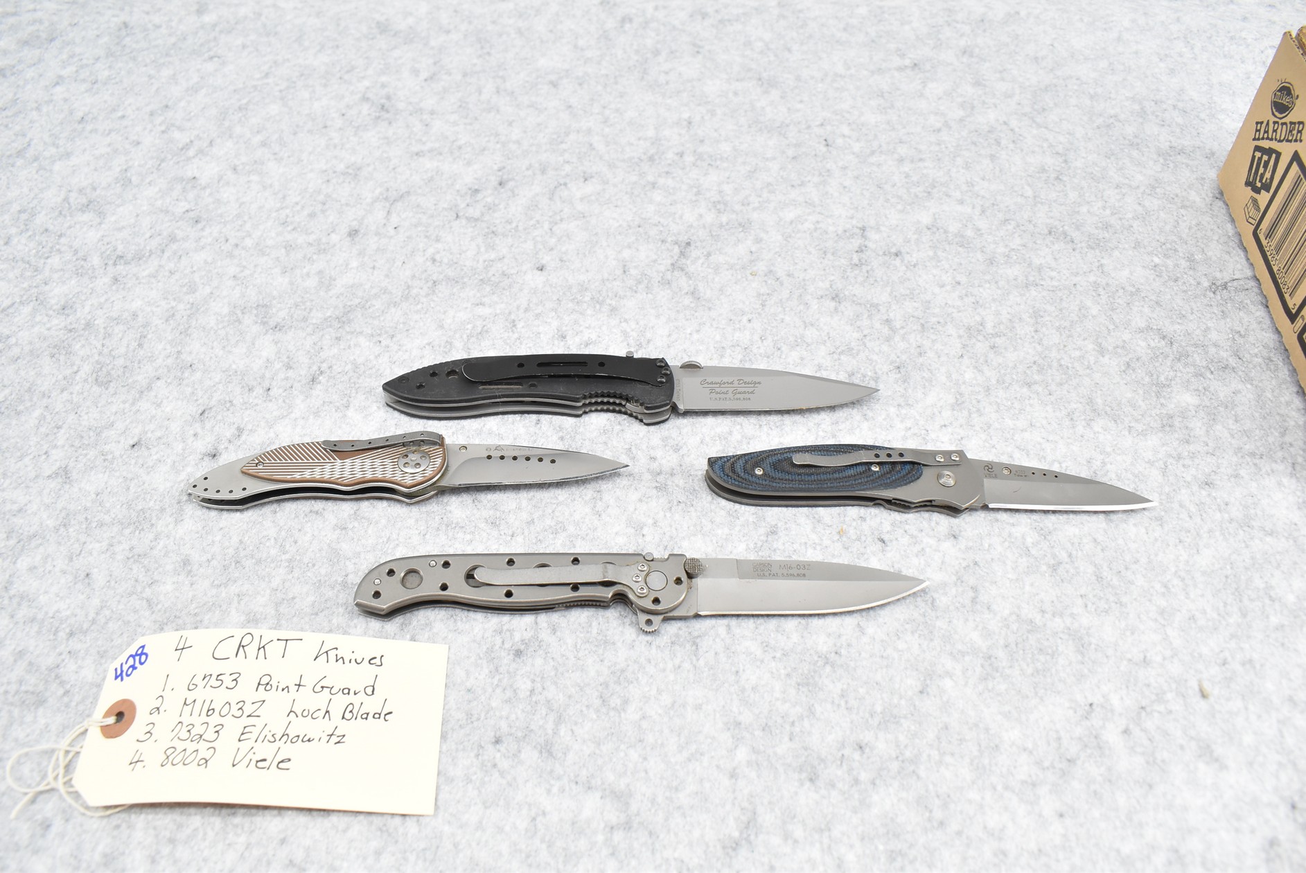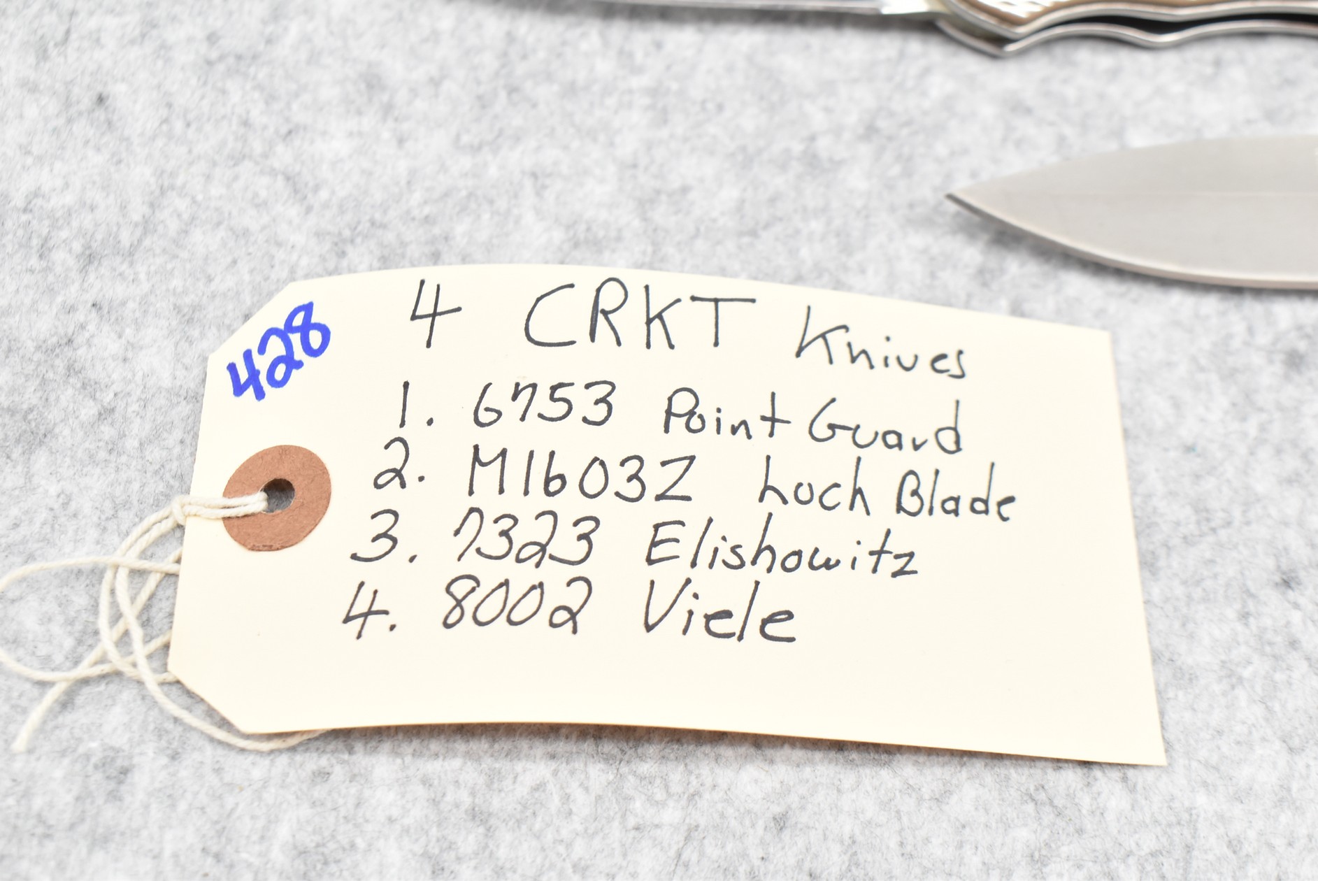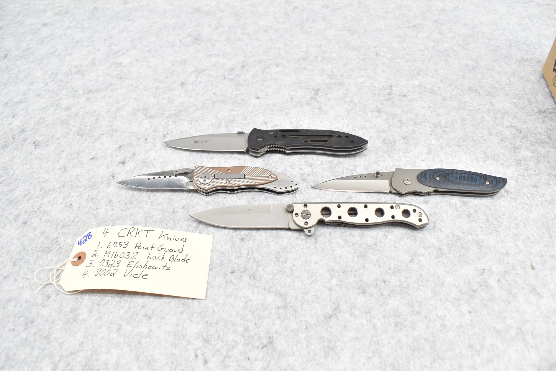 428. Lot of 4 C.R.K.T. Folding Knives: 1) #6753 Point Guard. 2) #M1603Z Lock Blade. 3) #7323 Elishowitz. 4) #8002 Viele