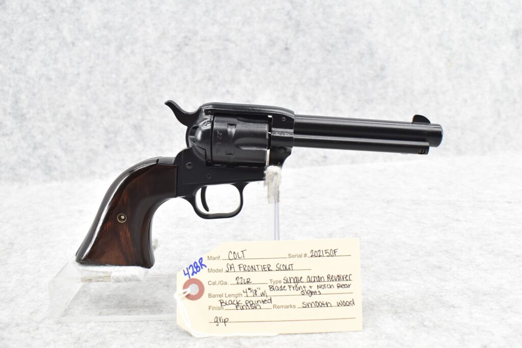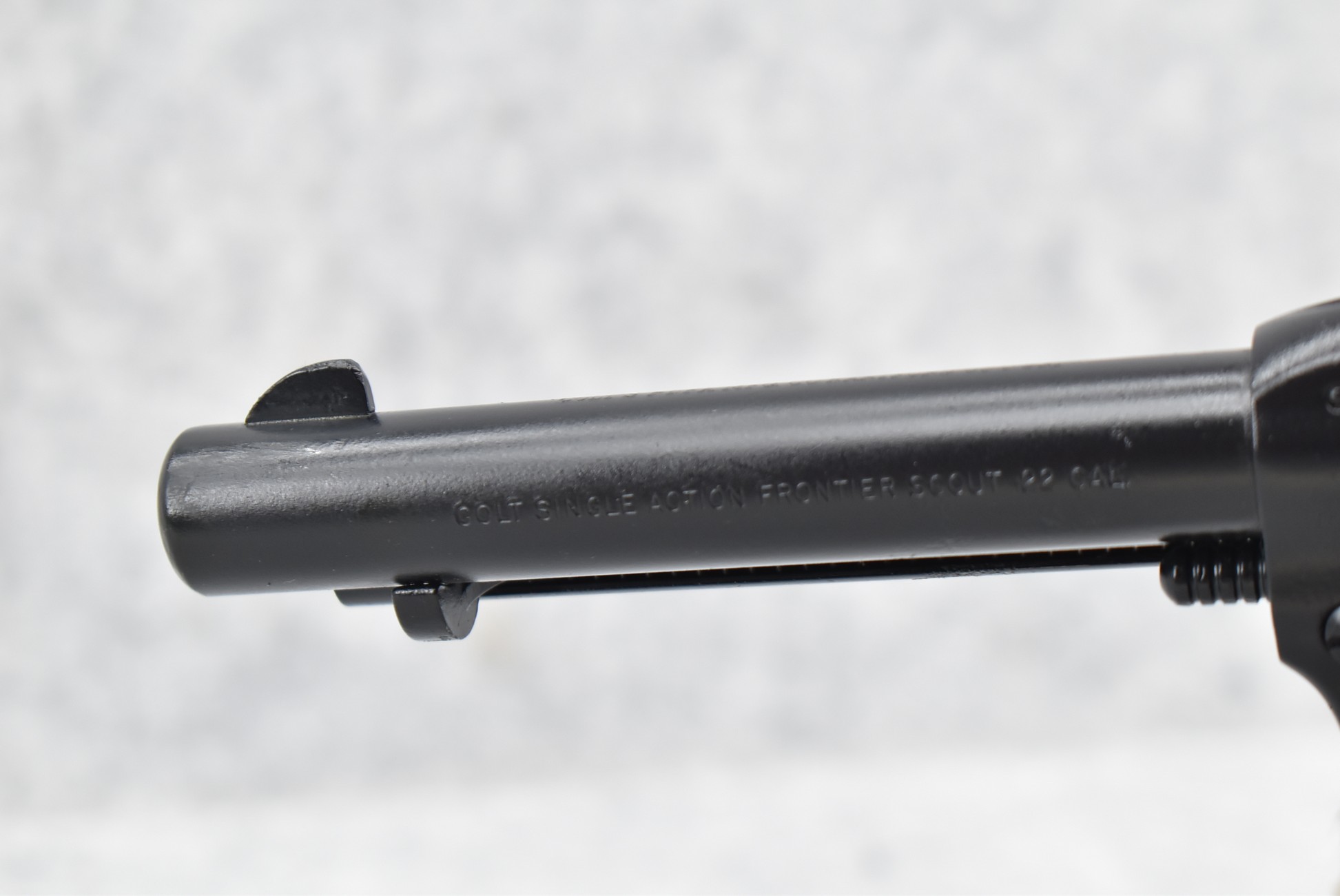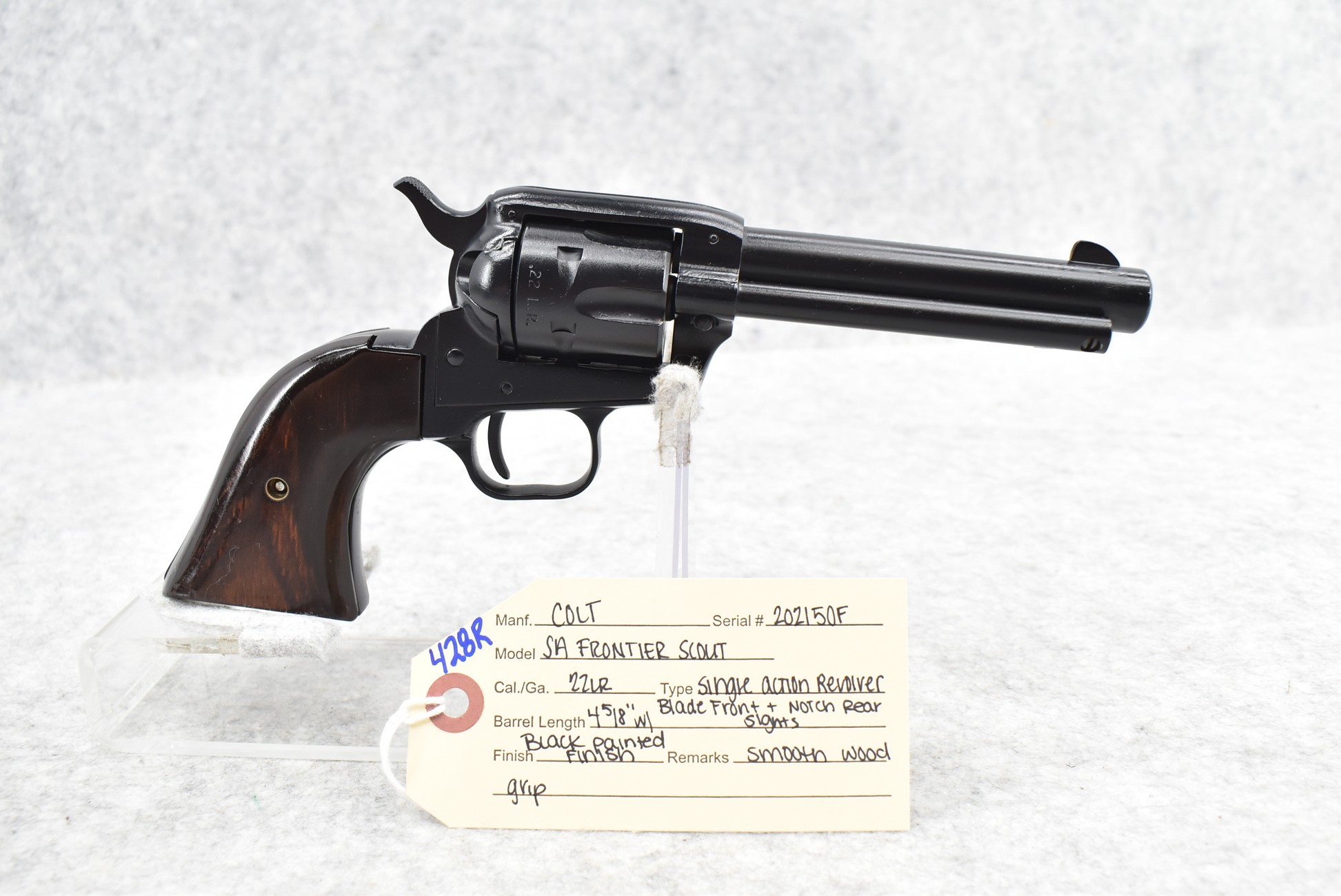 428R. Colt – Mod. Frontier Scout – 22LR Cal. Single Action Revolver – w/4 5/8” Barrel w/Blade Front & Notch Rear Sights – Black Painted Finish – w/Smooth Wood Grip