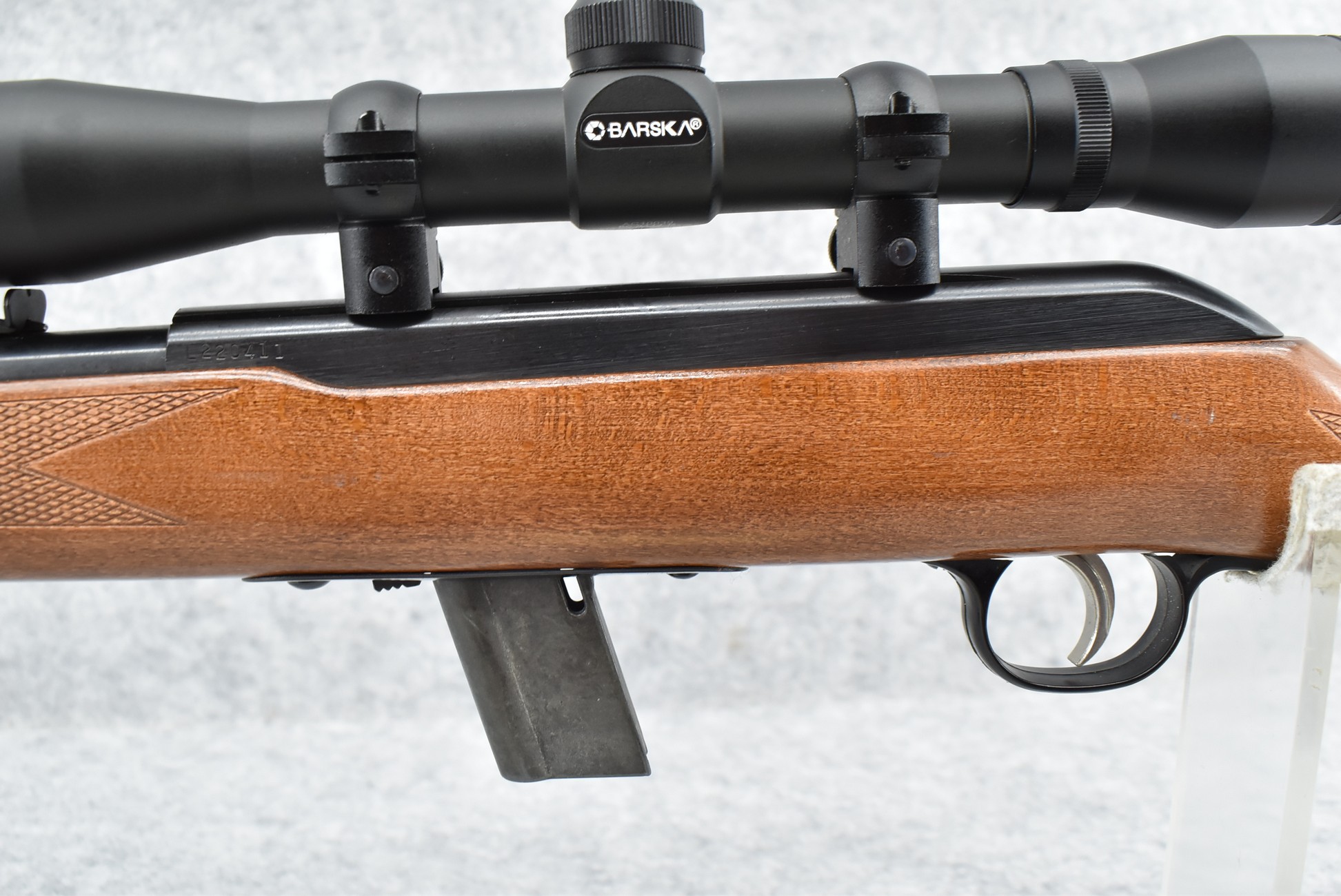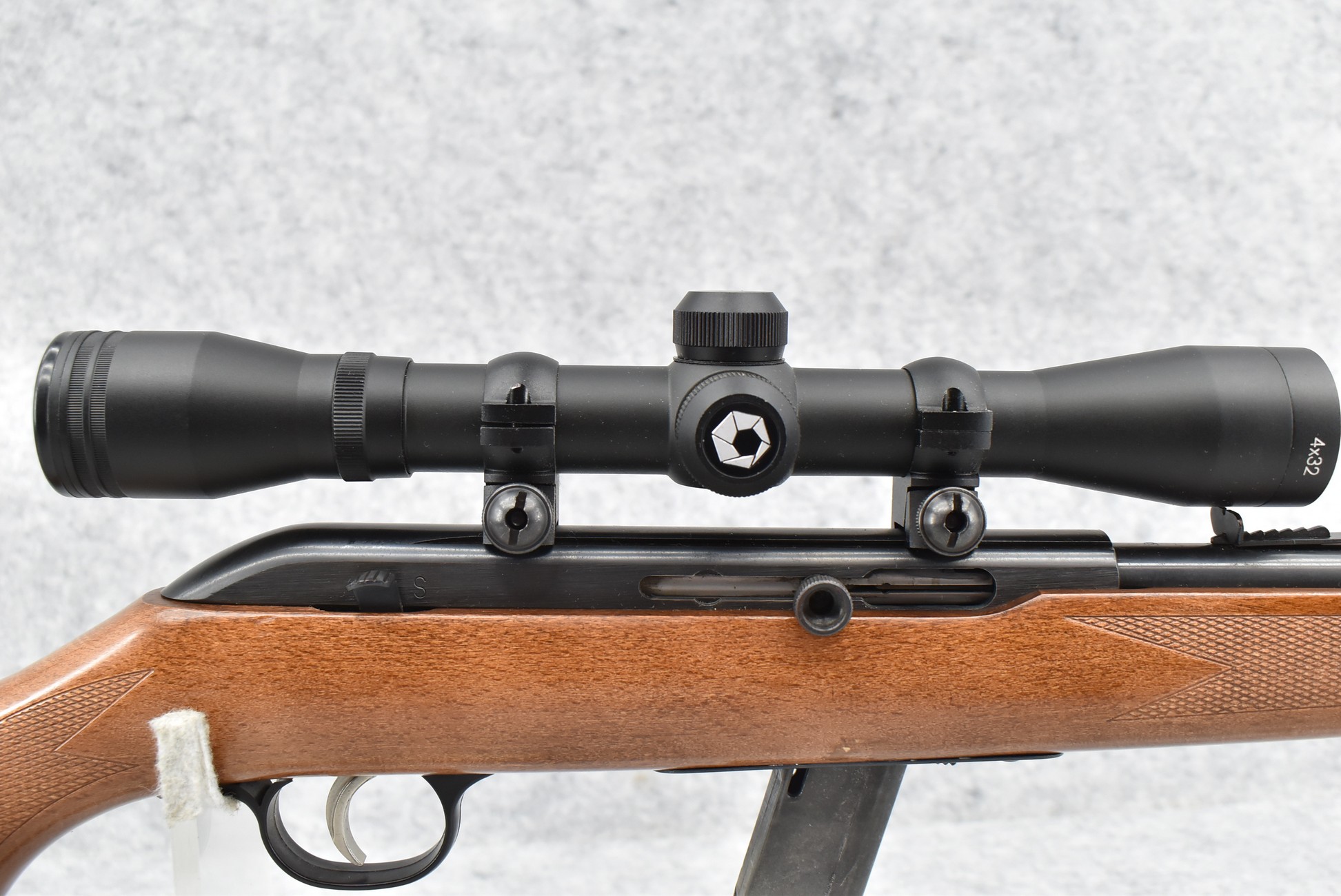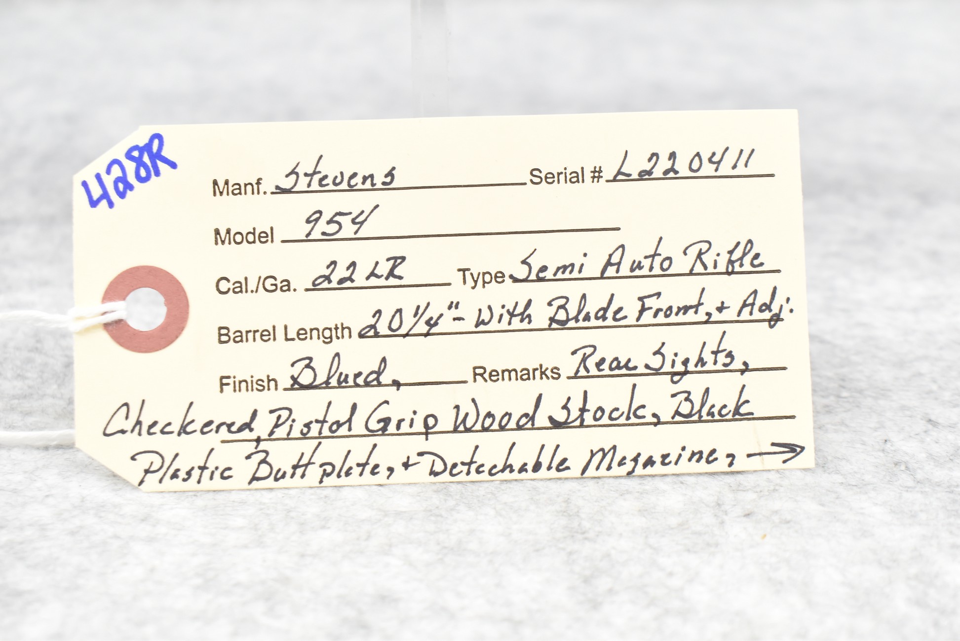 428R. Stevens – Mod. 954 – 22LR Cal. Semi-Auto Rifle – w/20 ¼” Barrel w/Blade Front & Adj. Rear Sights – Blued Finish – w/Checkered Pistol Grip Wood Stock w/Butt Plate – w/Detachable Magazine – w/Barska 4x32mm Scope, Rings & Mounts