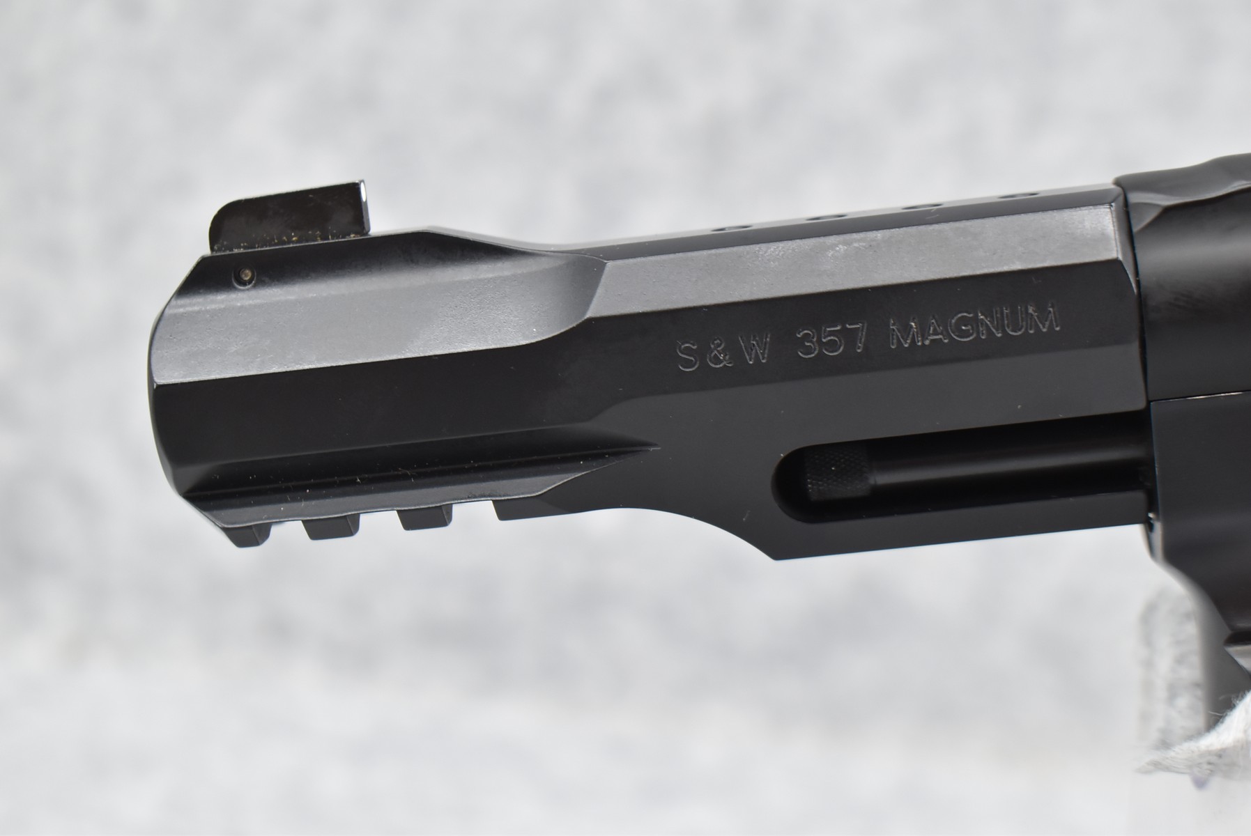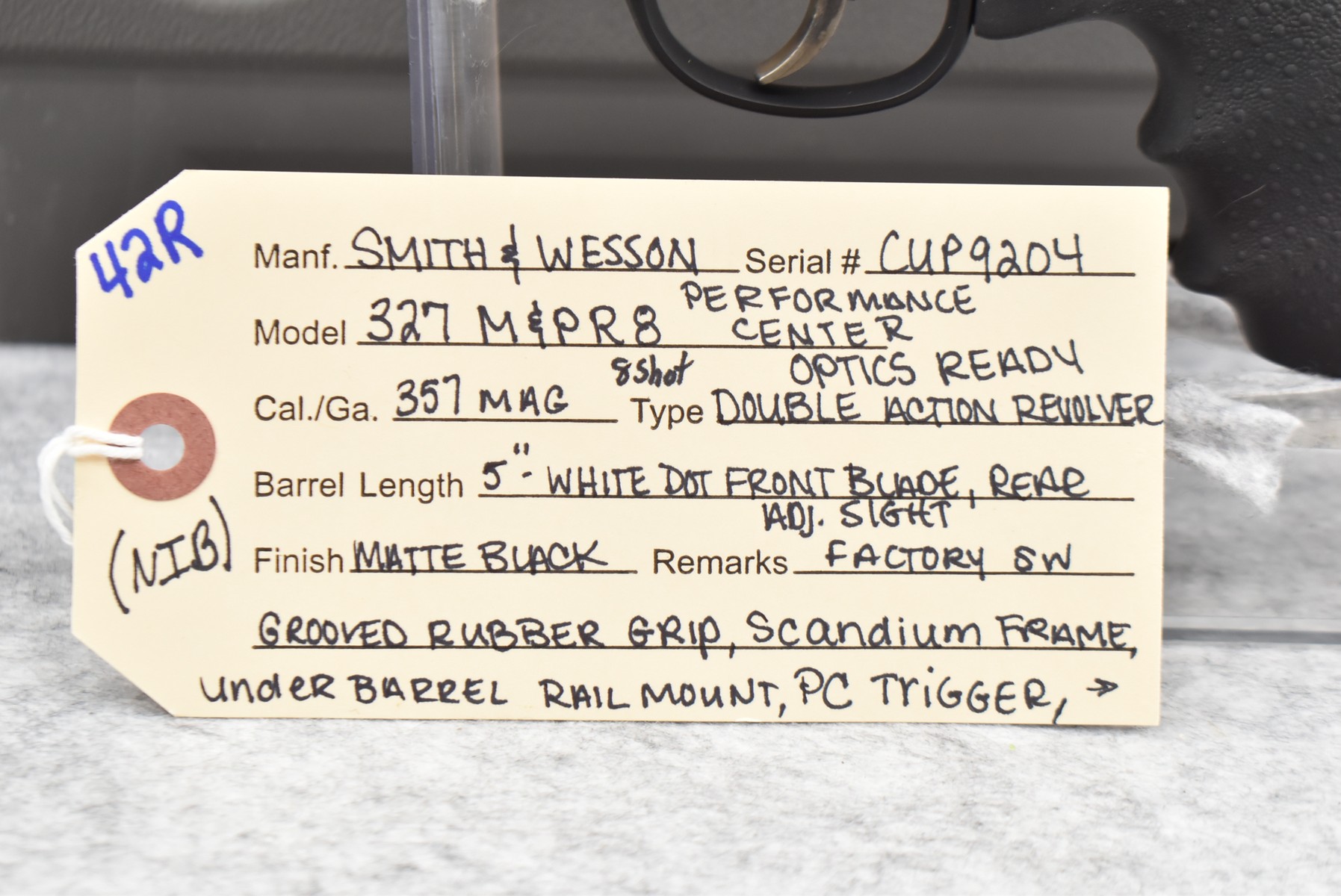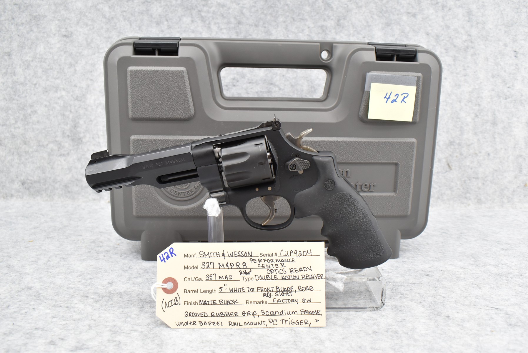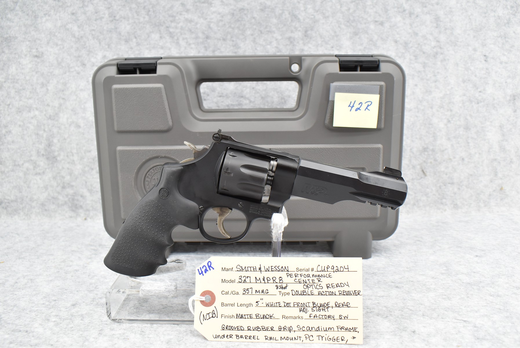 42R. Smith & Wesson – Mod. 327 Performance Center – 357 Mag. Cal. Double Action 8-Shot Revolver – w/5” Barrel w/White Dot Front Blade & Rear Adj. Sights – Matte Black Finish – w/Scandium Frame – w/Factory S&W Grooved Rubber Grip – w/Under Barrel Rail Mount – New w/Factory Hard Case, Moon Clips, Picatinny Rail Mount, Manual & Lock