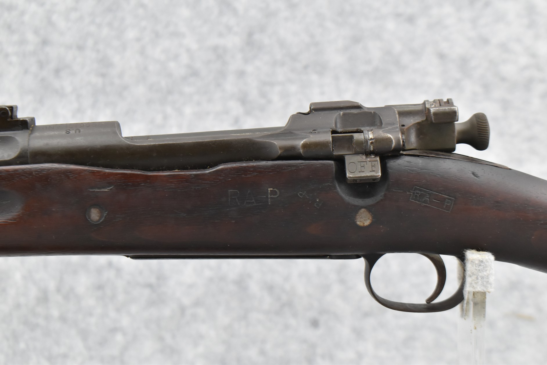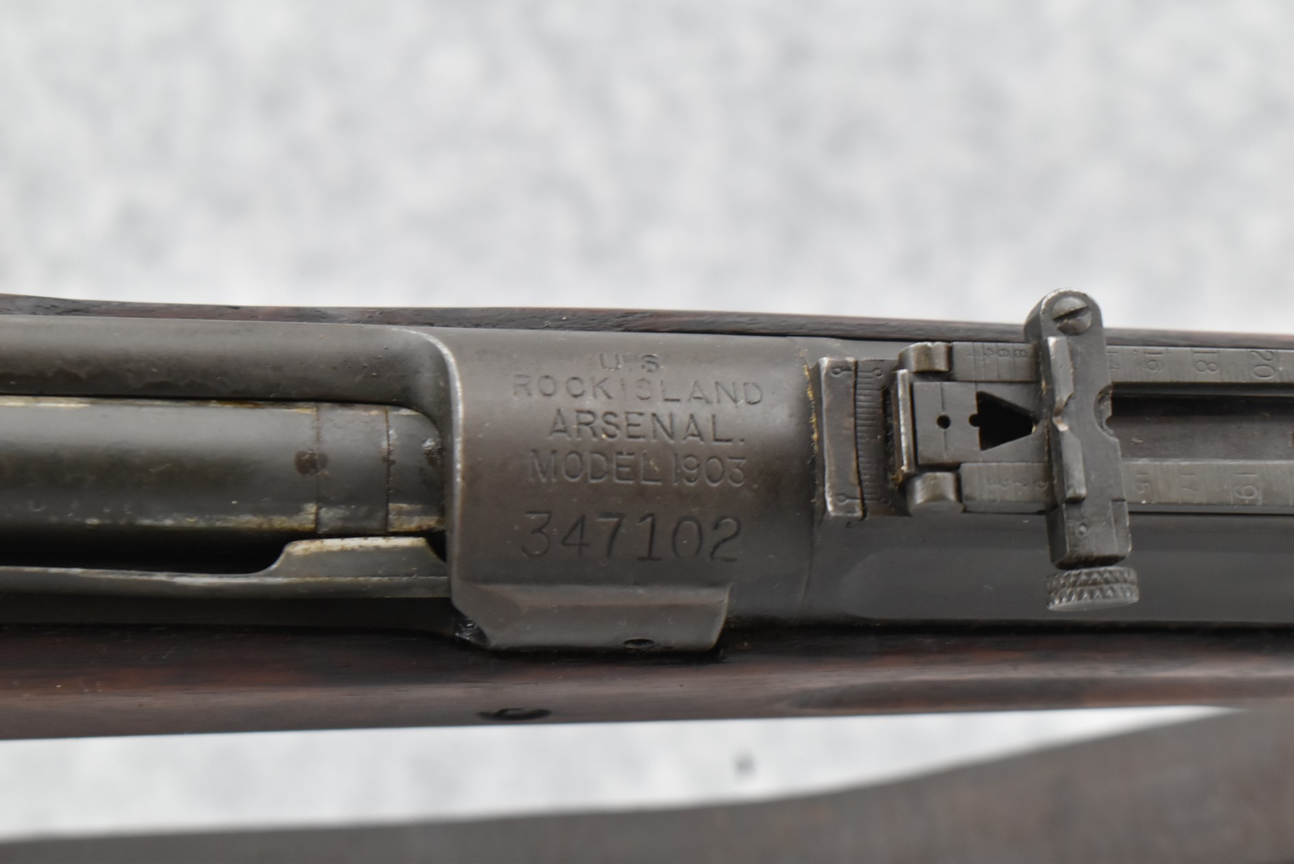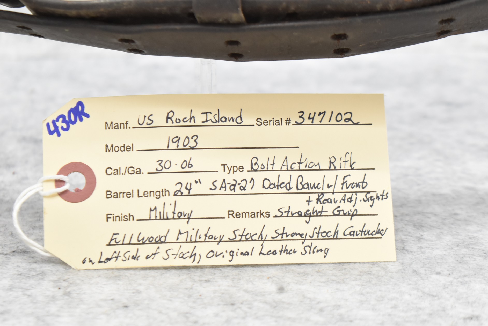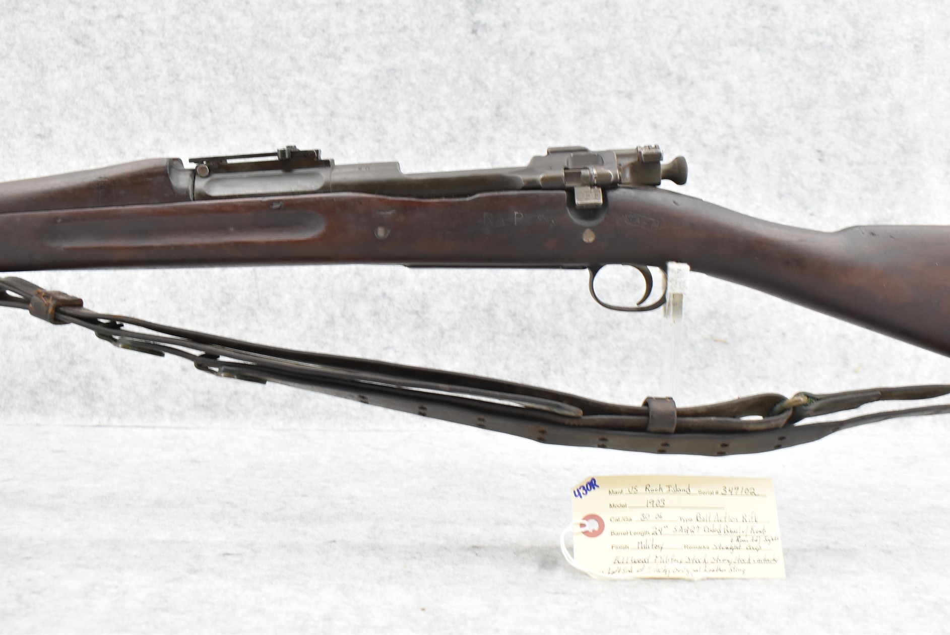 430R. U.S. Rock Island – Mod. 1903 – 30-06 Cal. Bolt Action Rifle – w/24” SA 2-27 Dated Barrel w/Front & Rear Adj. Sights – Military Finish- w/Straight Grip Full Wood Military Stock w/Strong Stock Cartouches on Left Side of Stock – w/Original Leather Sling – Note: Serial Number is Below 800,000