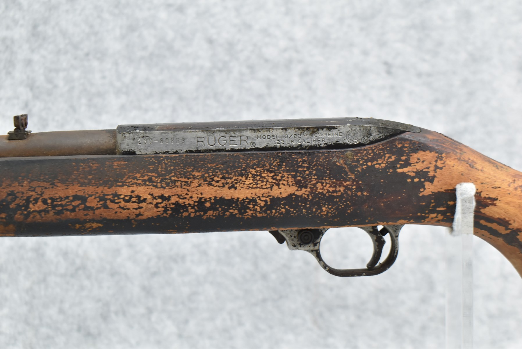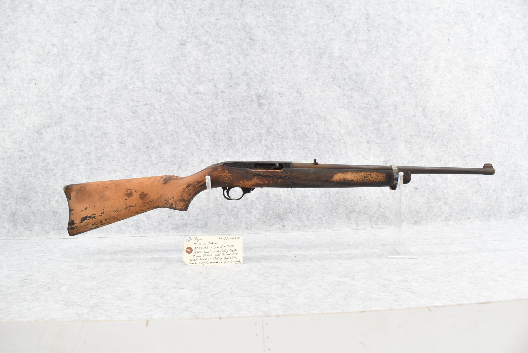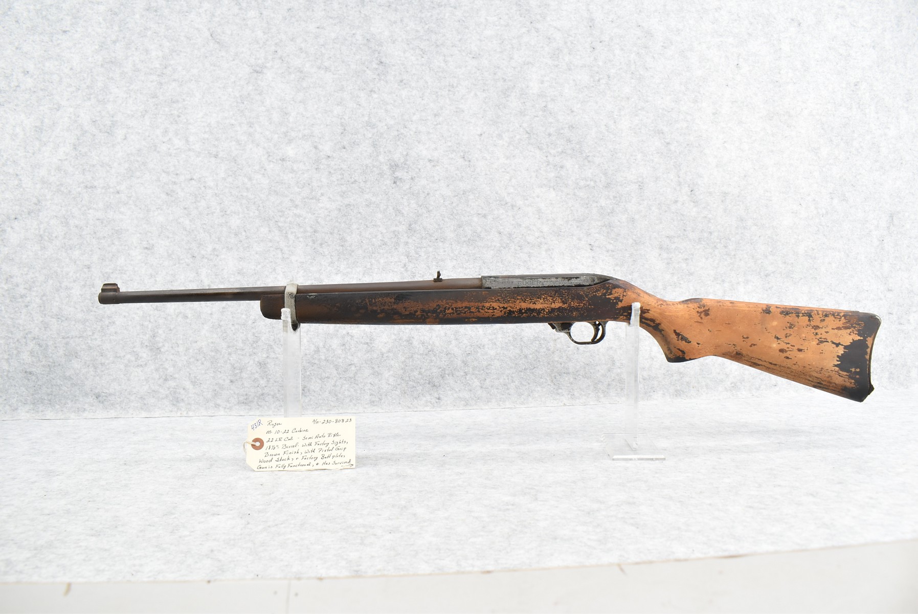 431R. Ruger – Mod. 10/22 Carbine – 22LR Cal. Semi-Auto Rifle – w/18 ½” Barrel w/Factory Sights – Brown Finish – w/Pistol Grip Wood Stock w/Factory Butt Plate – Gun is Fully Functional & Has Survived a House Fire