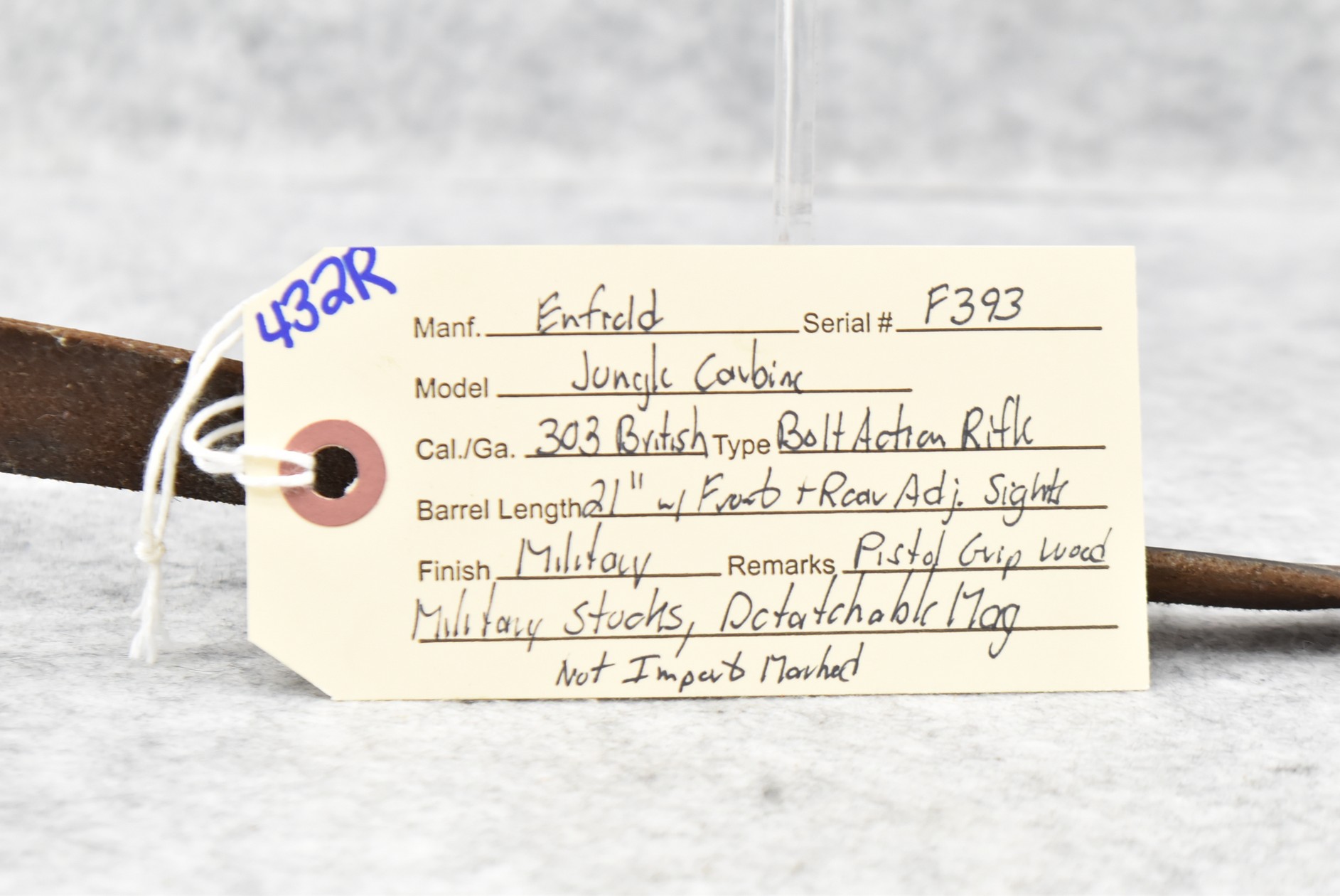 432R. Enfield – Mod. Jungle Carbine – 303 British Cal. Bolt Action Rifle – w/21” Barrel w/Front & Rear Adj. Sights – Military Finish – w/Pistol Grip Wood Military Stocks – w/Detachable Mag – Not Import Marked