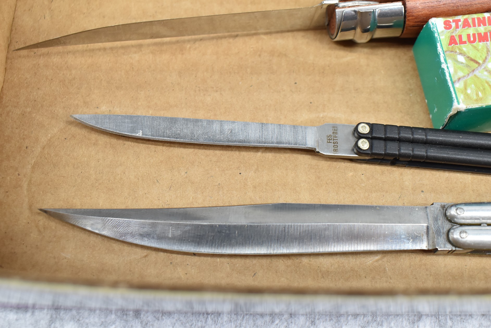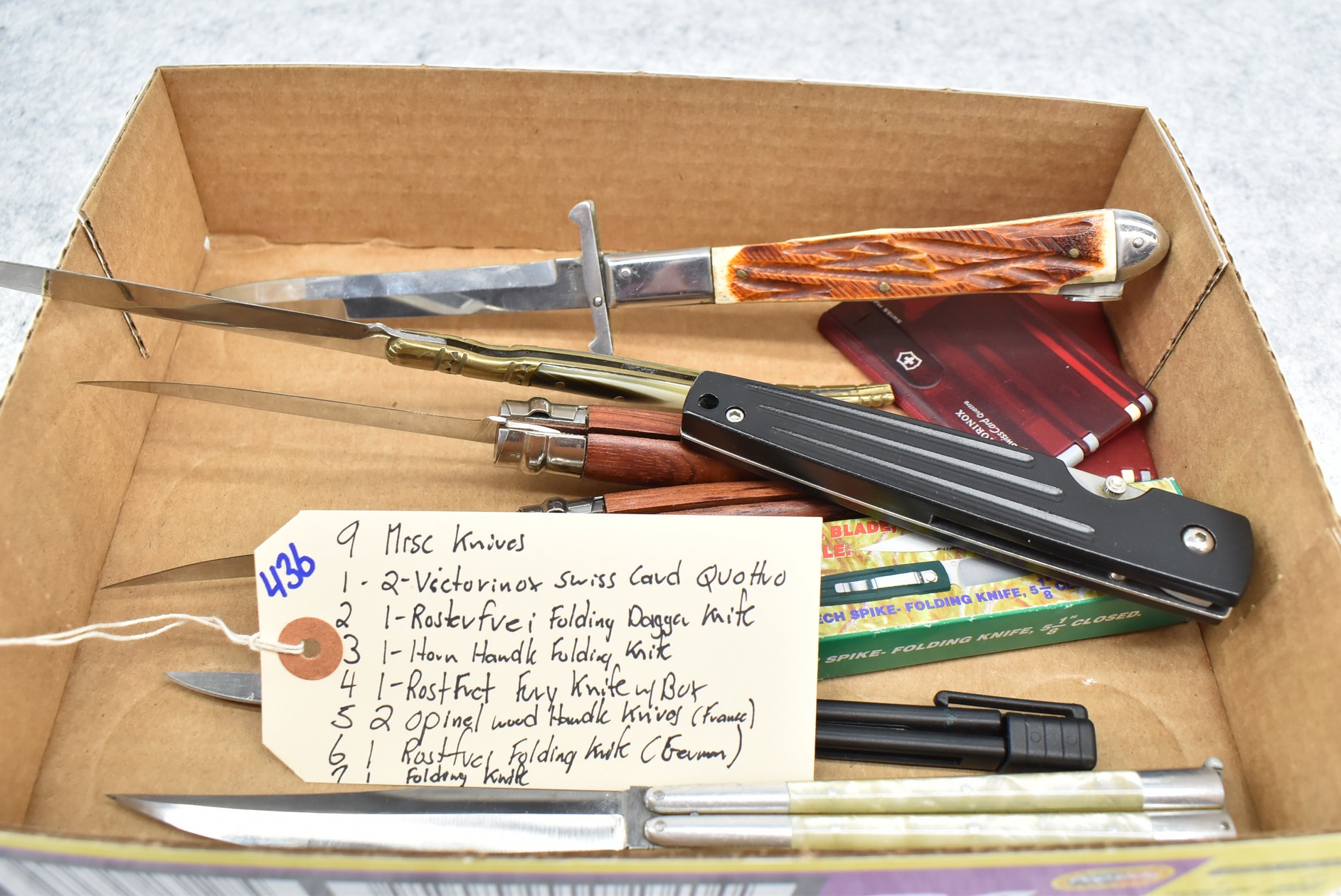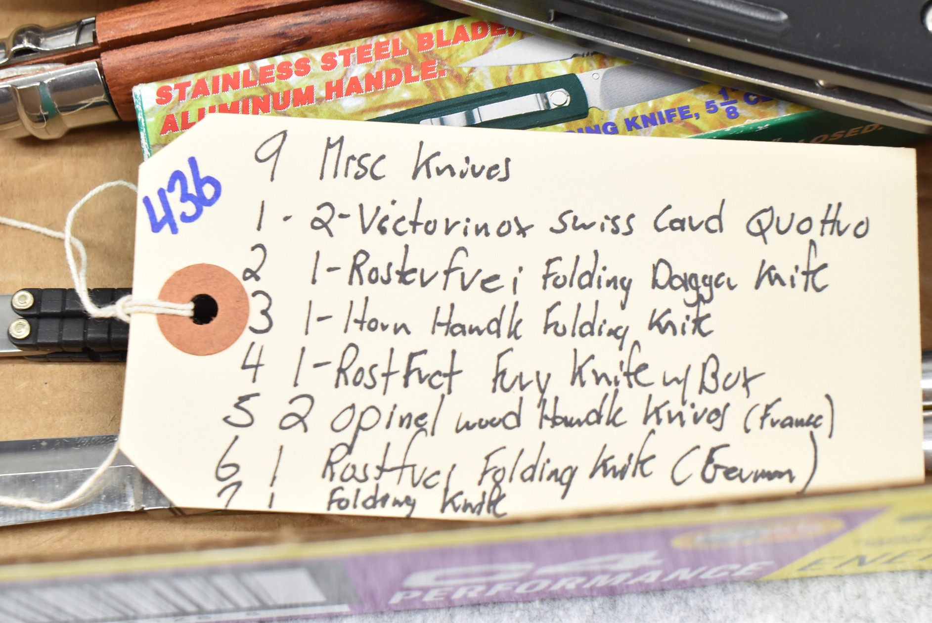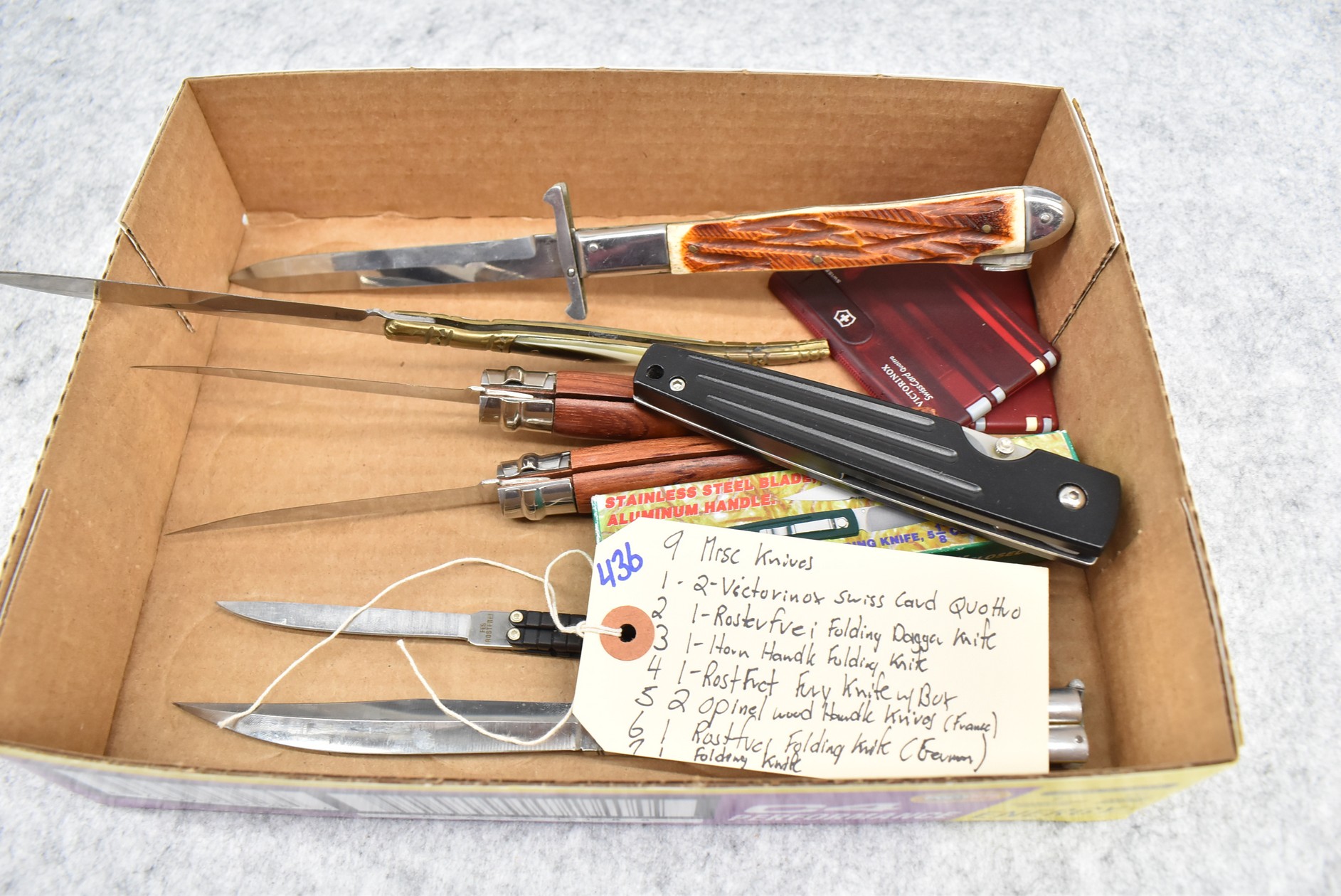 436. Lot of Miscellaneous Knives: 1) Two Victorinox Swiss Card Quattro. 2) Rosterfrei Folding Dagger Knife. 3) Horn Handle Folding Knife. 4) Rostfret Fury Knife w/Box. 5) Two Opinel Wood Handle Knives (France). 6) Rostfrei Folding Knife (German). 7) Folding Knife