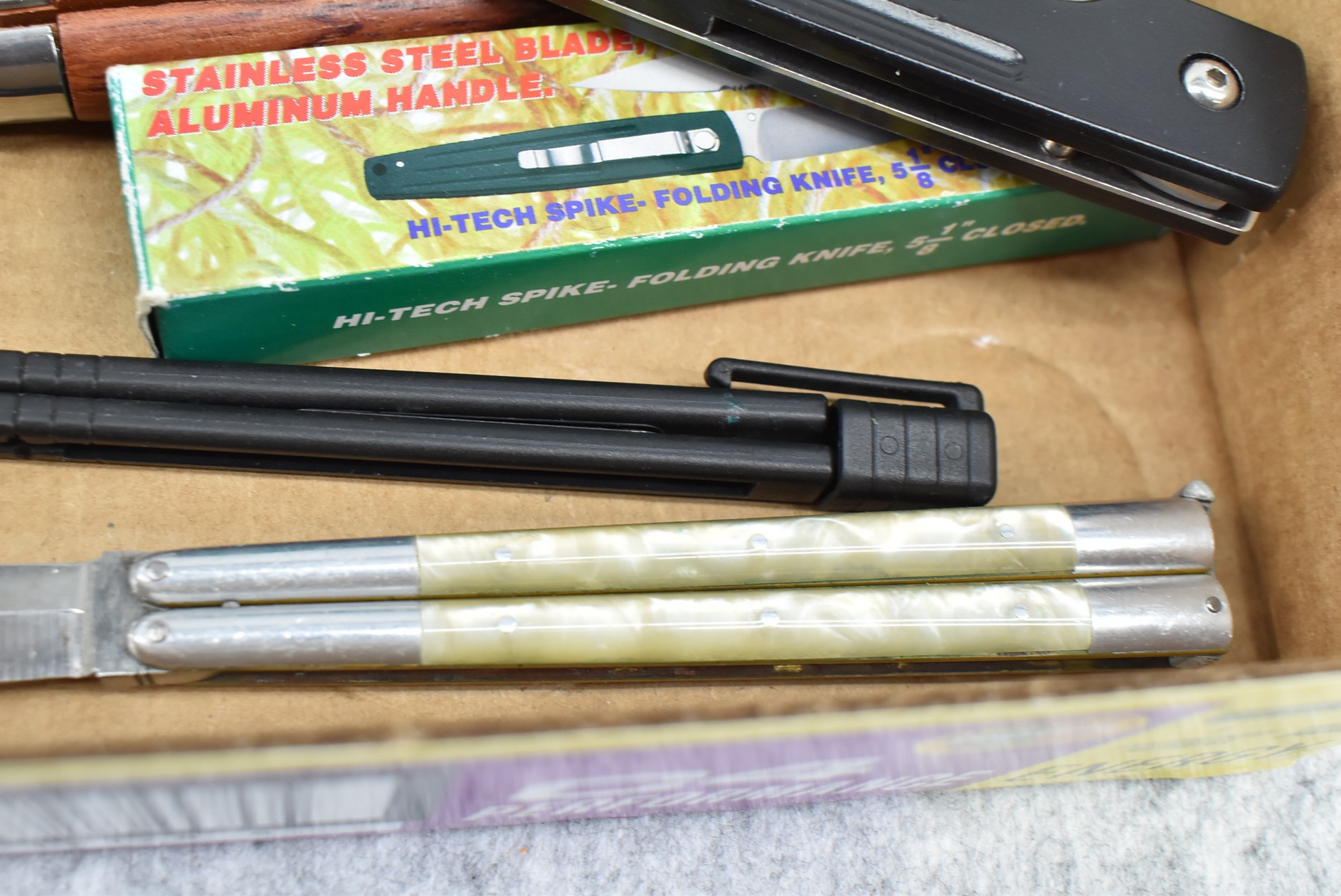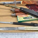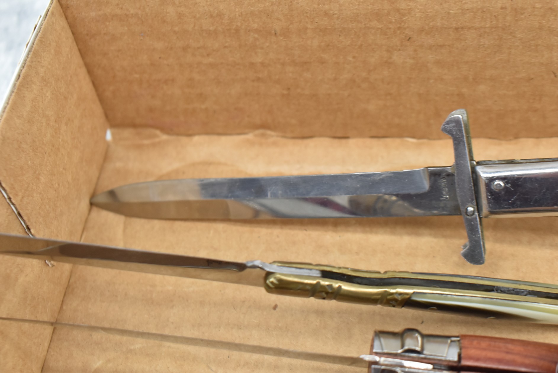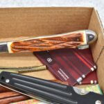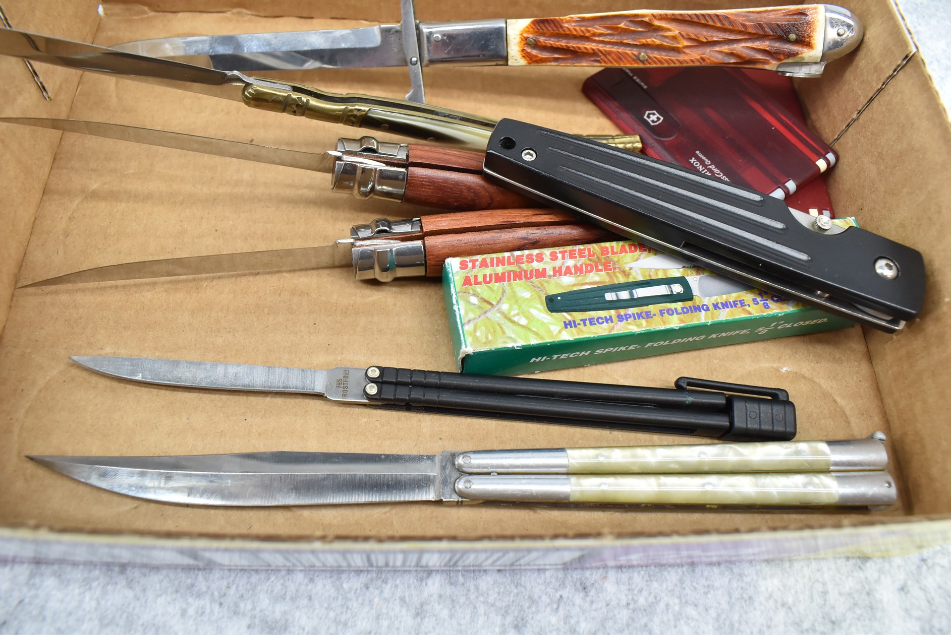 436. Lot of Miscellaneous Knives: 1) Two Victorinox Swiss Card Quattro. 2) Rosterfrei Folding Dagger Knife. 3) Horn Handle Folding Knife. 4) Rostfret Fury Knife w/Box. 5) Two Opinel Wood Handle Knives (France). 6) Rostfrei Folding Knife (German). 7) Folding Knife