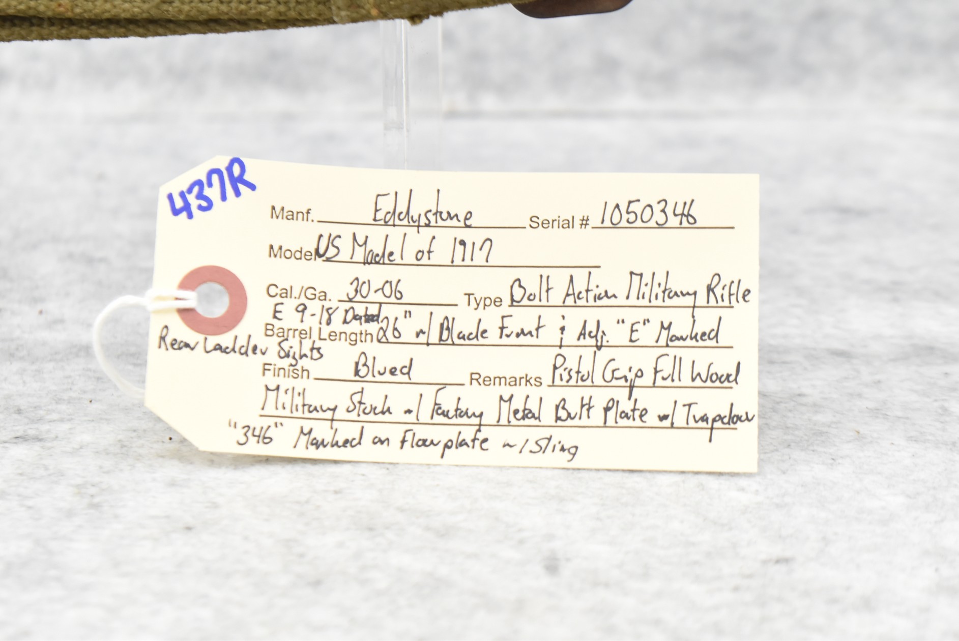 437R. Eddystone – U.S. Model of 1917 – 30-06 Cal. Bolt Action Military Rifle – w/26” E 9-18 Dated Barrel w/Blade Front & Adj. “E” Marked Rear Ladder Sights – Blued Finish – w/Pistol Grip Full Wood Military Stock w/Factory Metal Butt Plate w/Trapdoor – “346” Marked on Floor Plate – w/Sling