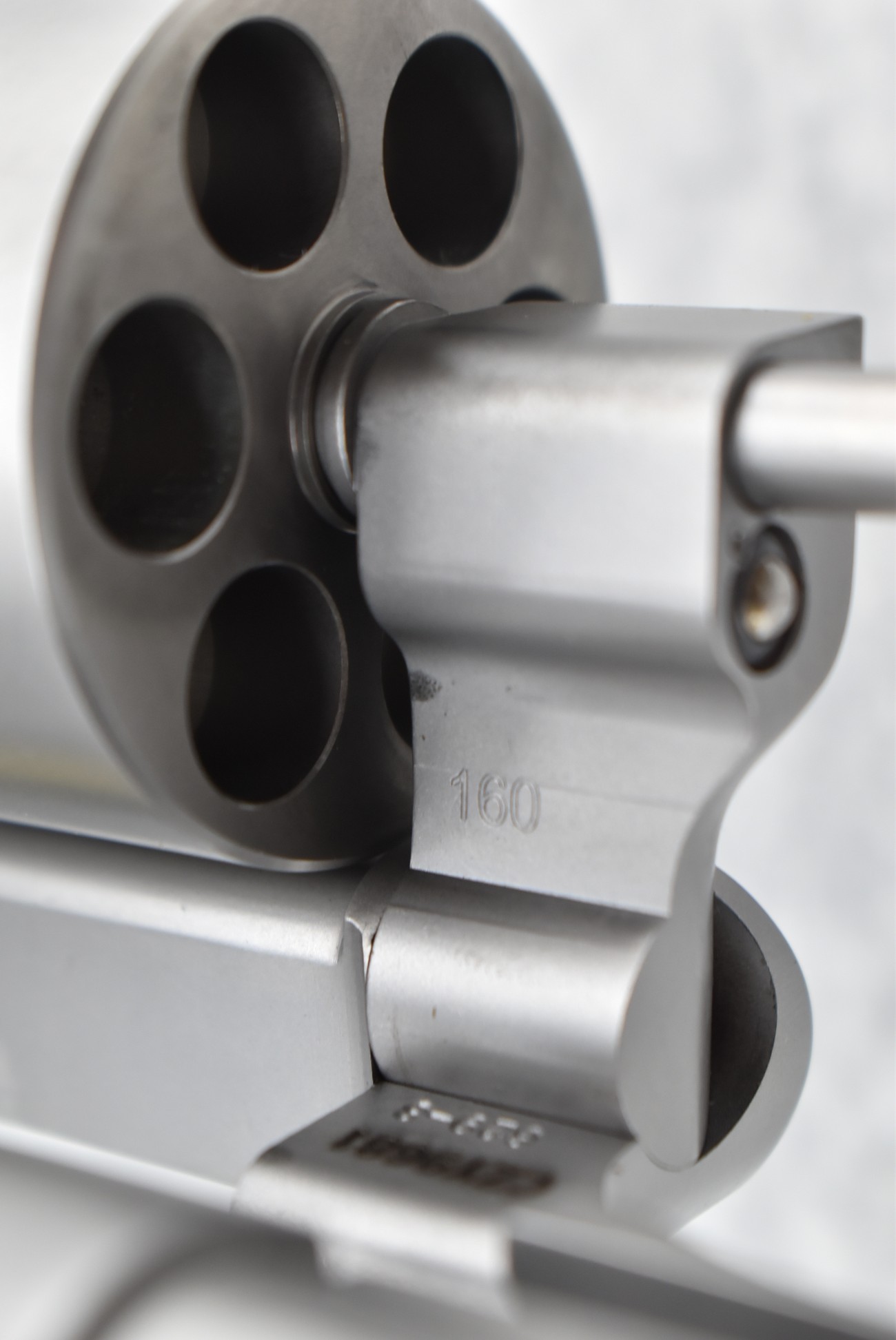 437R. Smith & Wesson – Mod. 629-8 “Performance Center Hunter” – 44 Mag. Cal. Double Action Revolver – w/8 3/8” Fluted Stainless Barrel w/Fiber Optic Blade Front & White Outlined Adj. Rear Night Sights – Satin Stainless Finish – w/6-Shot Unfluted Cylinder – w/S&W Gold Medallion Diamond Checkered Wood Grips – w/S&W Performance Center Soft Case