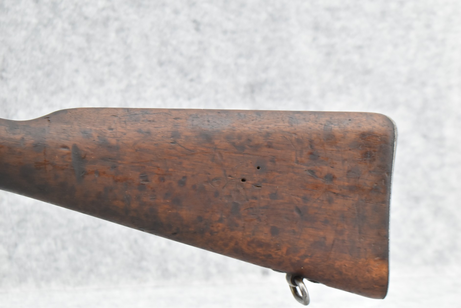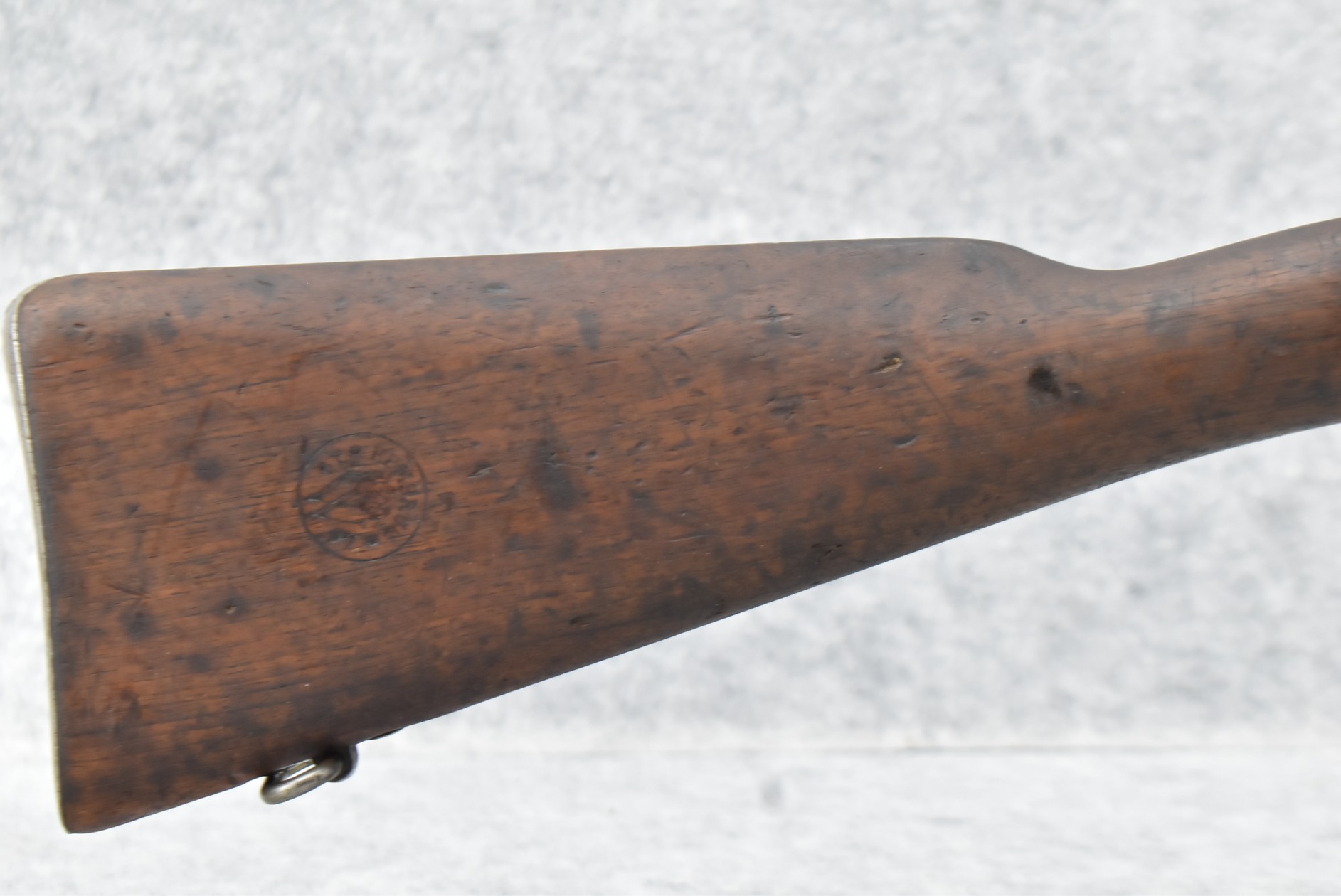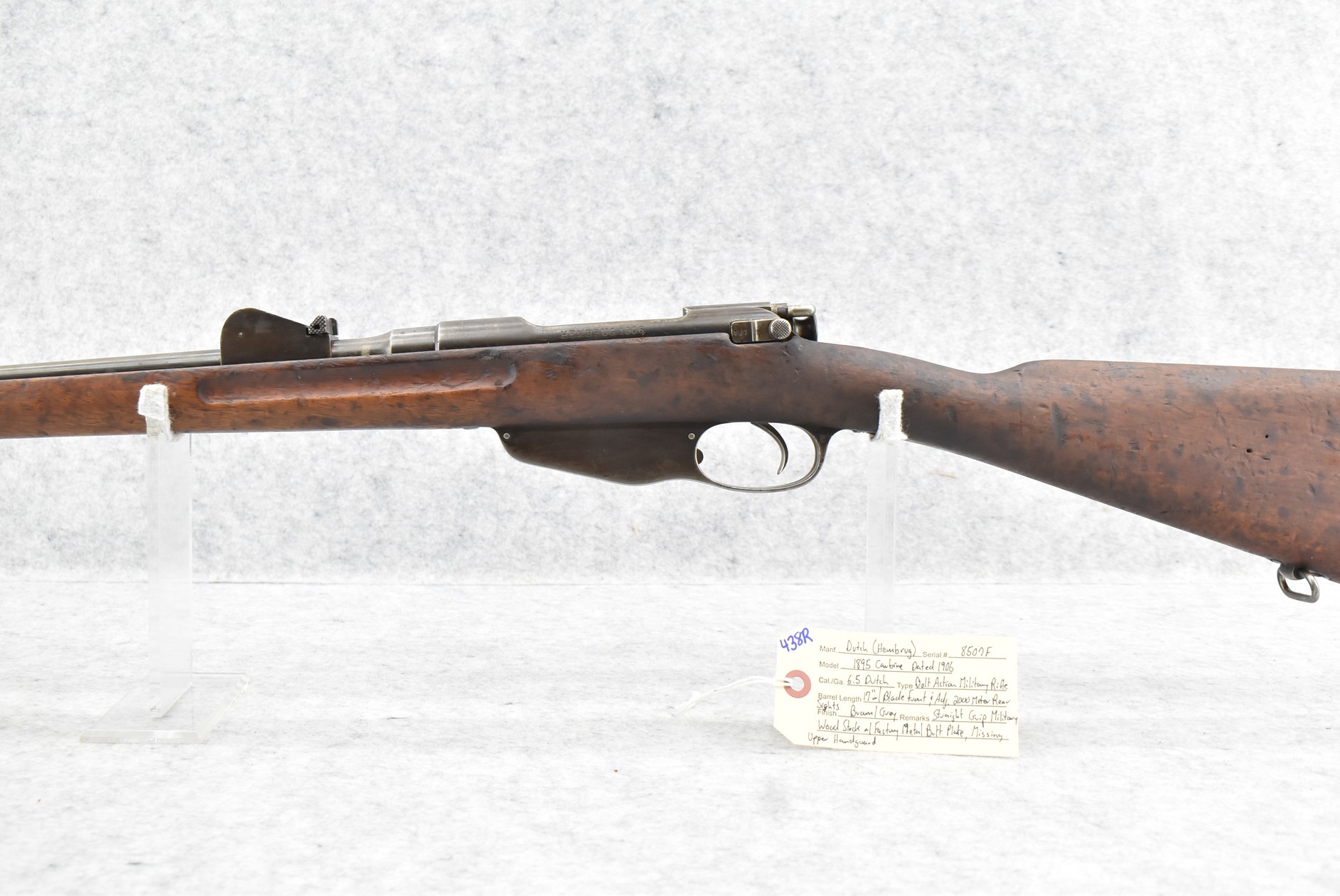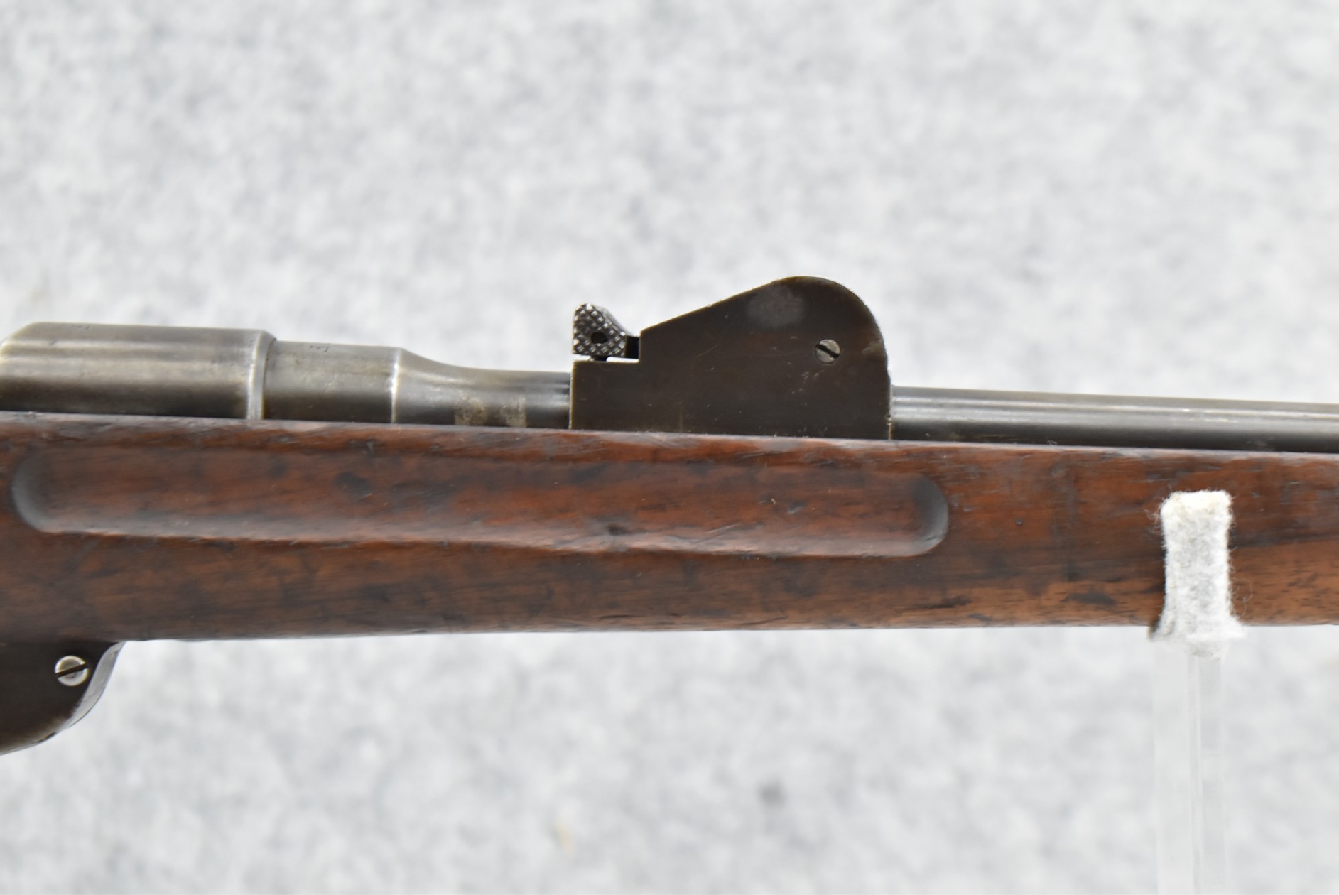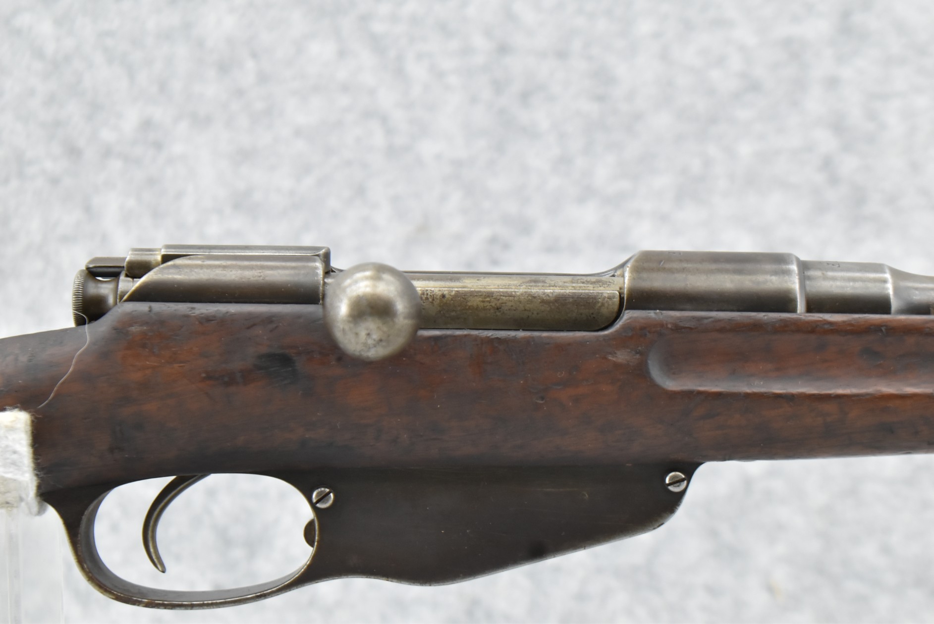 438R.     Dutch (Hembrug) – Mod. 1895 Carbine – 6.5 Dutch Cal. Bolt Action Military Rifle – w/17” Barrel w/Blade Front & Adj. 2,000 Meter Rear Sights – Brown/Gray Finish – w/Straight Grip Military Wood Stock w/Factory Metal Butt Plate – Dated 1906 – Missing Upper Handguard – Not Import Marked