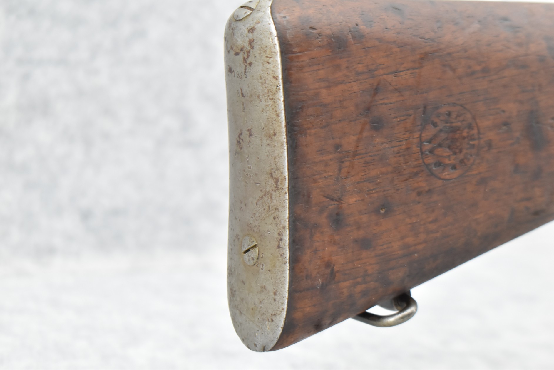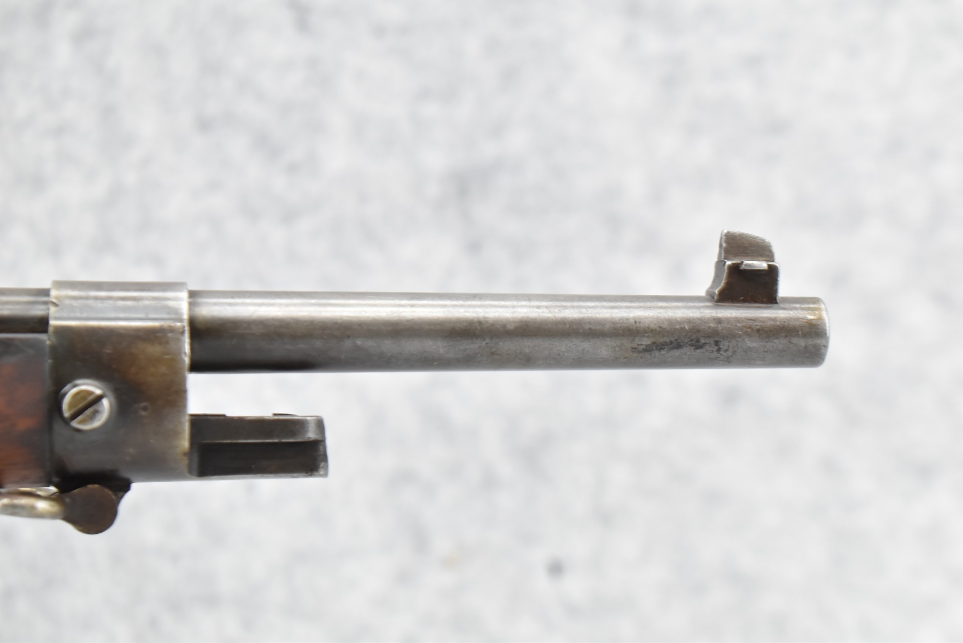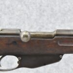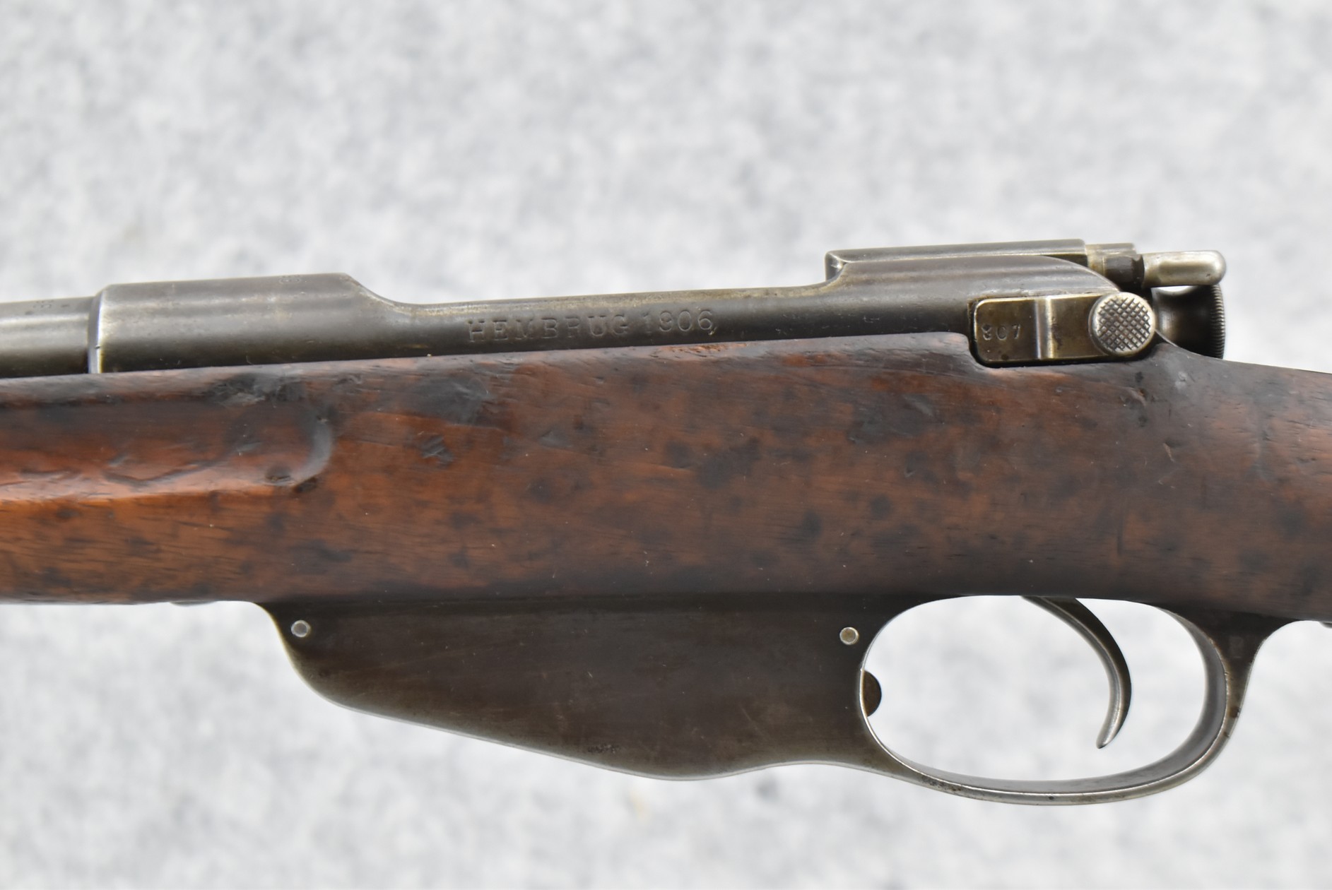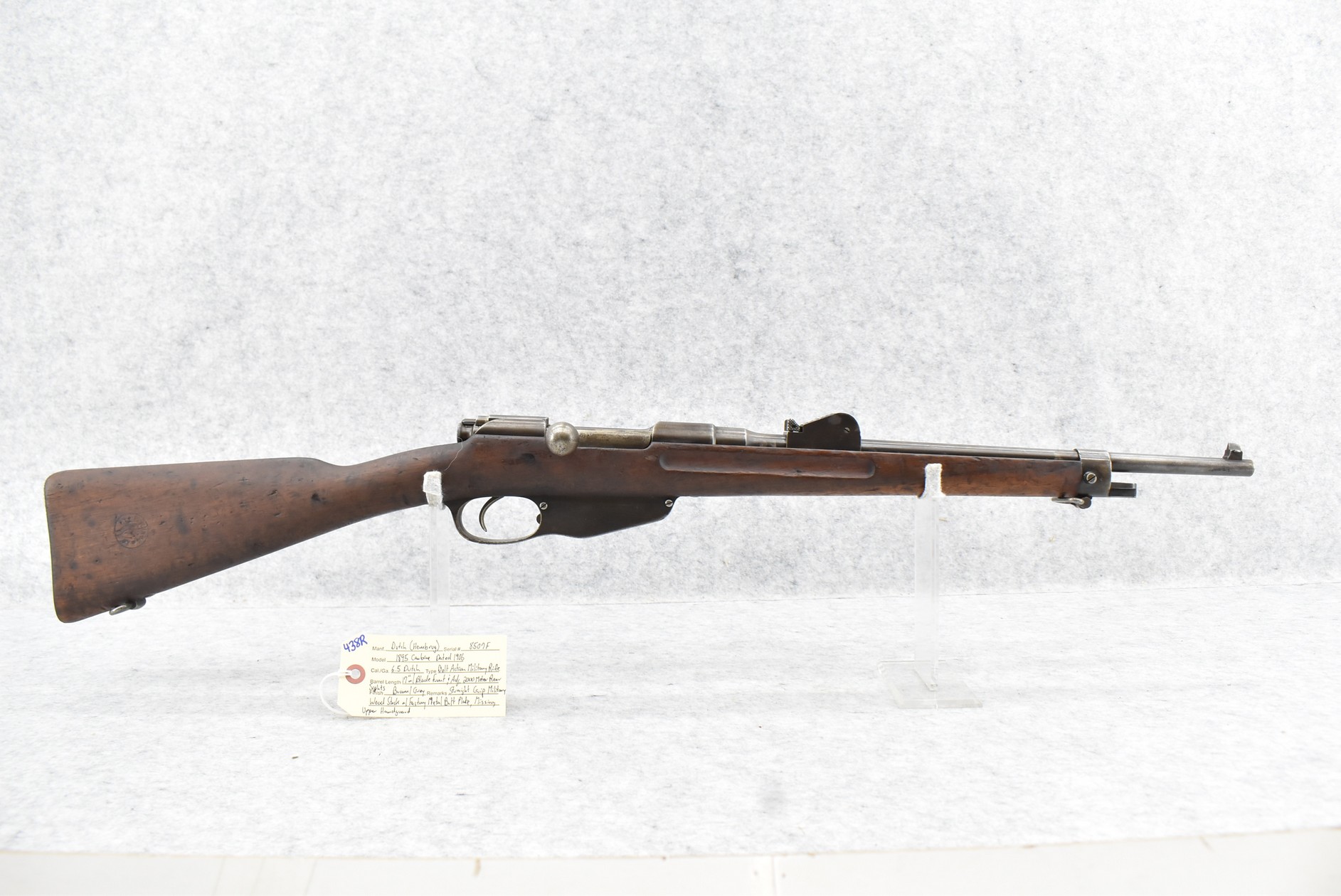 438R.     Dutch (Hembrug) – Mod. 1895 Carbine – 6.5 Dutch Cal. Bolt Action Military Rifle – w/17” Barrel w/Blade Front & Adj. 2,000 Meter Rear Sights – Brown/Gray Finish – w/Straight Grip Military Wood Stock w/Factory Metal Butt Plate – Dated 1906 – Missing Upper Handguard – Not Import Marked