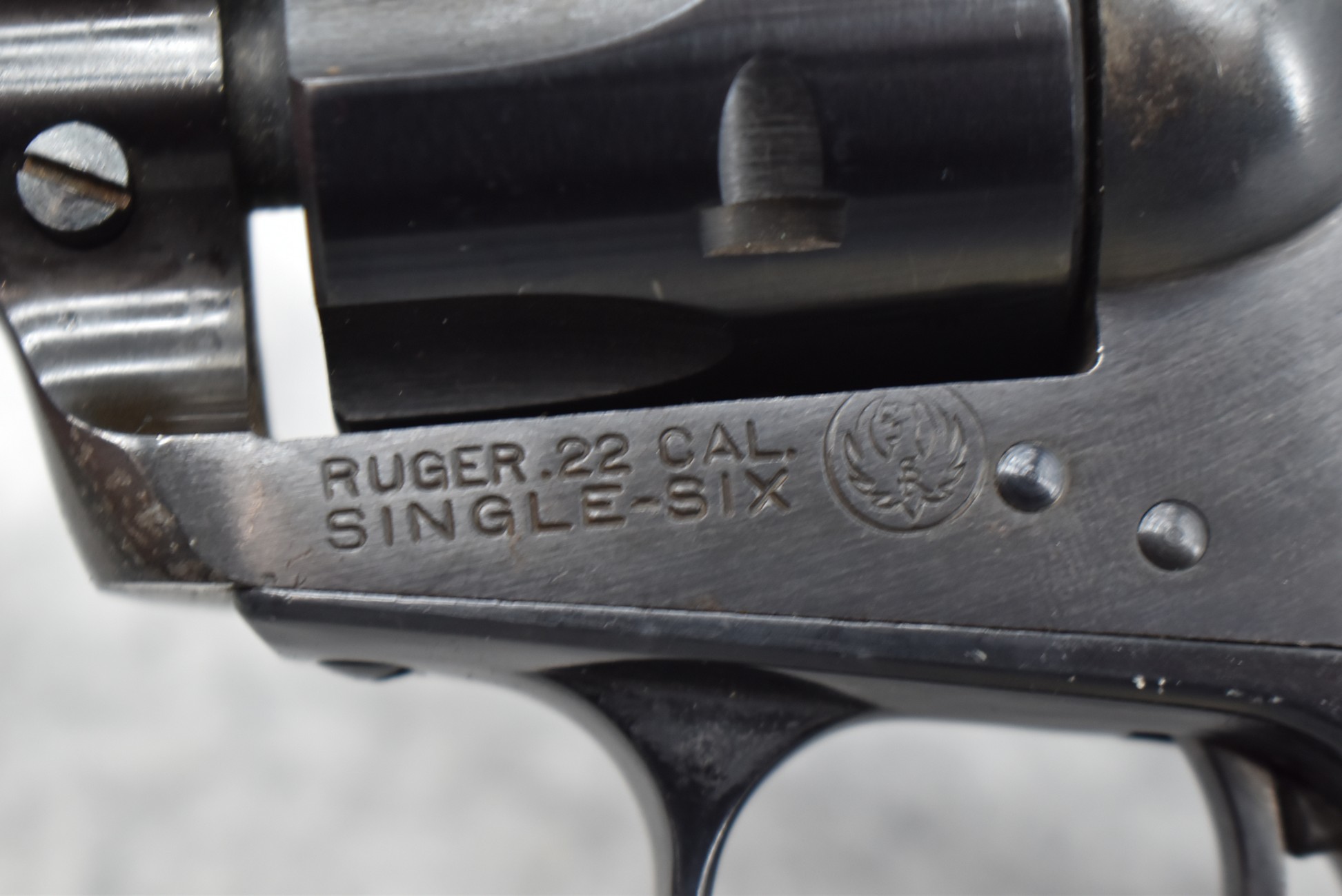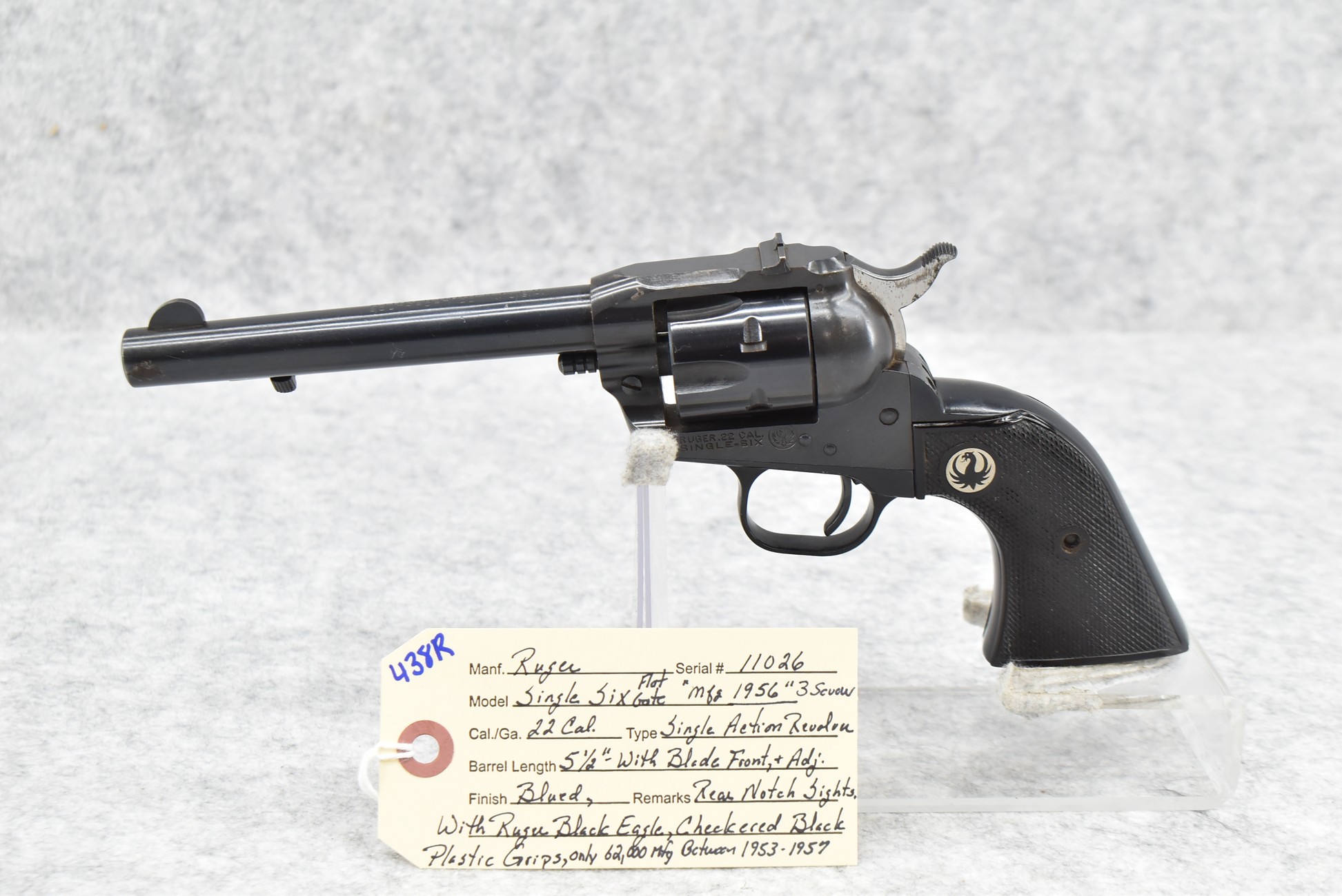 438R. Ruger – Mod. Single Six Flat Gate (3-Screw) – 22 Cal. Single Action Revolver – w/5 ½” Barrel w/Blade Front & Adj. Rear Notch Sights – Blued Finish – w/Ruger Black Eagle Checkered Black Plastic Grips – Only 62,000 Mfg. Between 1953-1957