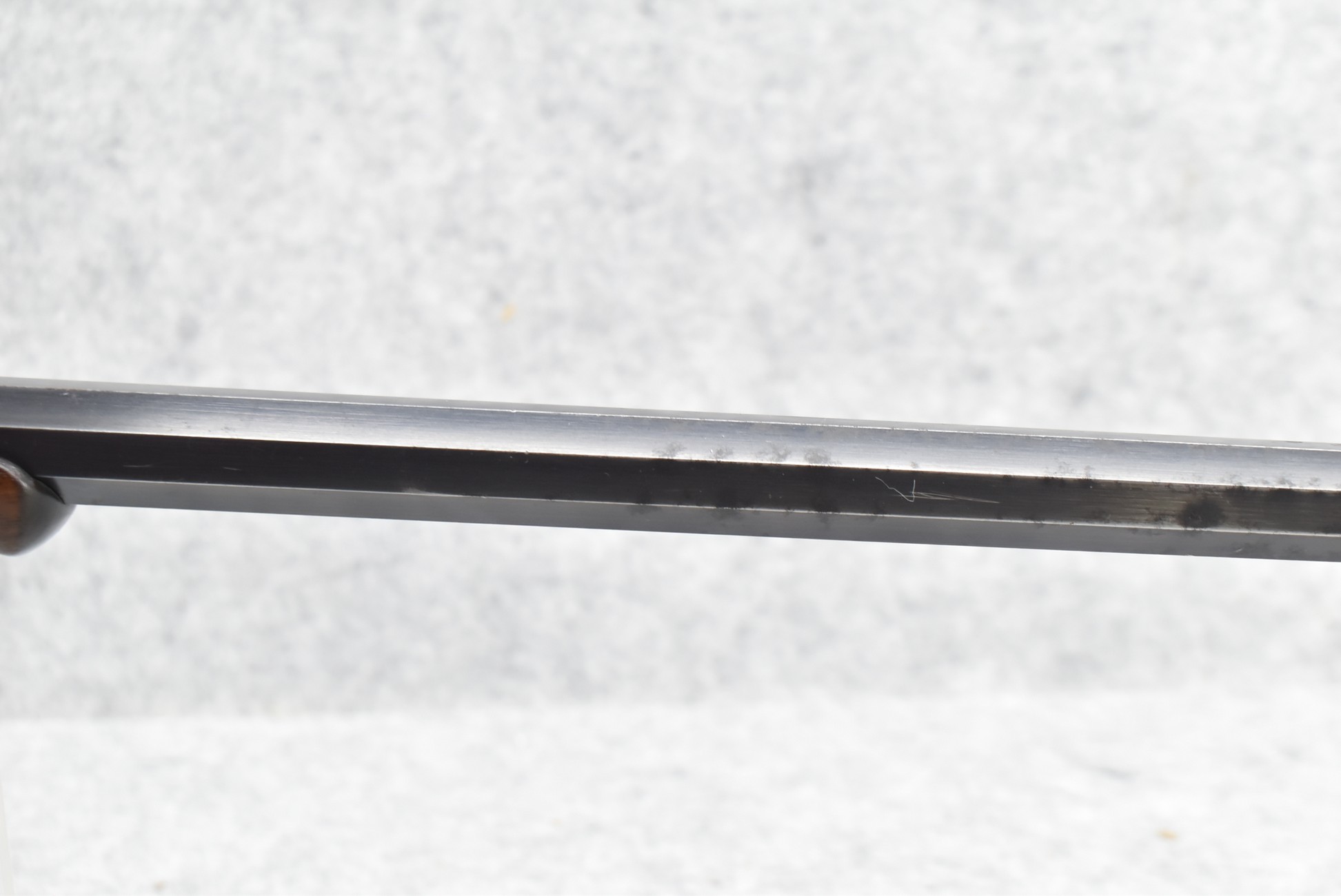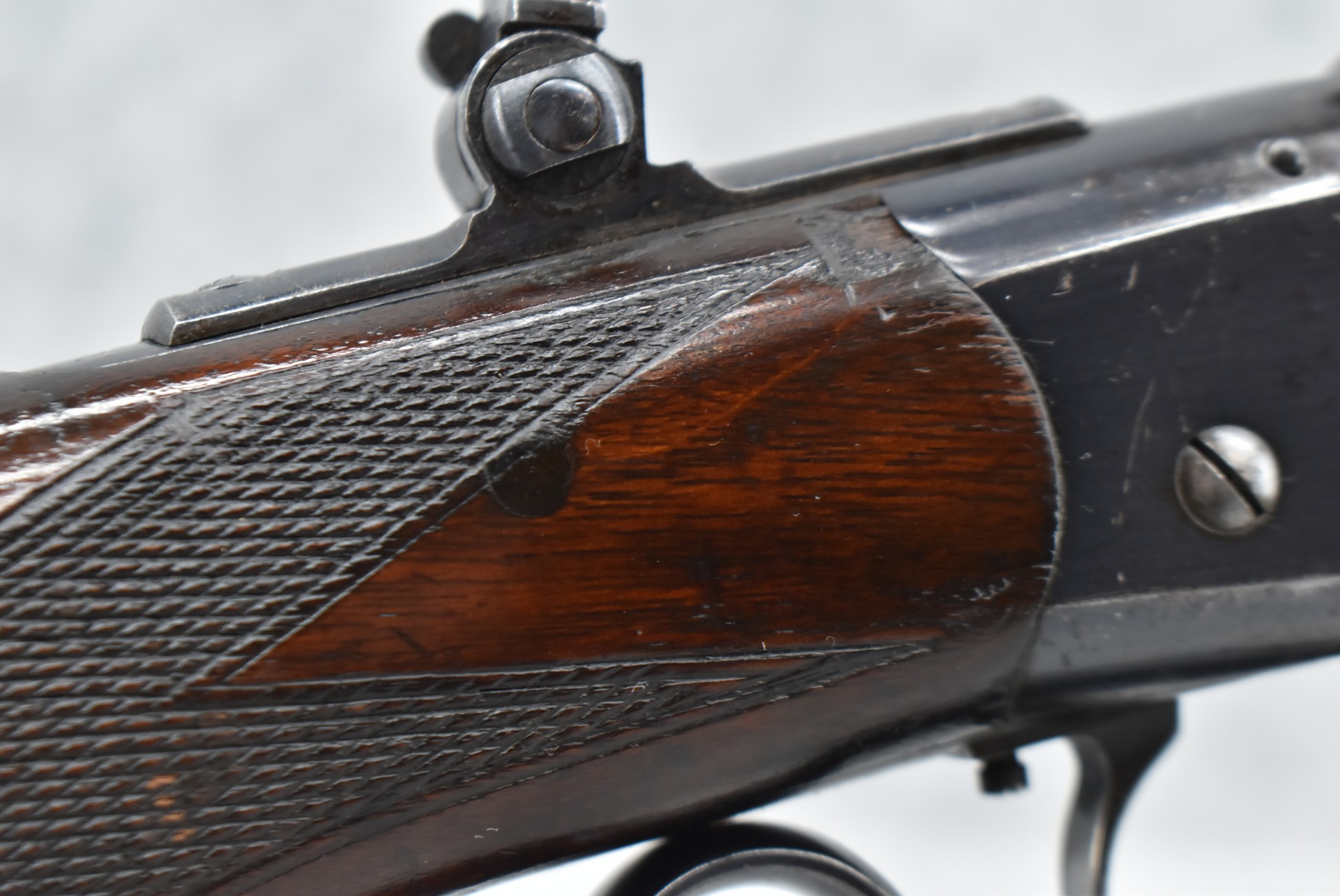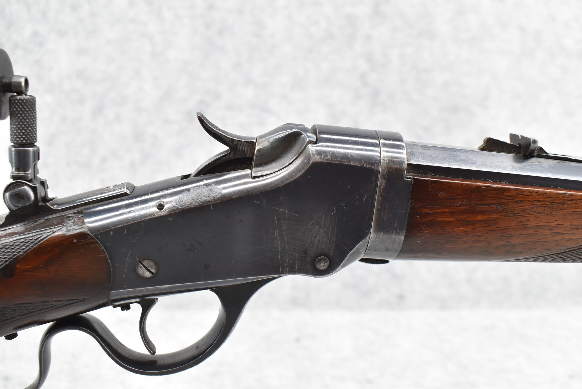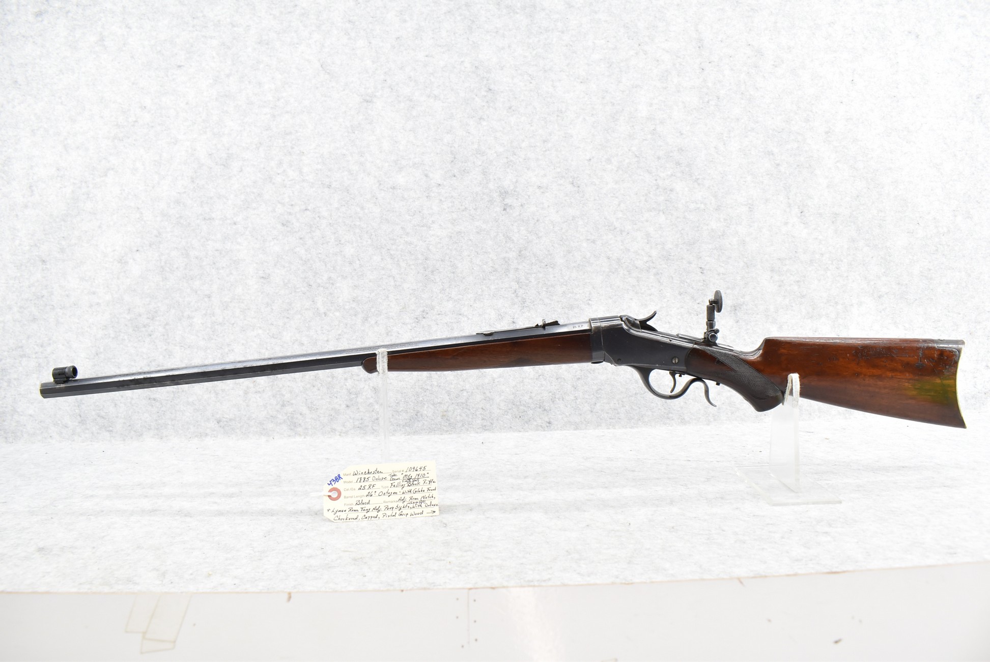 438R. Winchester – Mod. 1885 Deluxe Take Down – 25 RF Cal. Single Shot Falling Block Rifle – w/26” Octagon Barrel w/Globe Front, Adj. Rear Notch Barrel Sights & Lyman Rear Tang Adj. Peep Sights w/Large Disc – Blued Finish – w/Deluxe Checkered Capped Pistol Grip Wood Stocks w/Crescent Metal Butt Plate – Mfg. 1910 – Scarce Takedown Model w/A Lot of Original Blued Finish – Note: Stock Pinned at Pistol Grip