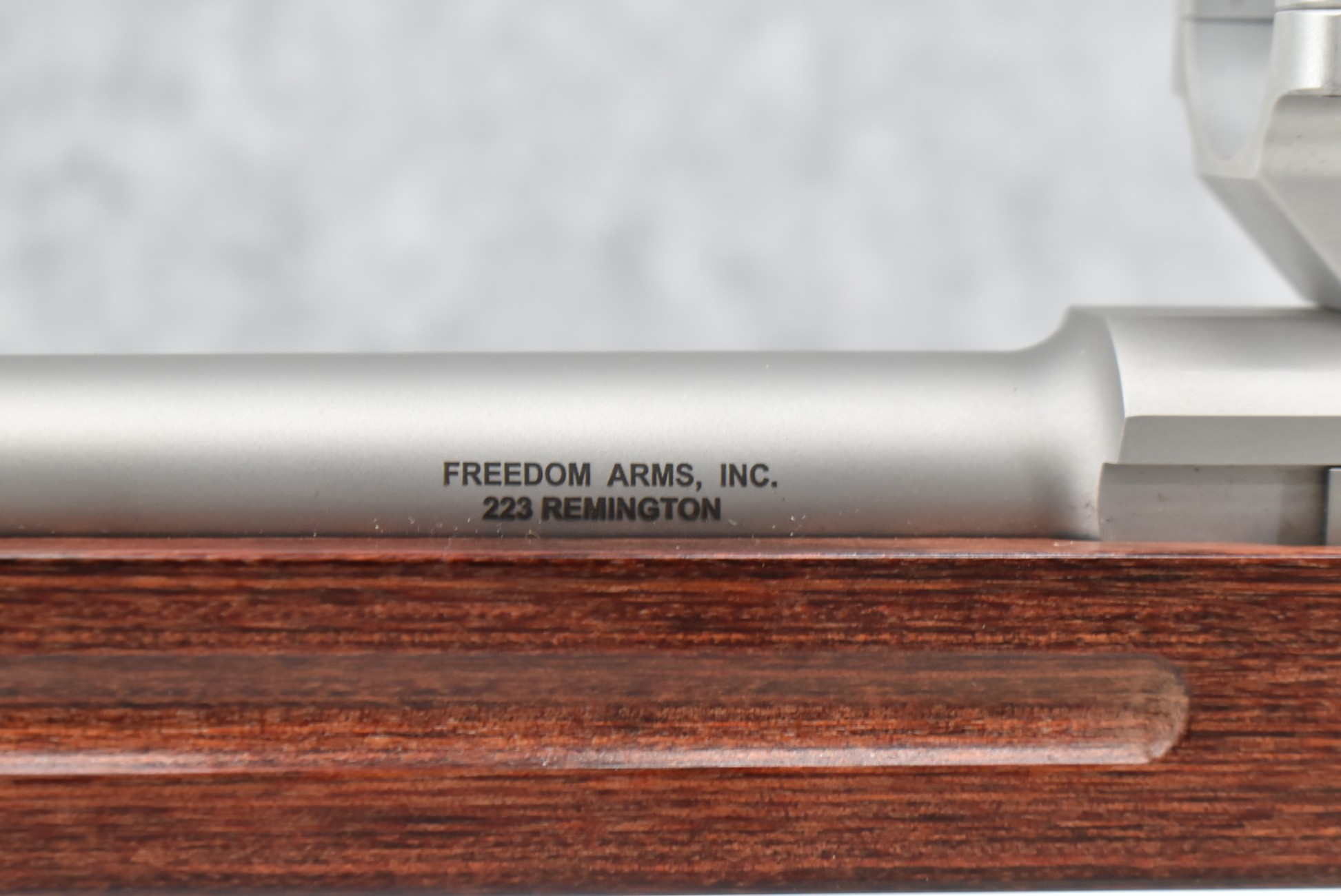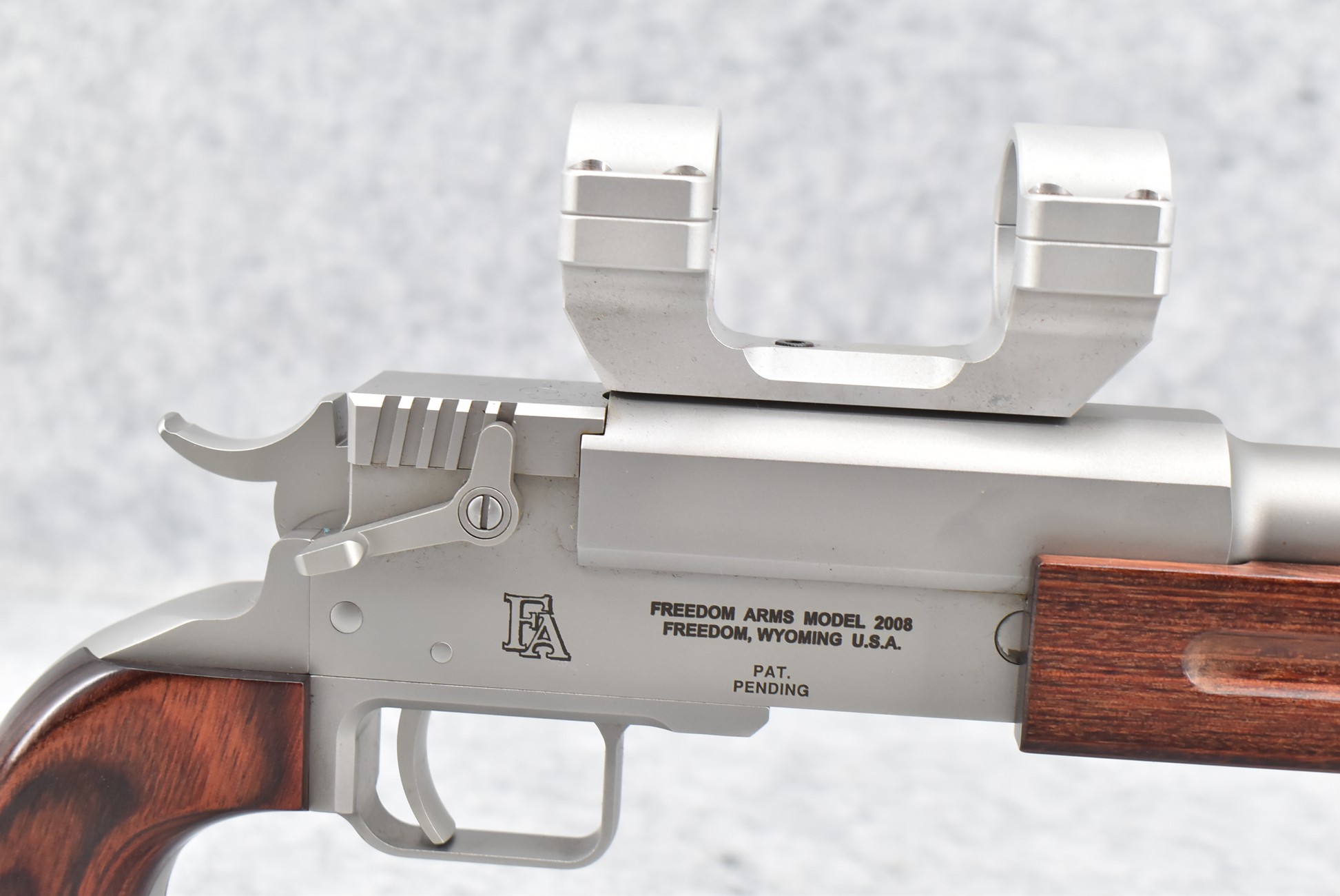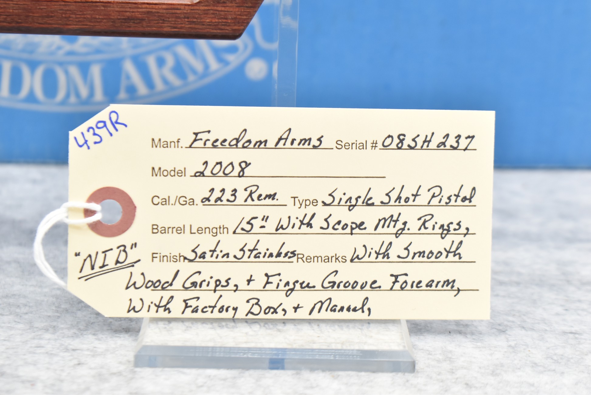 439R. Freedom Arms – Mod. 2008 – 223 Rem. Cal. Single Shot Pistol – w/15” Barrel – Satin Stainless Finish – w/Smooth Wood Grips & Finger Groove Forearm – w/Scope Mounting Rings – New w/Factory Box & Manual