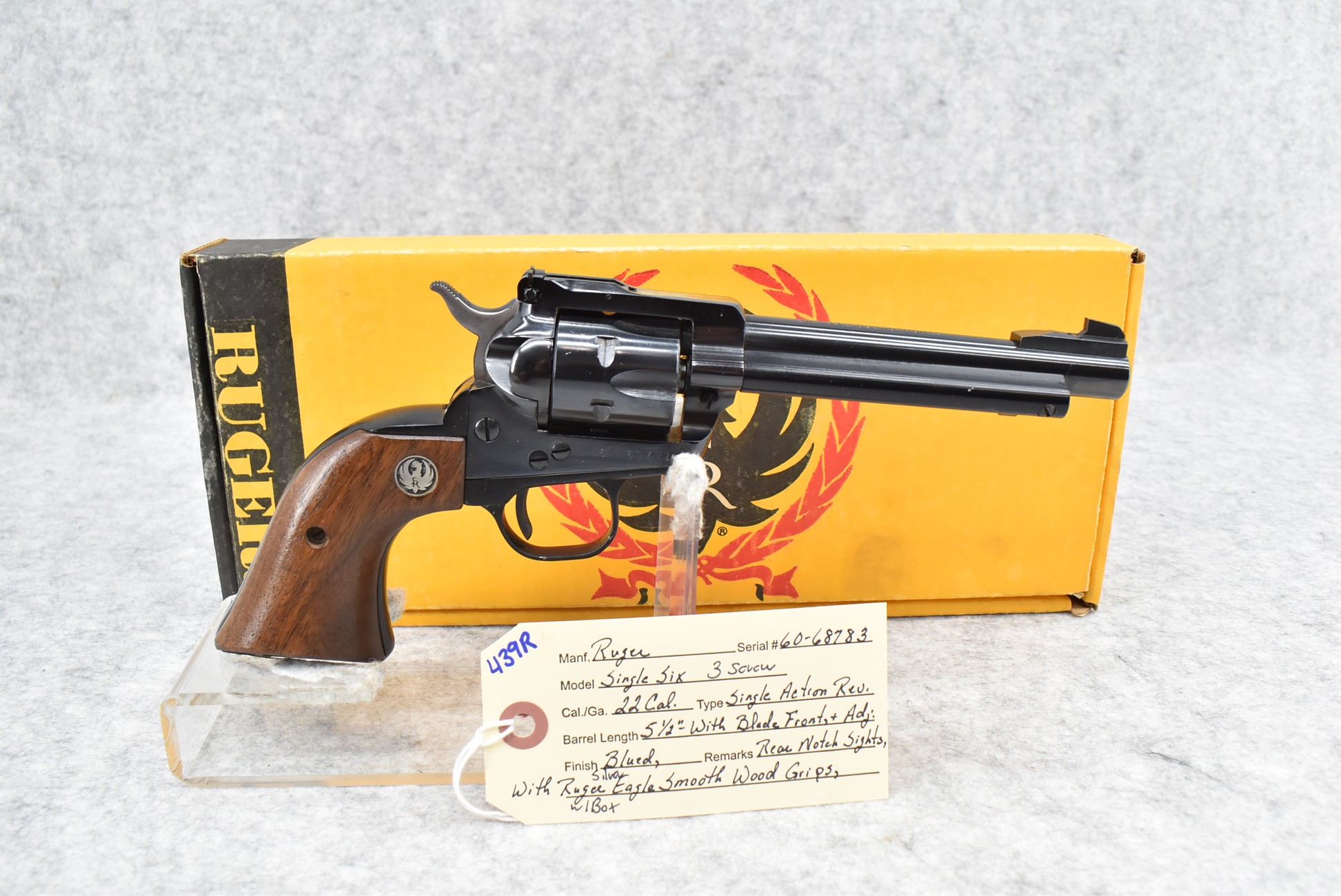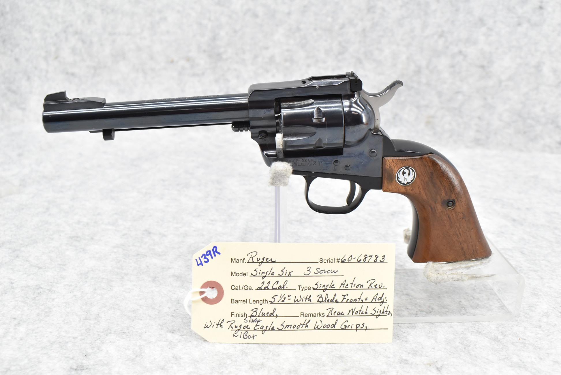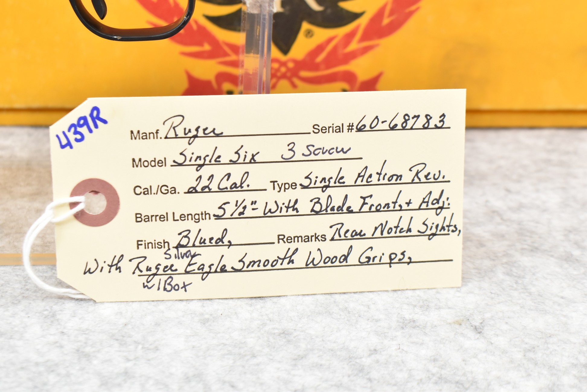 439R. Ruger – Mod. Single Six (3-Screw) – 22 Cal. Single Action Revolver – w/5 ½” Barrel w/Blade Front & Adj. Rear Notch Sights – Blued Finish – w/Ruger Silver Eagle Smooth Wood Grips – w/Box
