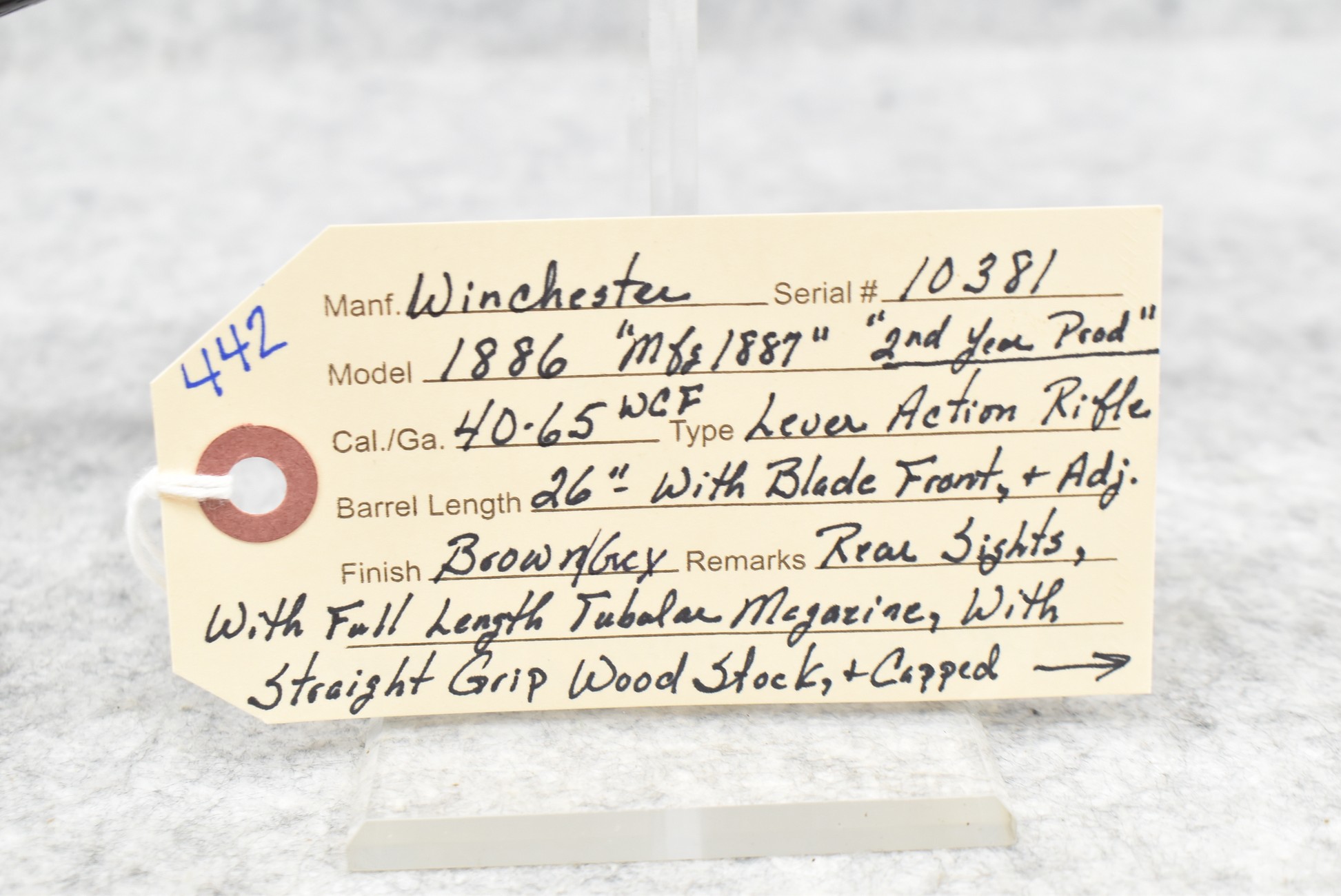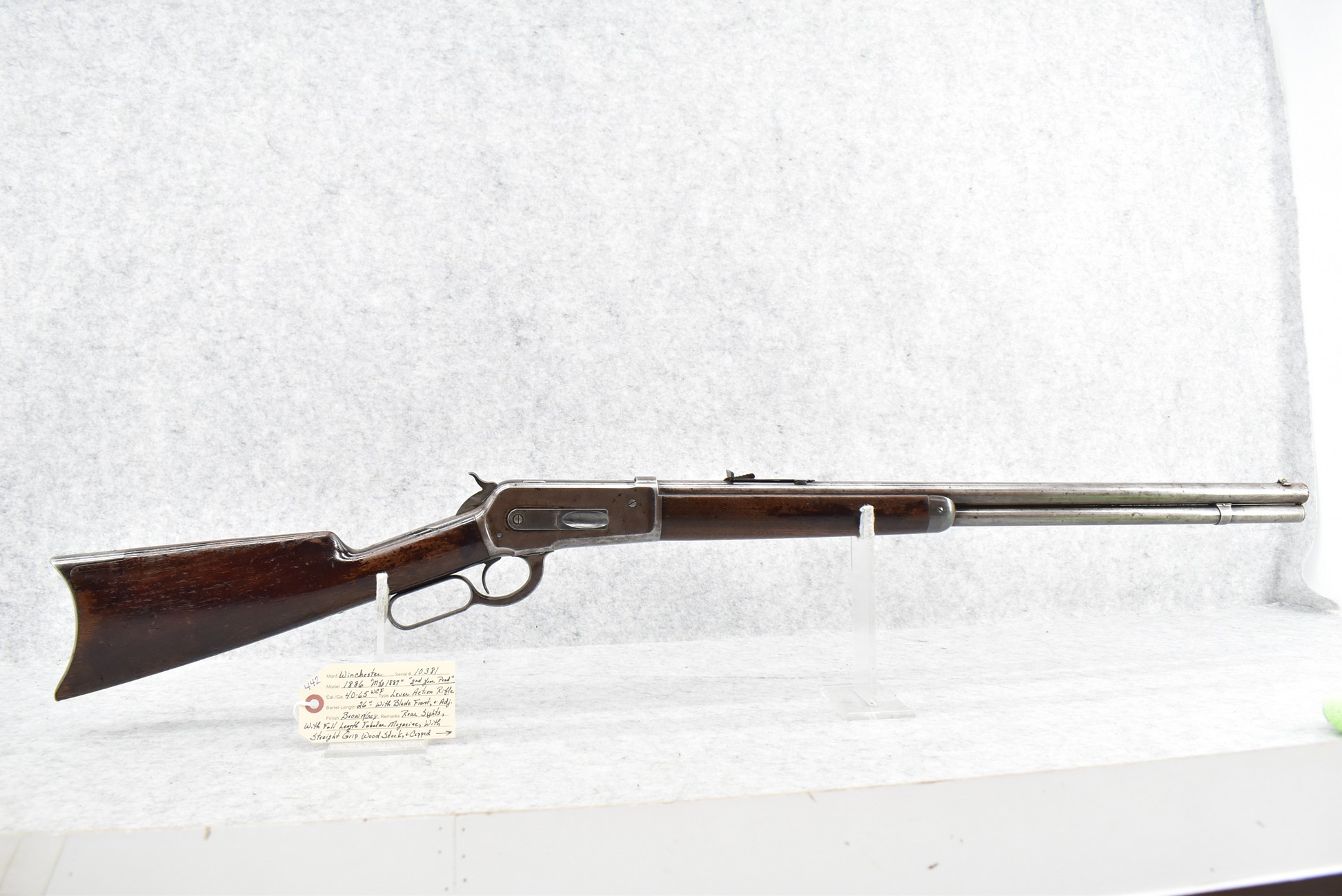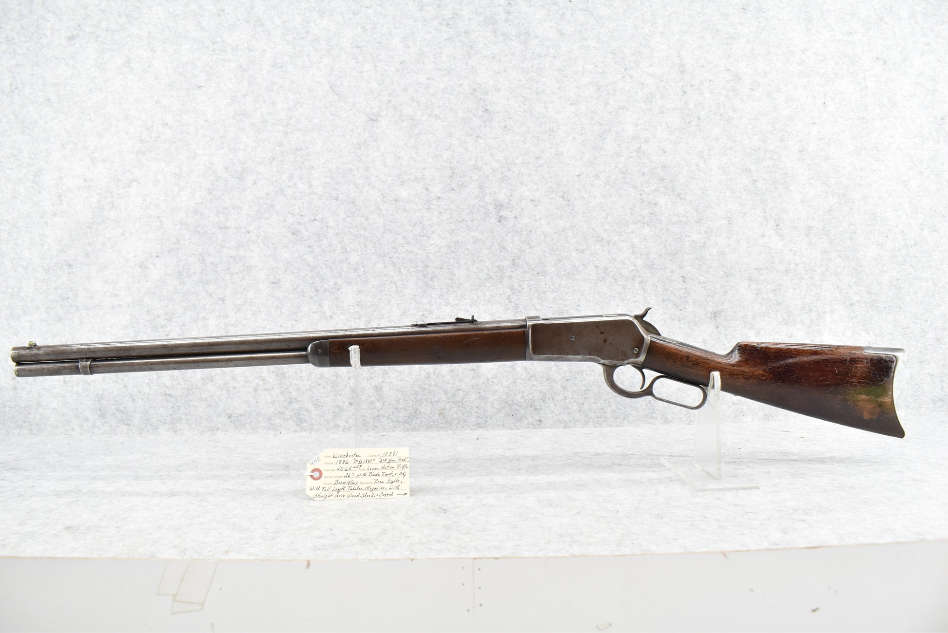 442. Winchester – Mod. 1886 “2nd Year Production” – 40-65 WCF Cal. Lever Action Rifle – w/26” Barrel w/Blade Front and Adjustable Rear Sights – Brown/Grey Finish – w/Straight Grip Wood Stock and Capped Forearm w/Crescent Metal Butt Plate – w/Full Length Tubular Magazine – Manufactured 1887