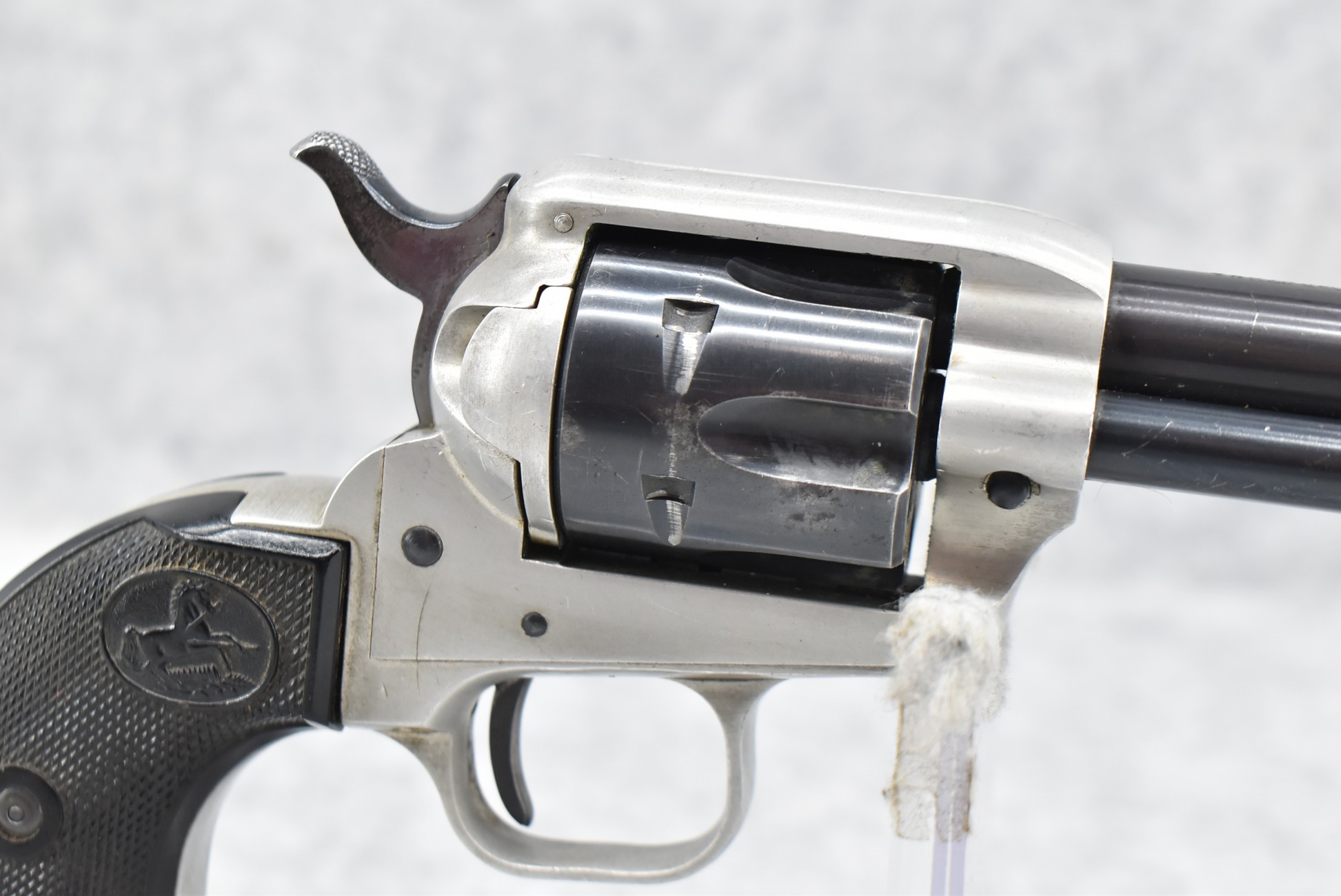 442R. Colt – Mod. Single Action Front Scout (Q Suffix) – 22LR Cal. Single Action Revolver – w/4 ¾” Barrel w/Blade Front & Notch Rear Sights – Blued/Gray Alloy Duotone Finish – w/Colt Factory Checkered Black Plastic Grips – Mfg. 1957 – Q Suffix Guns w/Duotone Finish Mfg. Between 1957-58 Only