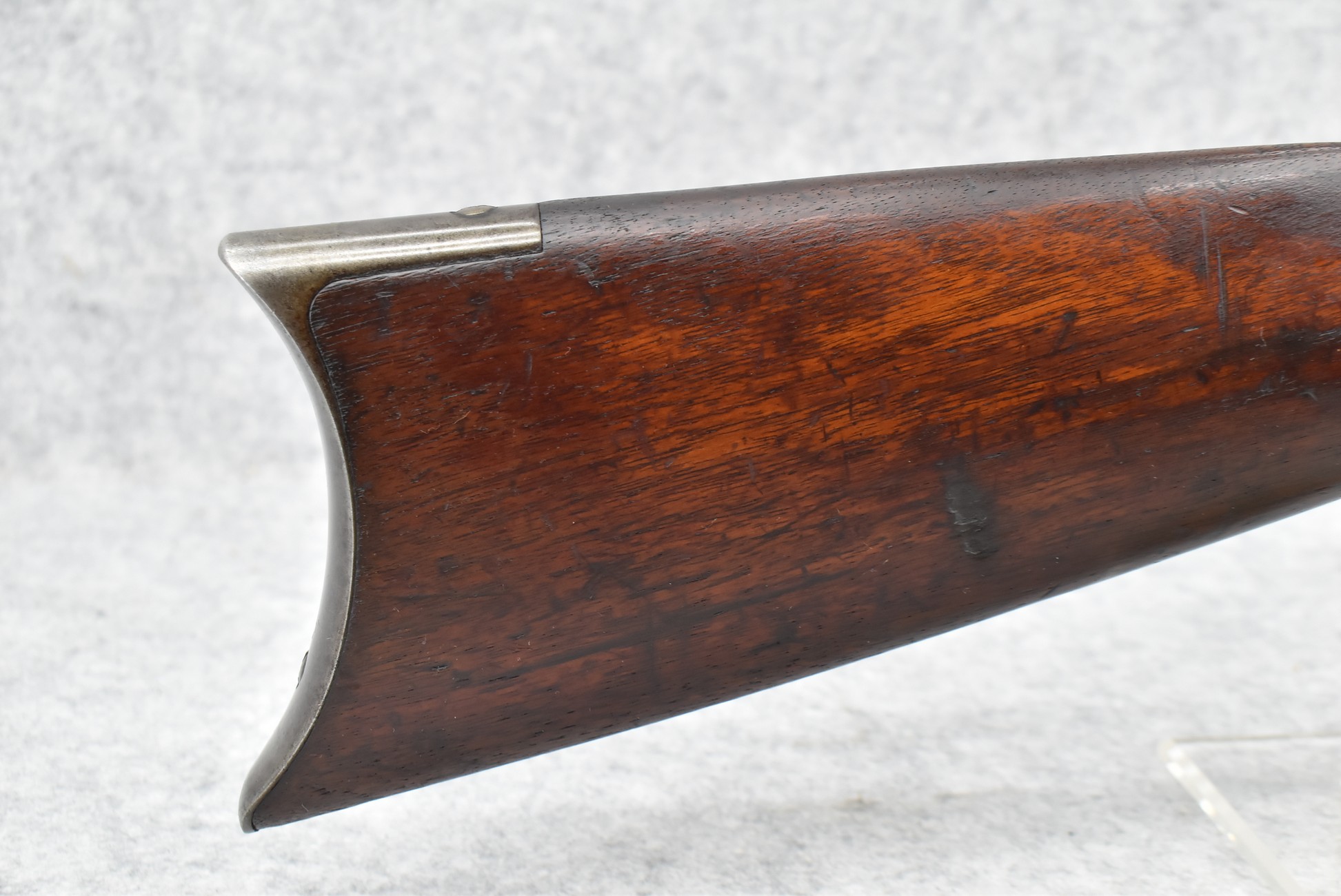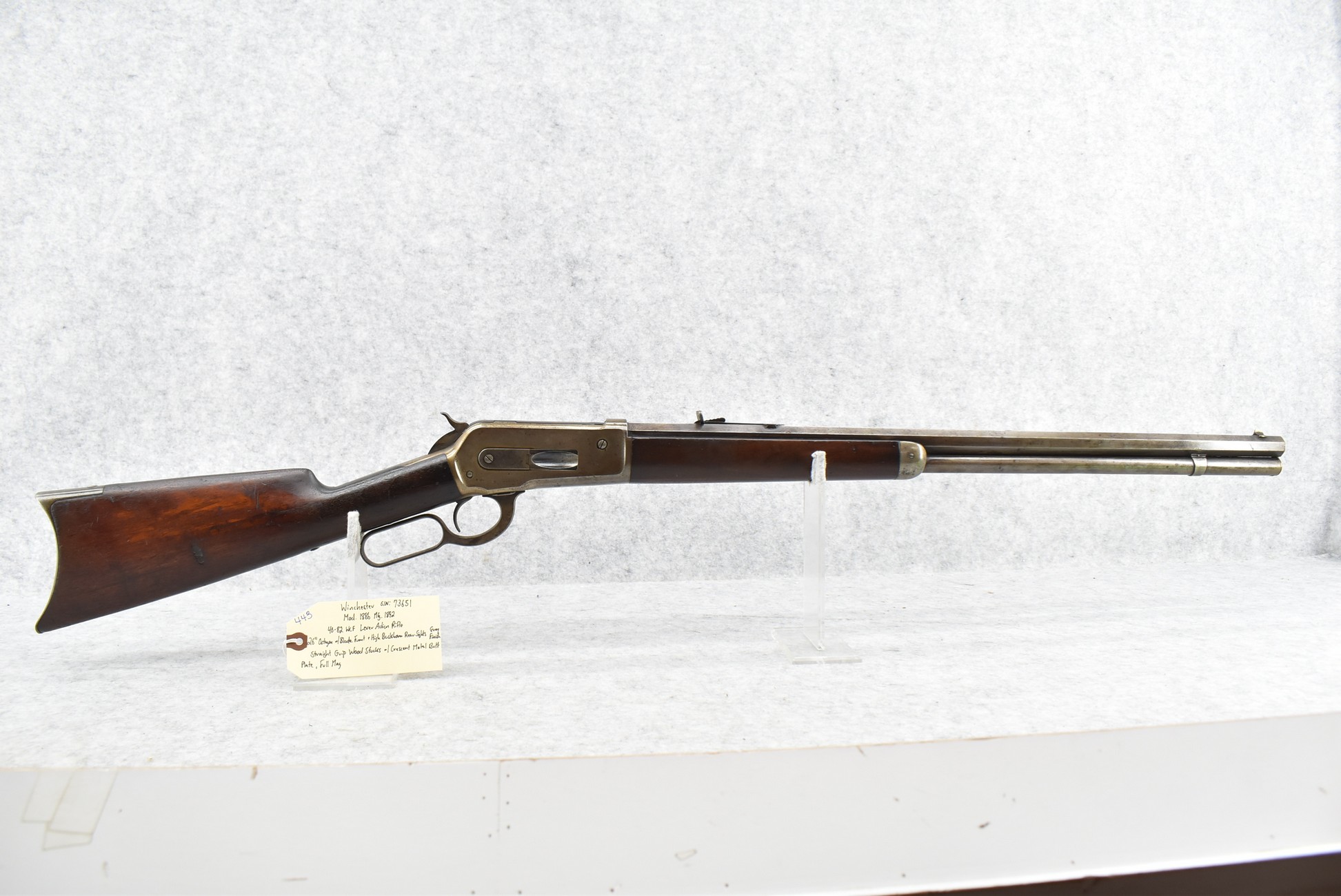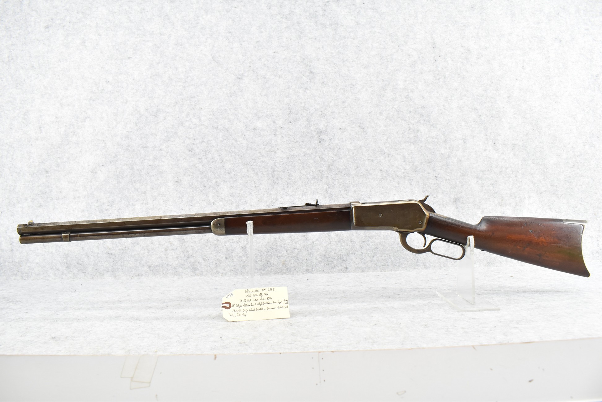 443. Winchester – Mod. 1886 – 40-82 WCF Cal. Lever Action Rifle – w/26” Octagon Barrel w/Blade Front and High Buckhorn Rear Sights – Grey Finish – w/Straight Grip Wood Stocks w/Crescent Metal Butt Plate – w/Full Length Magazine – Manufactured 1892