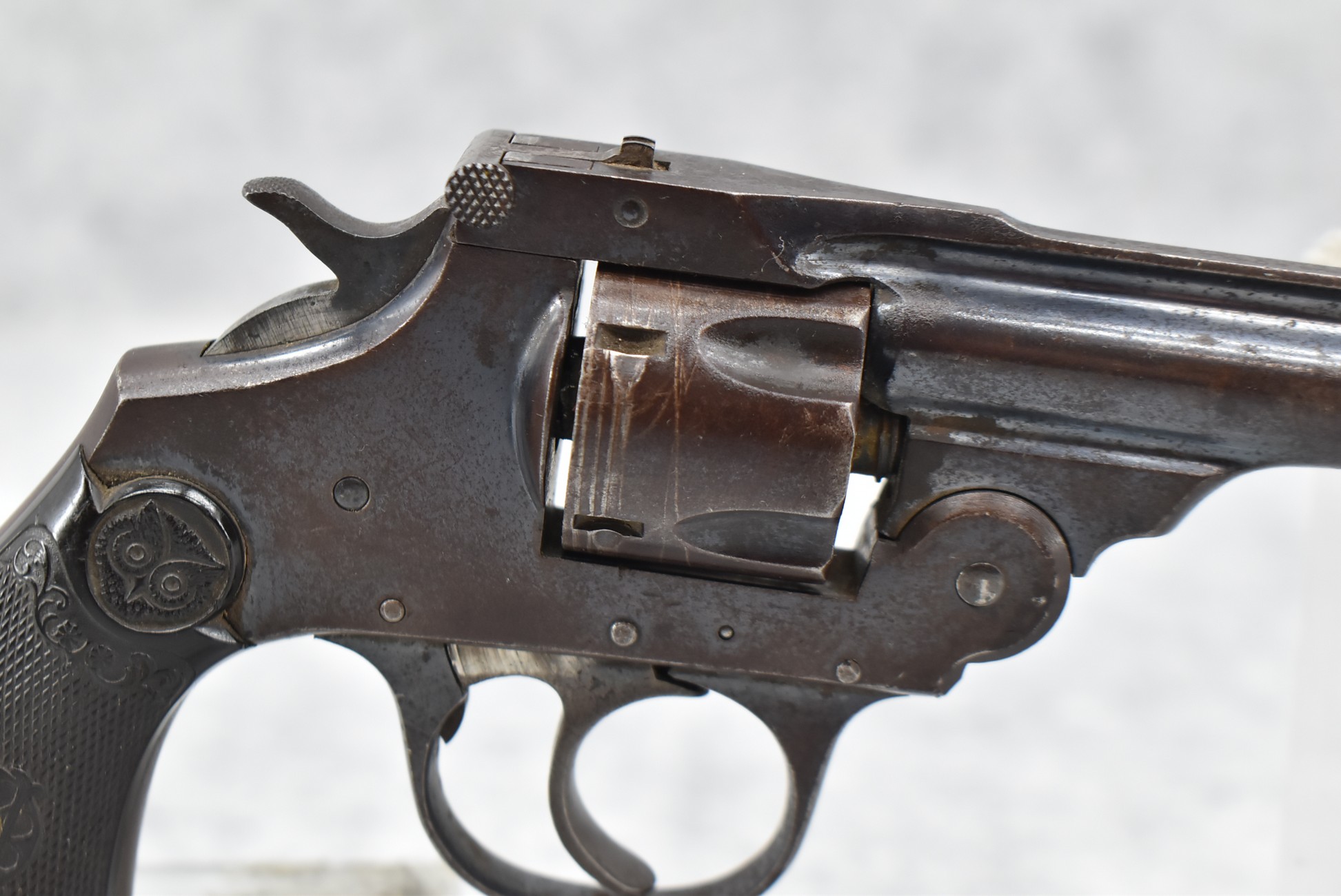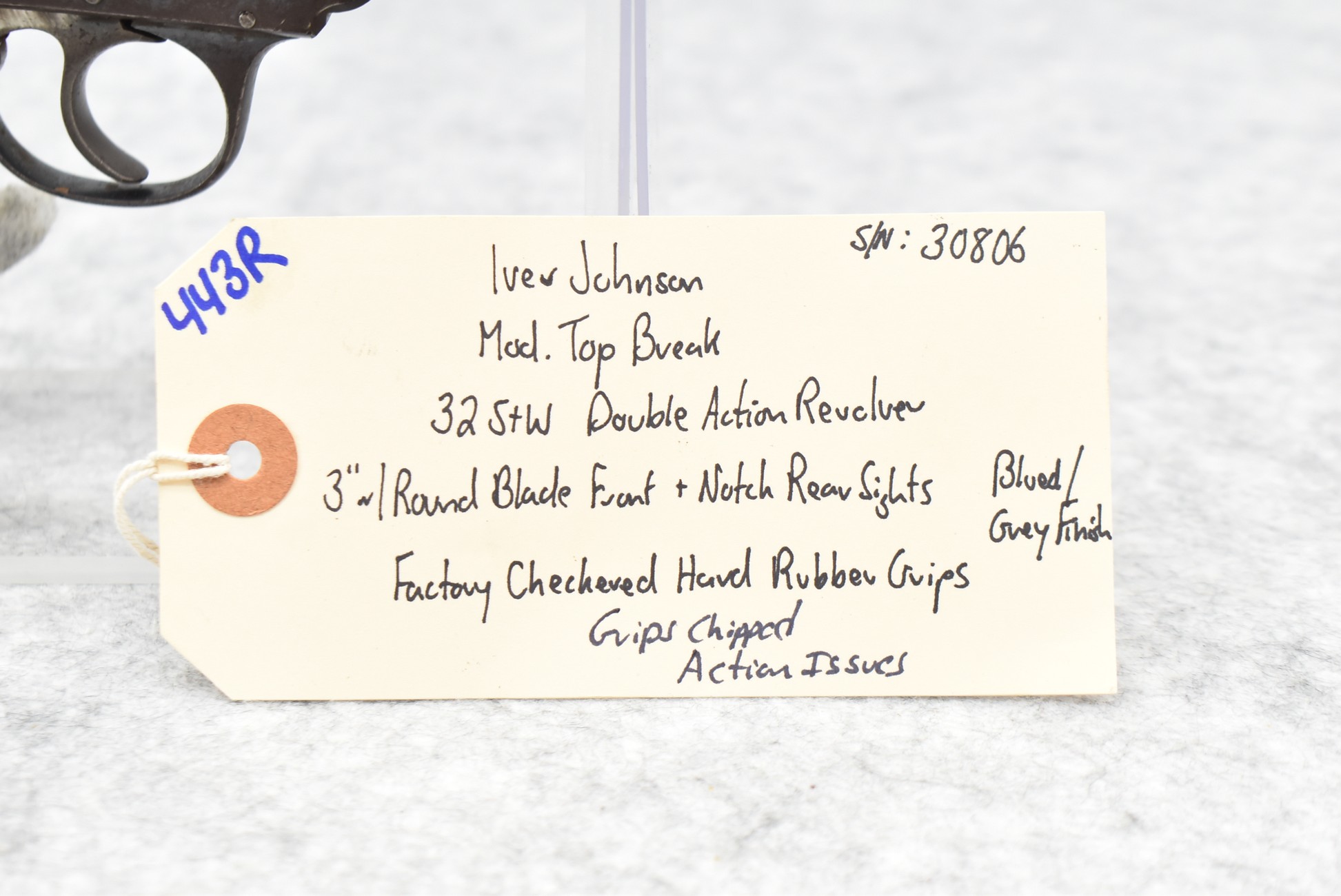 443R. Iver Johnson – Mod. Top Break – 32 S&W Cal. Double Action Revolver – w/3” Barrel w/Round Blade Front & Notch Rear Sights – Blued/Gray Finish – w/Factory Checkered Hard Rubber Grips – Note: Grips Chipped & Action Issues