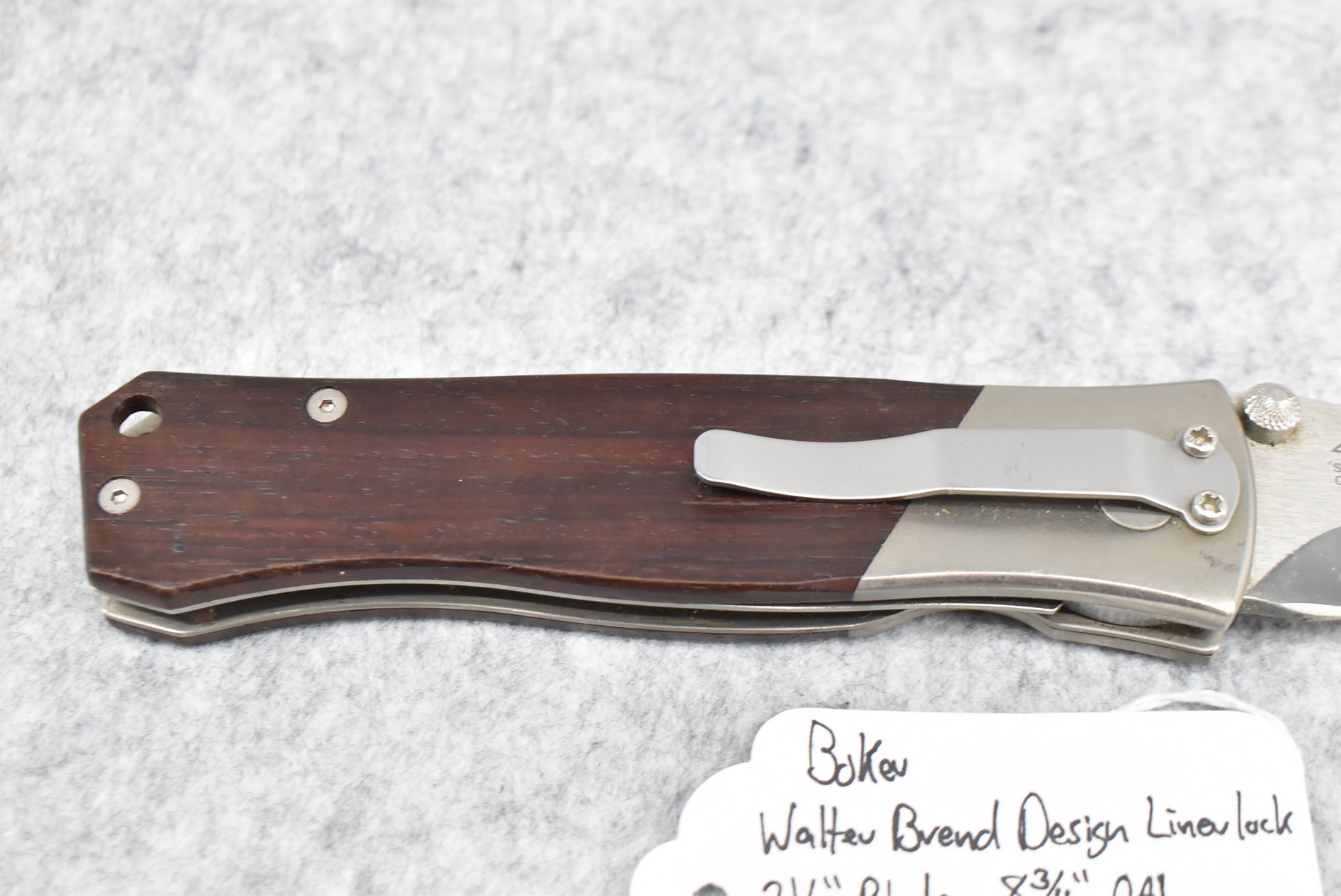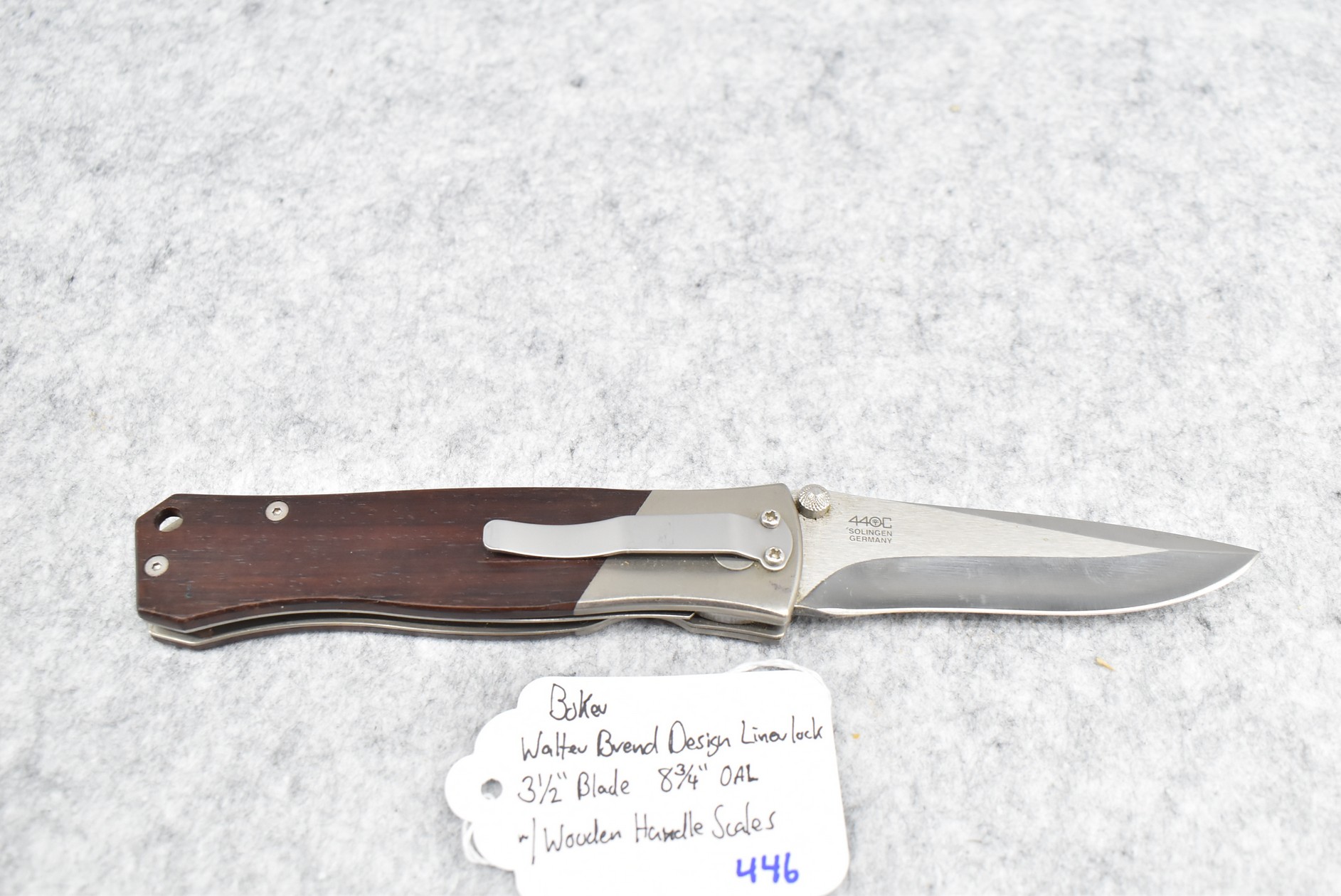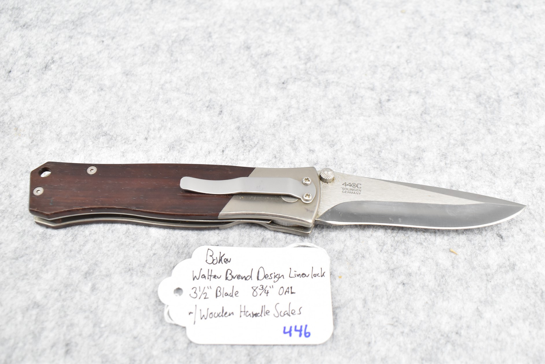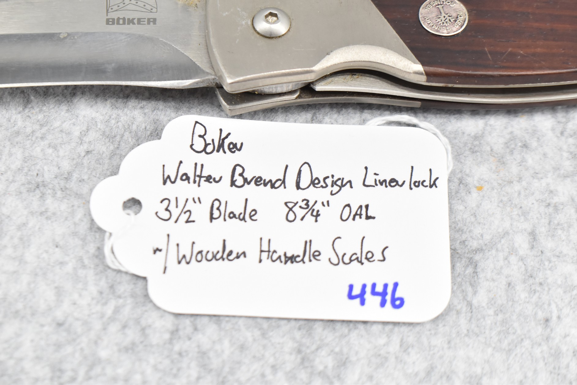 446. Boker – Walter Brend Desing Linerlock Folding Knife – w/3 ½” Blade – 8 ¾” Overall Length – w/Wooden Handle Scales