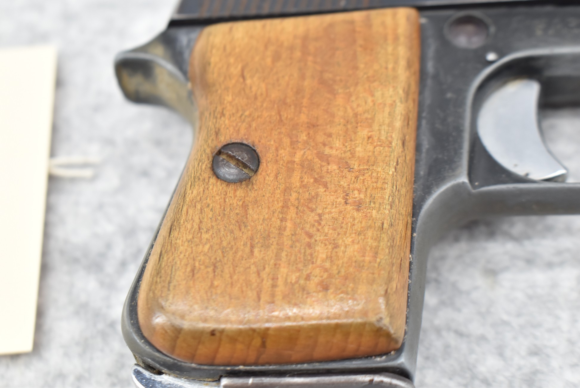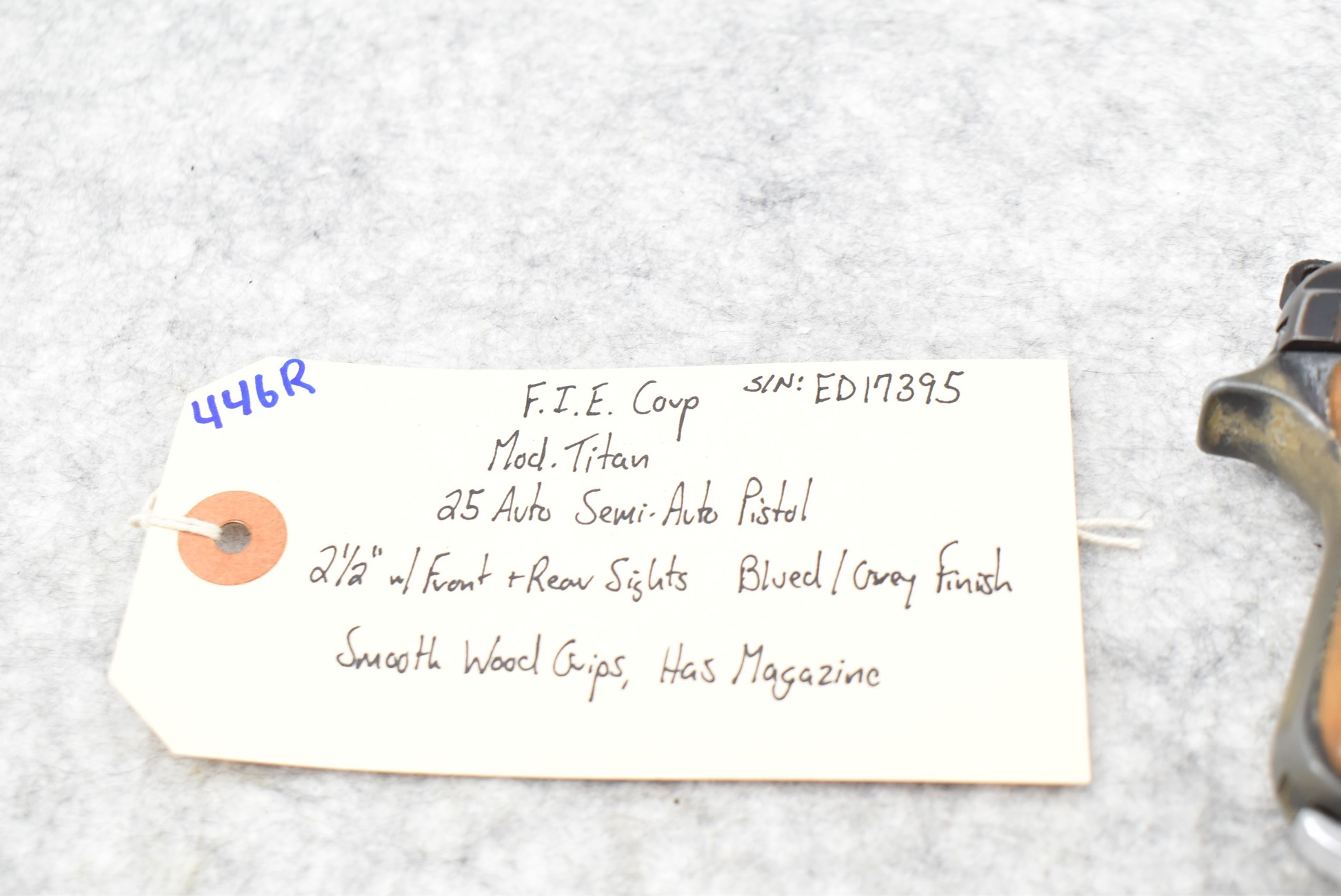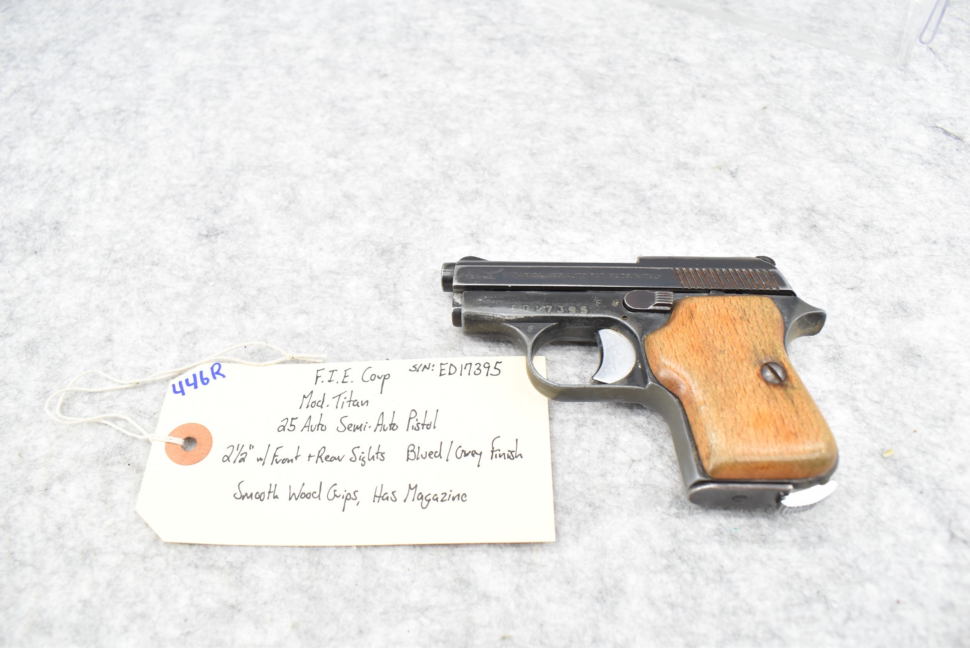 446R. F.I.E. Corp – Mod. Titan – 25 Auto Cal. Semi-Auto Pistol – w/2 ½” Barrel w/Front & Rear Sights – Blued/Gray Finish – w/Smooth Wood Grips – w/Magazine