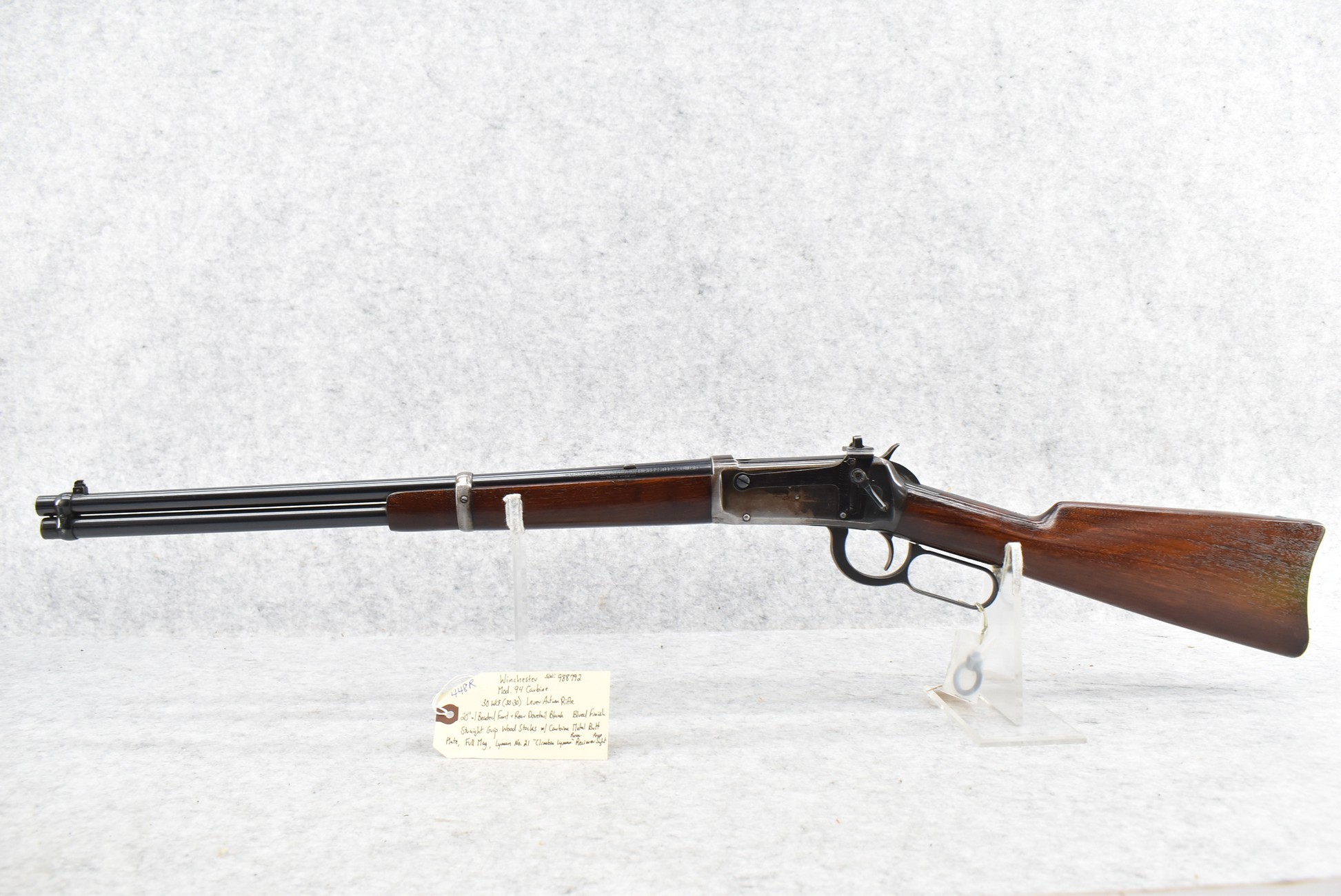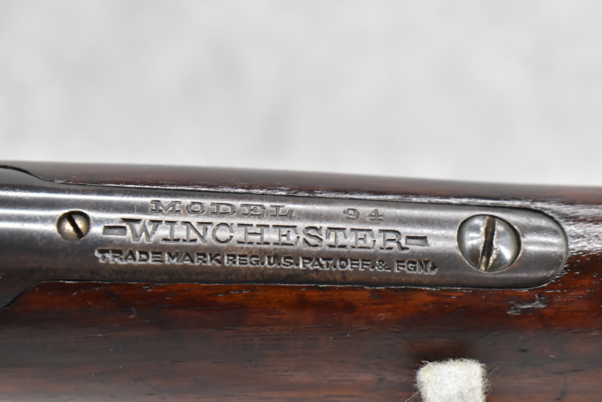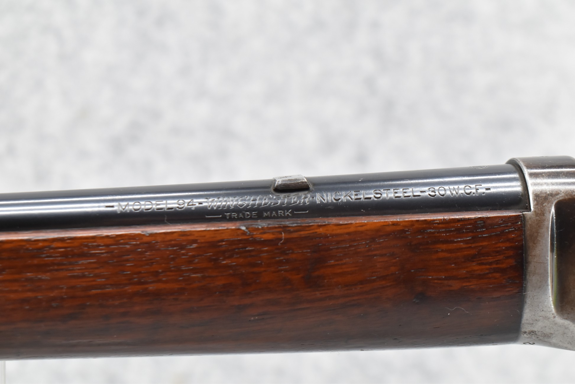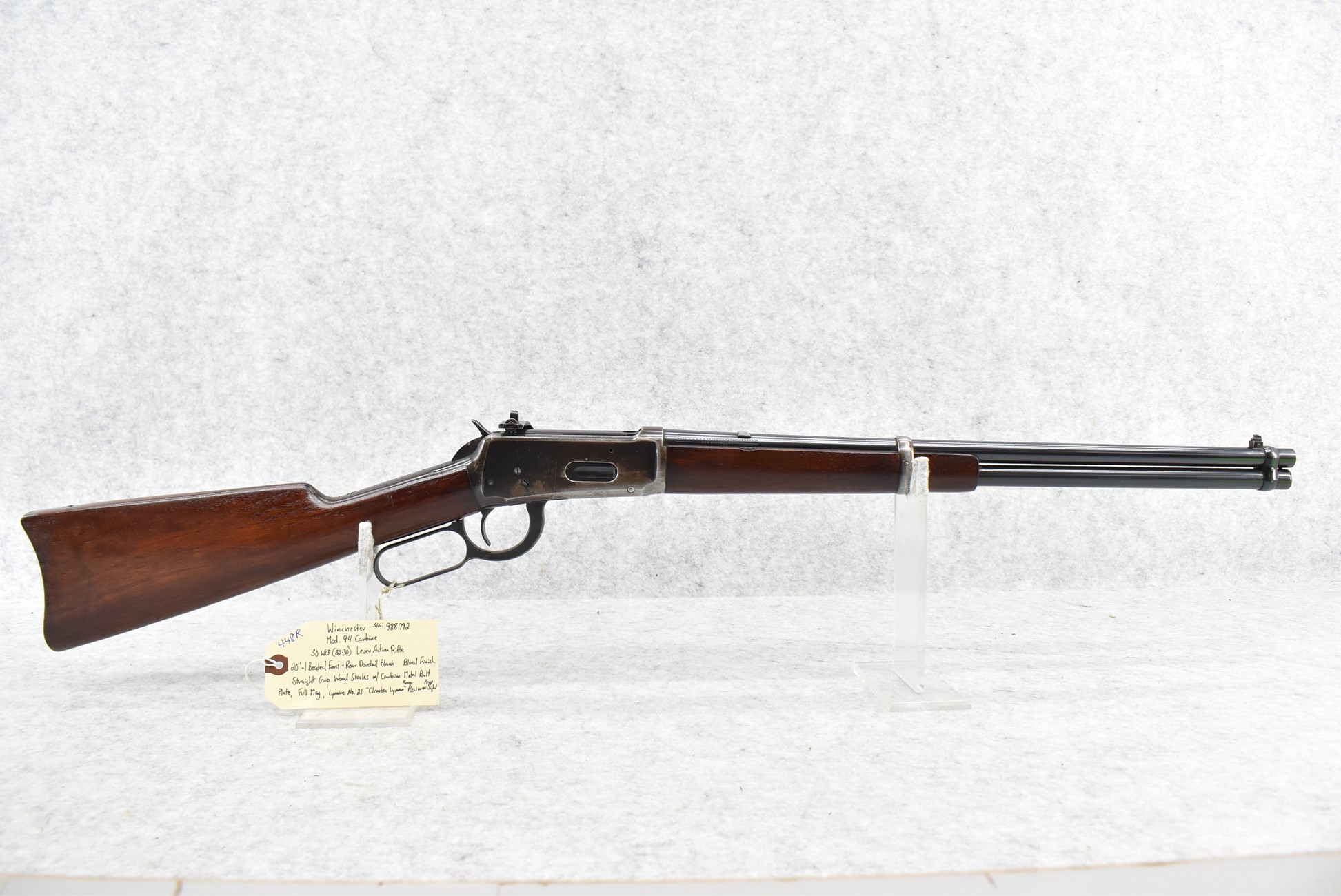 448R. Winchester – Mod. 94 Carbine – 30 WCF (30-30) Cal. Lever Action Rifle – w/20” Barrel w/Beaded Front and Rear Dovetail Blank Sights – Blued Finish – w/Straight Grip Wood Stocks w/Carbine Metal Butt Plate – w/Full Magazine – w/Lyman No. 21 “Climbin Lyman” Rear Receiver Peep Sight