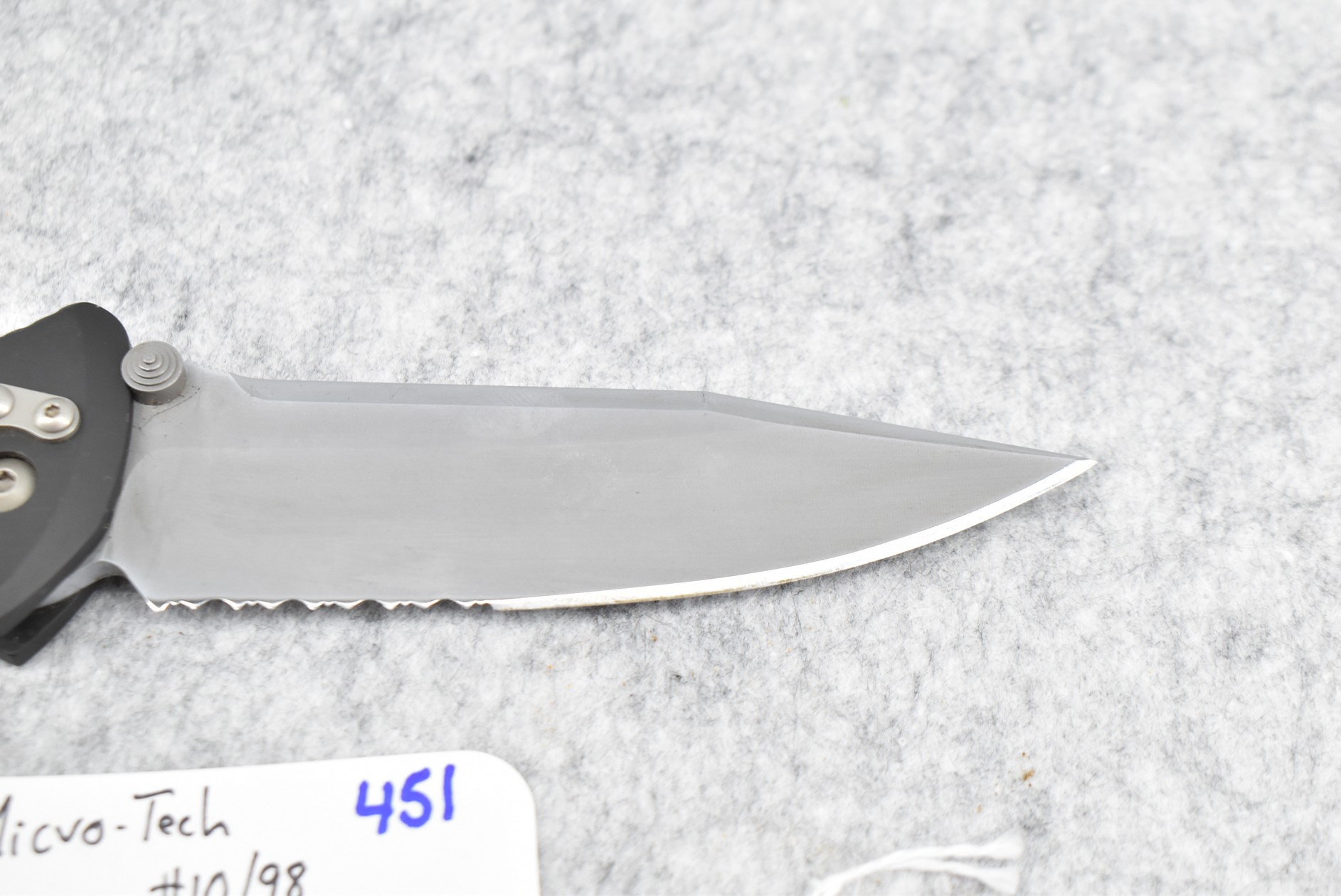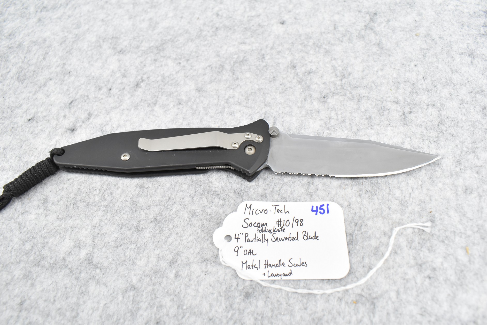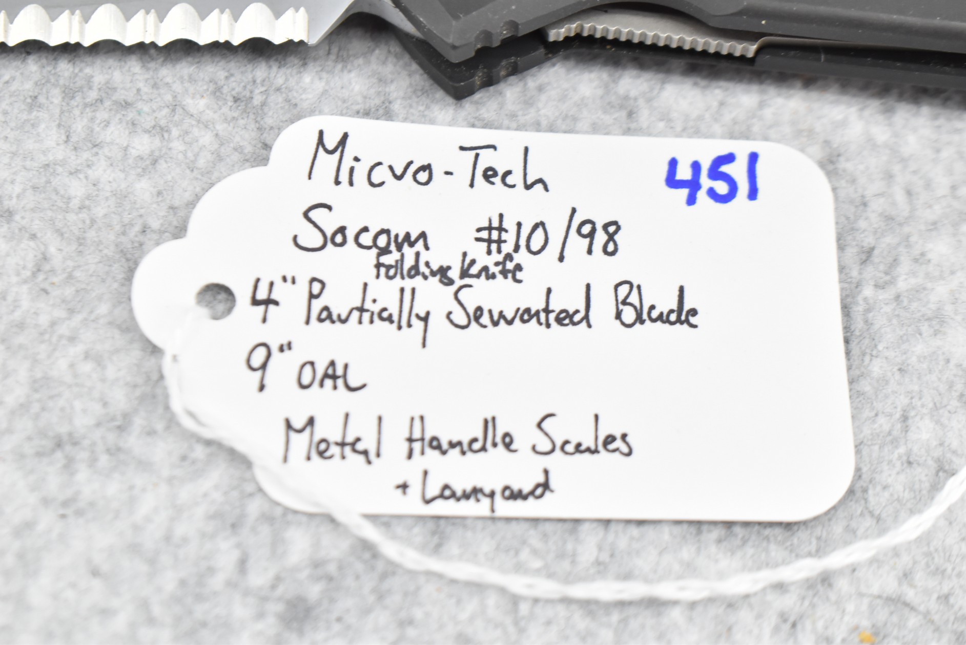 451. Micro-Tech – Socom #10/98 Folding Knife – w/4” Partially Serrated Blade – 9” Overall Length – w/Metal Handle Scales – w/Lanyard