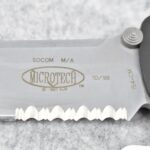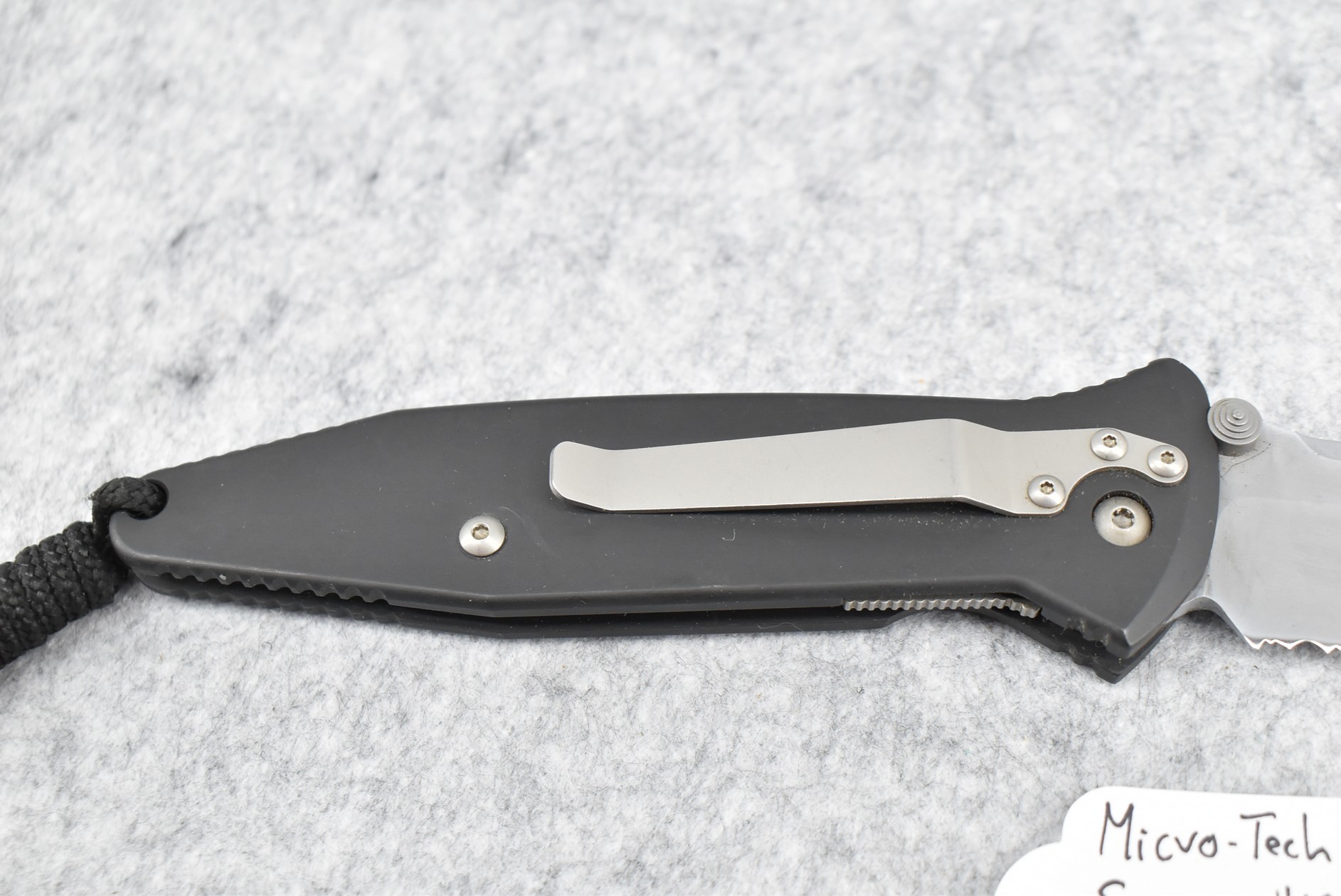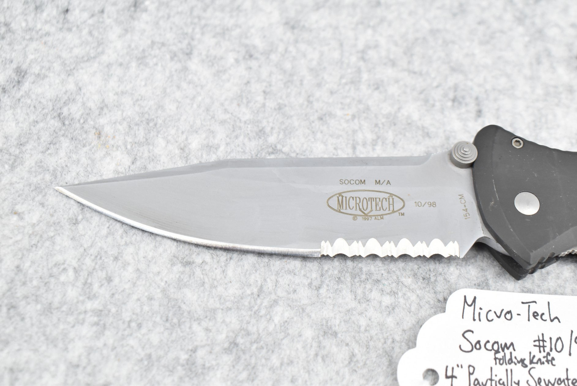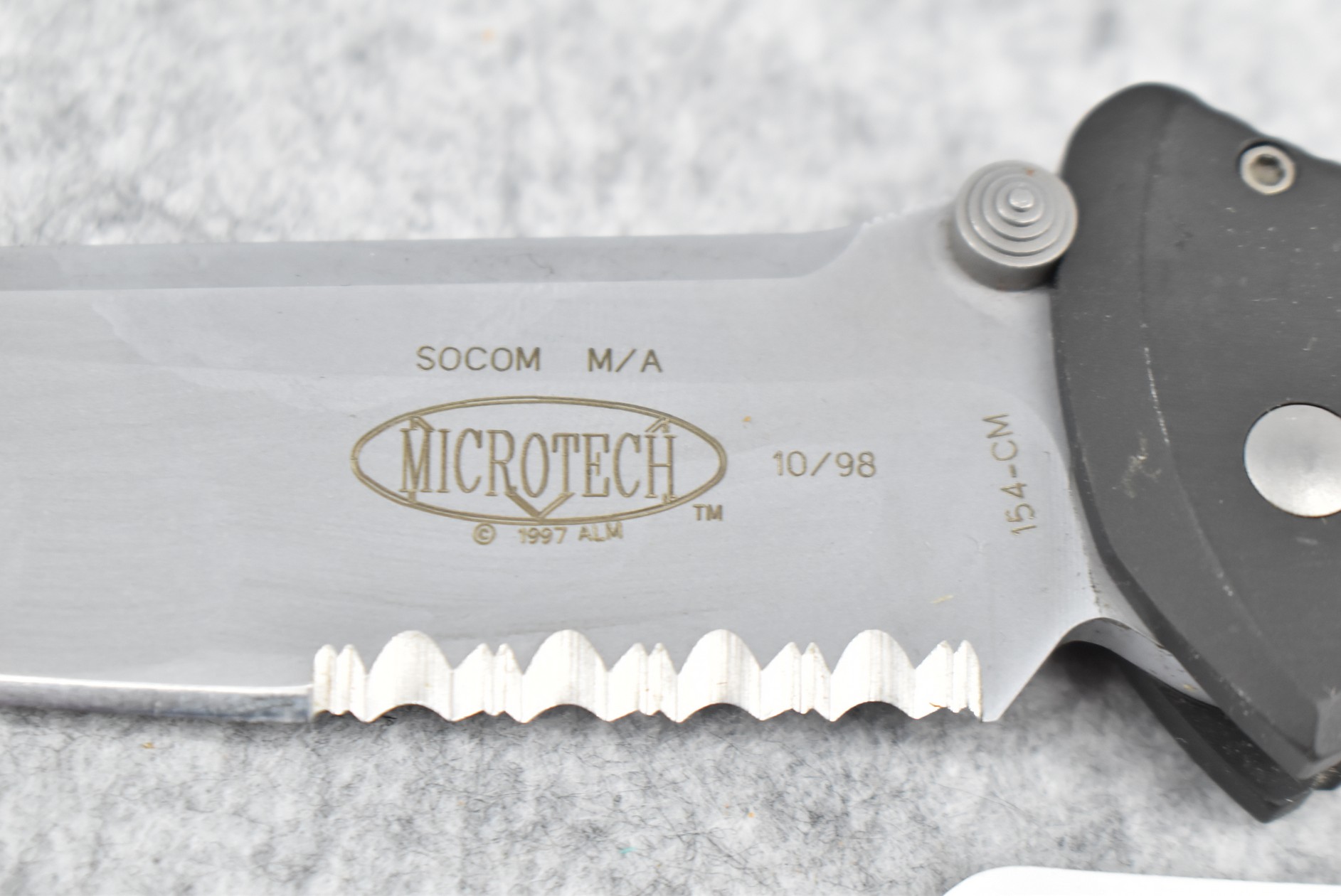 451. Micro-Tech – Socom #10/98 Folding Knife – w/4” Partially Serrated Blade – 9” Overall Length – w/Metal Handle Scales – w/Lanyard