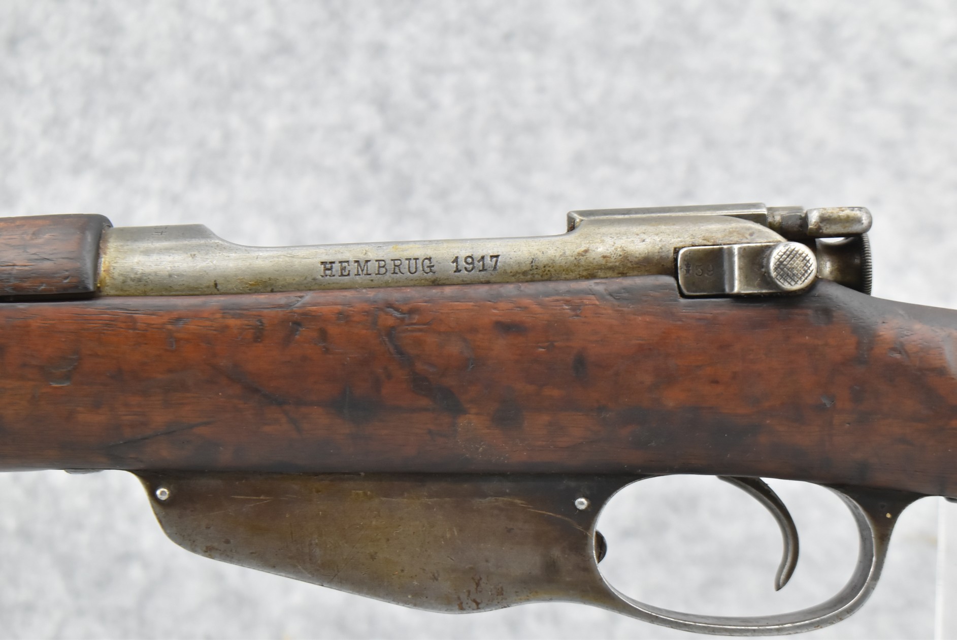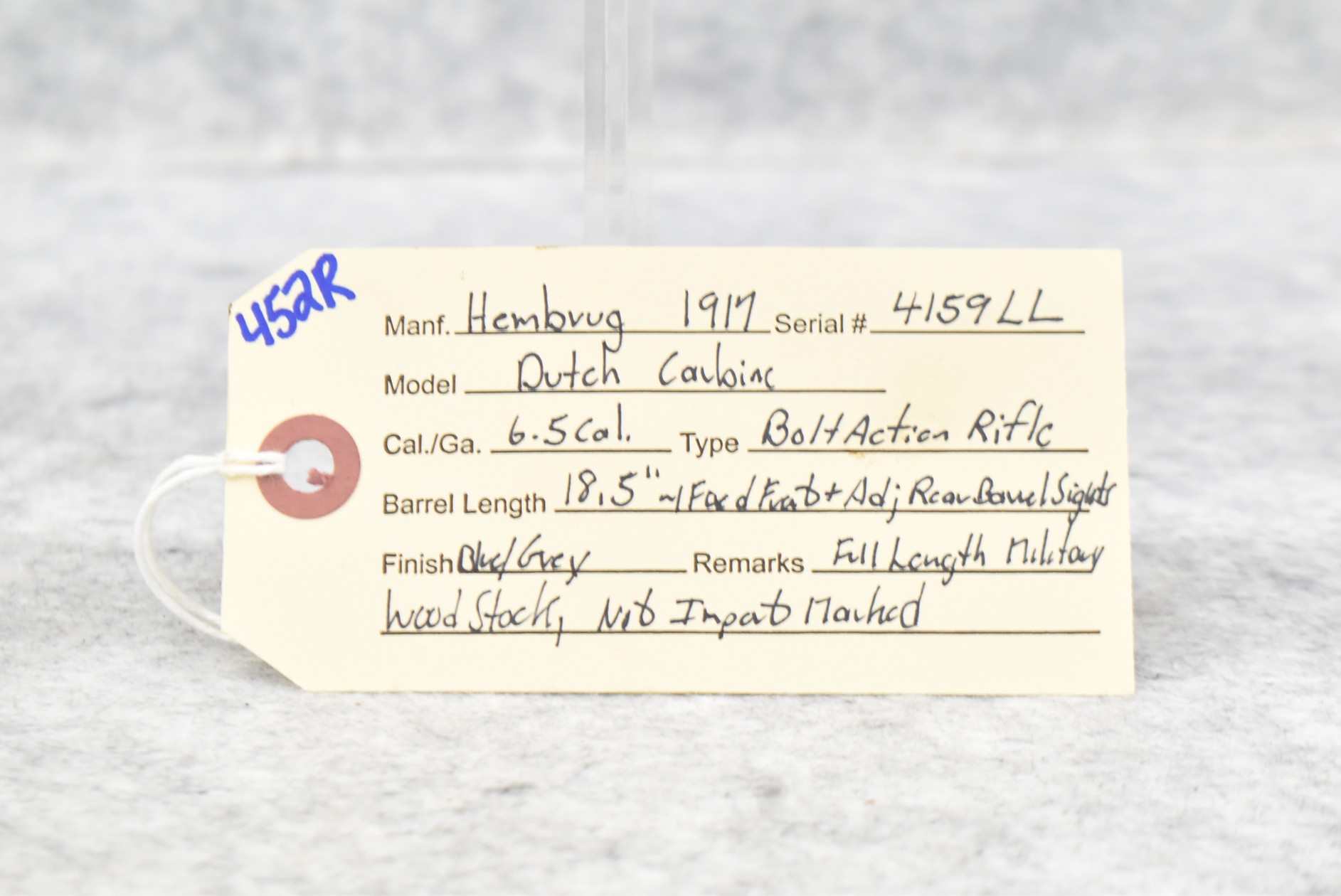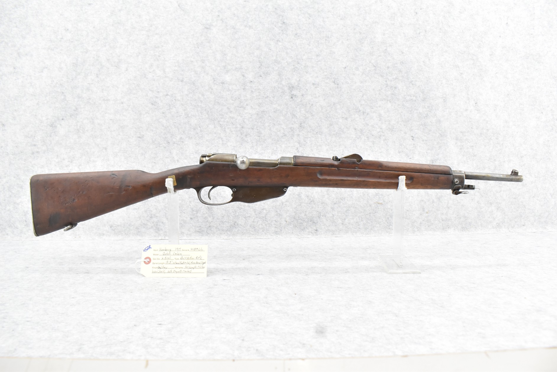 452R. Hembrug – Mod. Dutch Carbine – 6.5 Cal. Bolt Action Rifle – w/18 ½” Barrel w/Fixed Front & Adj. Rear Barrel Sights – Blued/Gray Finish – w/Full Length Military Wood Stock – Dated 1917 – Not Import Marked