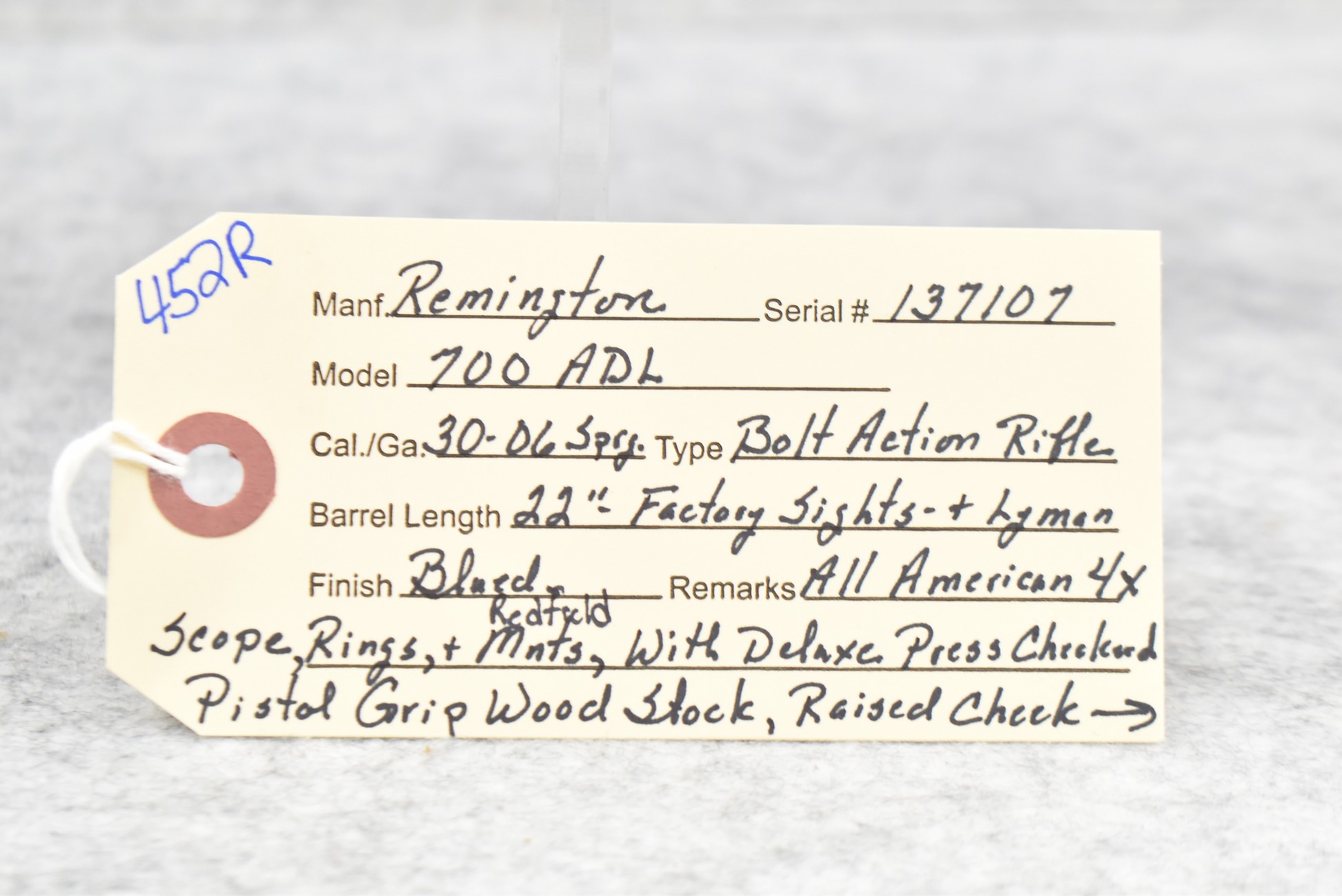 452R. Remington – Mod. 700 ADL – 30-06 Sprg. Cal. Bolt Action Rifle – w/22” Barrel w/Factory Sights – Blued Finish – w/Deluxe Press Checkered Pistol Grip Wood Stock w/Raised Cheek Piece w/Factory Aluminum Butt Plate – w/Lyman All American 4x Scope, Rings & Redfield Mounts