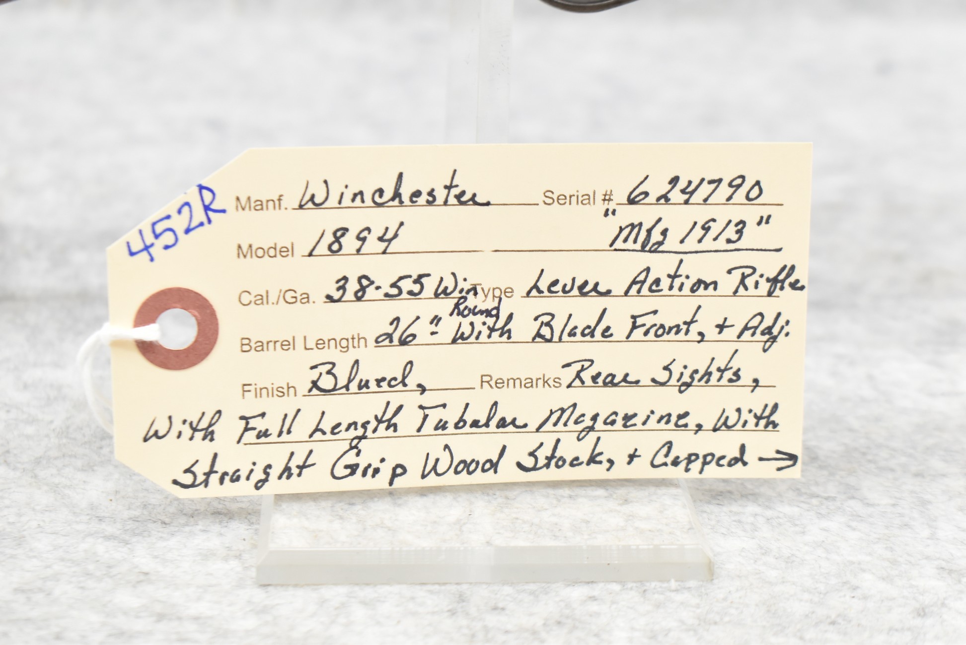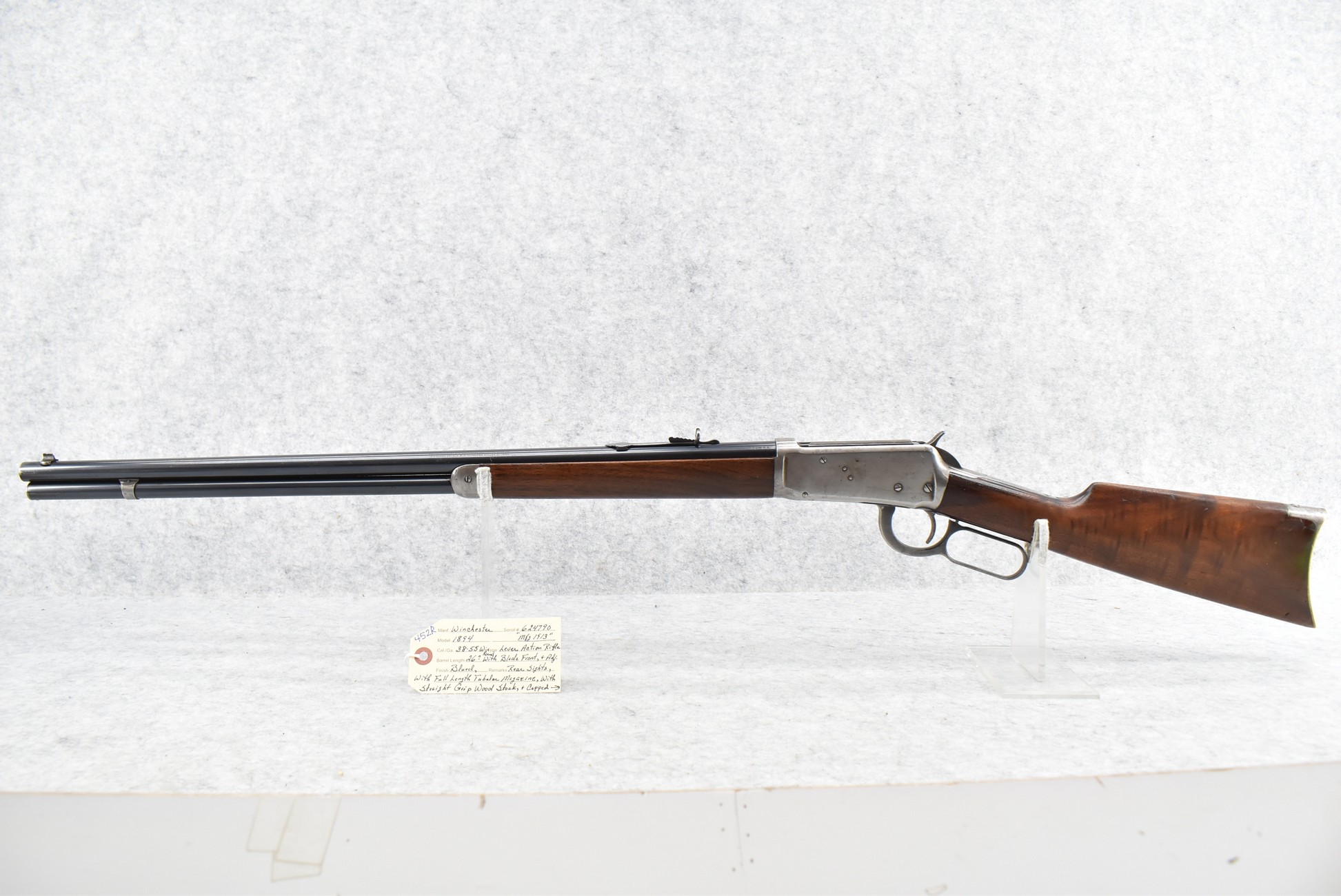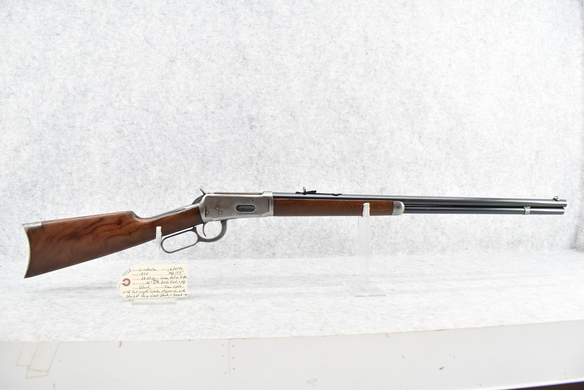 452R. Winchester – Mod. 1894 – 38-55 Win. Cal. Lever Action Rifle – w/26” Round Barrel w/Blade Front and Adjustable Rear Sights – Blued Finish – w/Straight Grip Wood Stock and Capped Forearm w/Crescent Metal Butt Plate – w/Full Length Tubular Magazine – Manufactured 1913