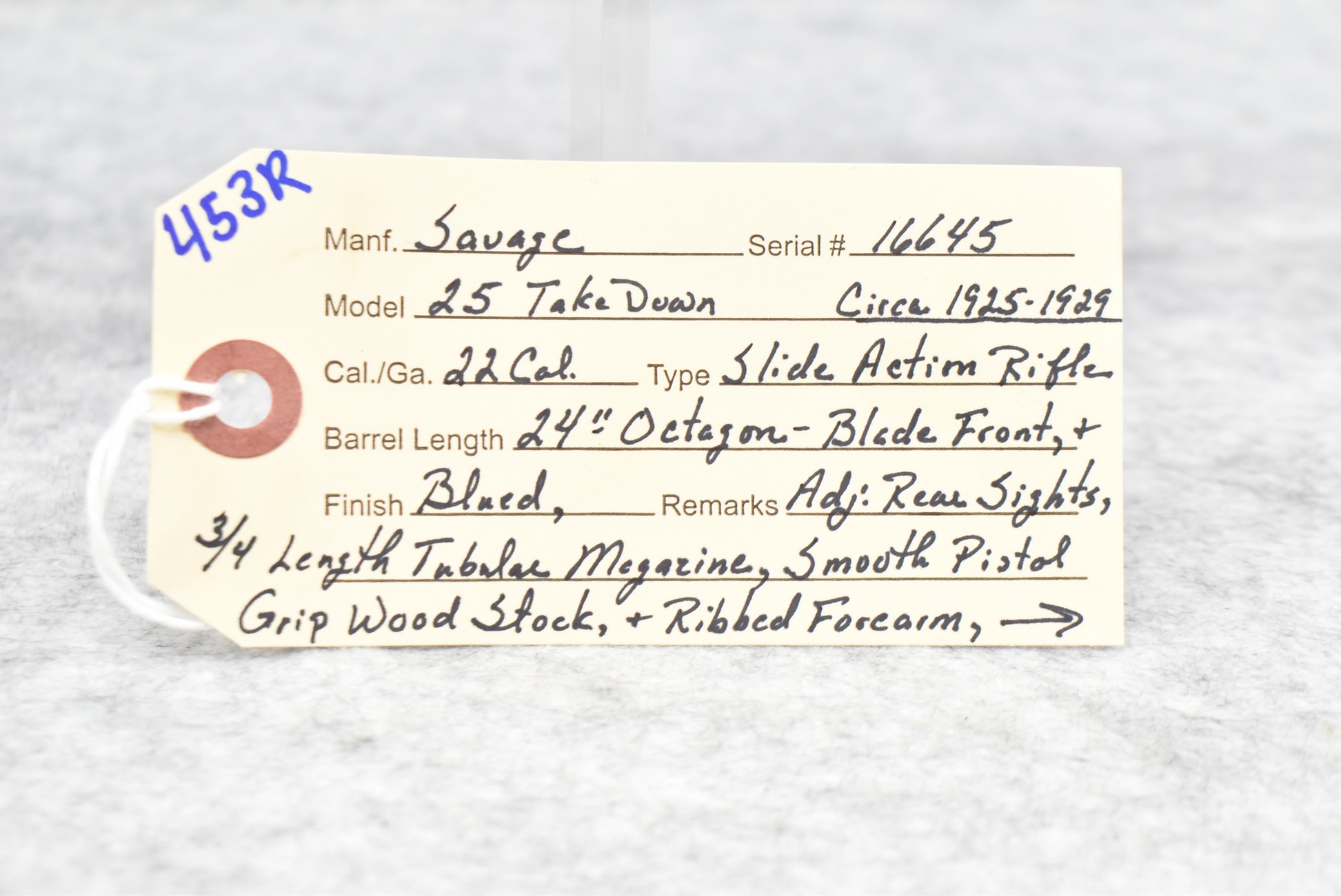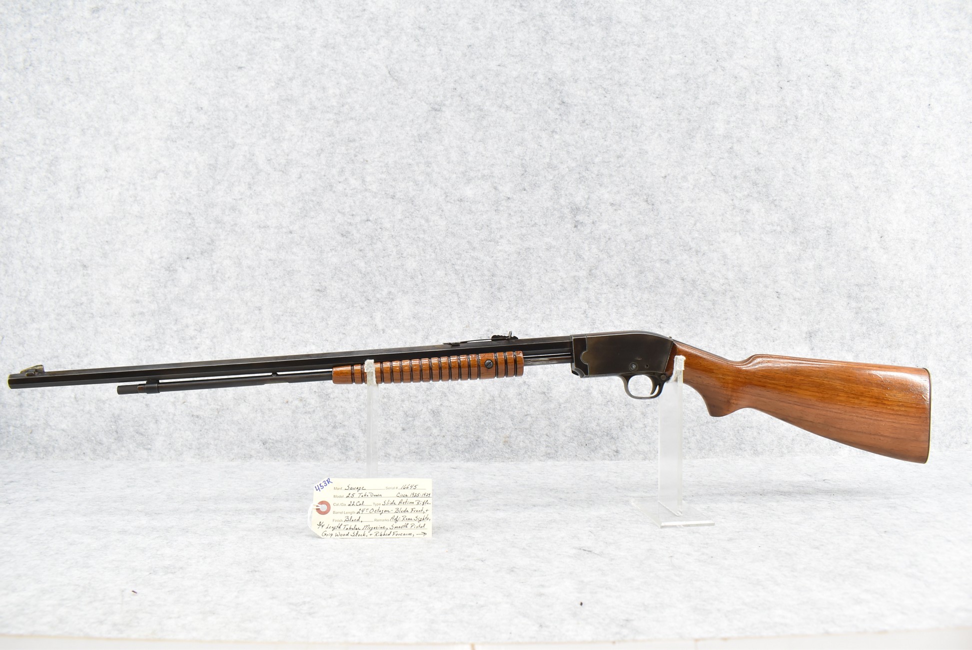 453R. Savage – Mod. 25 Take Down – 22 Cal. Pump Action Rifle – w/24” Octagon Barrel w/Blade Front & Adj. Rear Sights w/3/4 Length Tubular Magazine – w/Smooth Pistol Grip Wood Stock & Ribbed Forearm w/Factory Metal Butt Plate