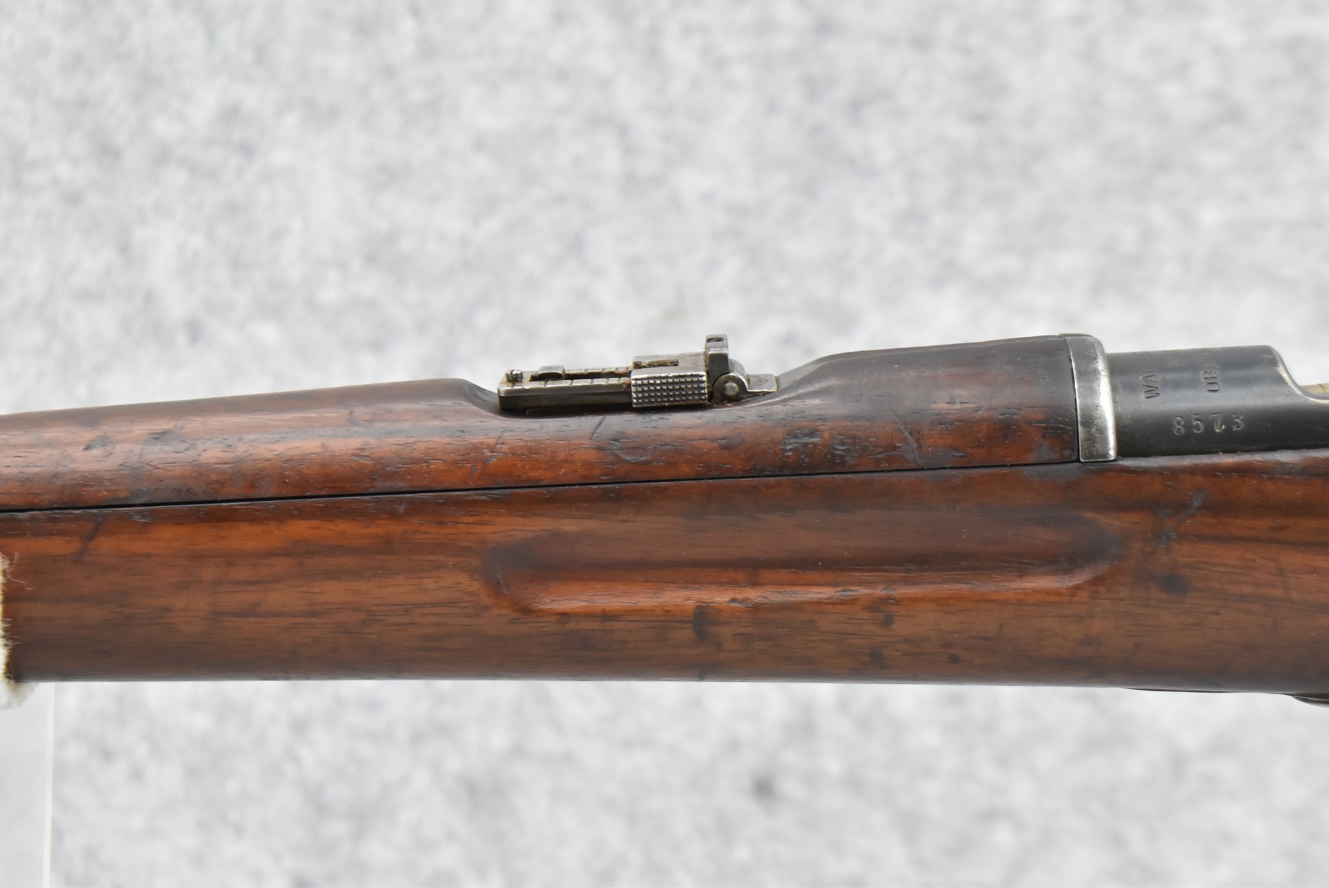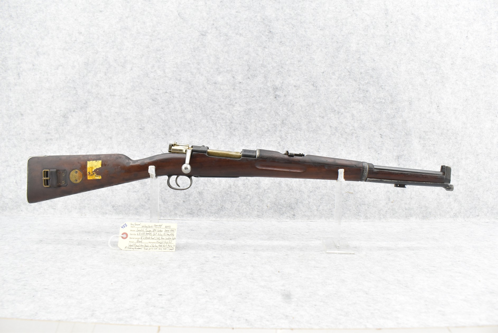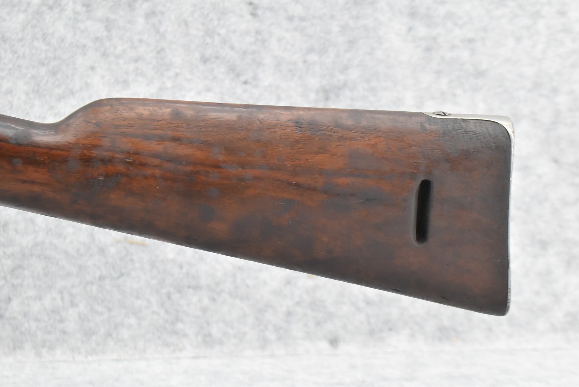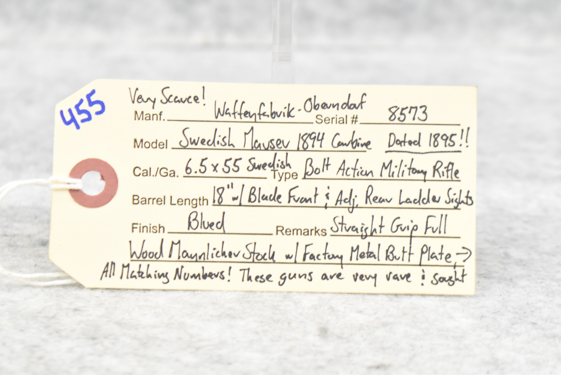 455. Very Scarce! Waffenfabrik-Oberndorf – Mod. Swedish Mauser 1894 Carbine – 6.5×55 Swedish Cal. Bolt Action Military Rifle – w/18” Barrel w/Blade Front & Adj. Rear Ladder Sights – Blued Finish – w/Straight Grip Full Wood Mannlicher Stock w/Factory Metal Butt Plate – All Matching Numbers! – Dated 1895!! – These Guns Are Very Rare & Sought After, This One Especially Due to the Fact it is Dated 1895, Making This One of the 12,000 First Produced in Germany Before Production Moved to Sweden!! – Great Find!!