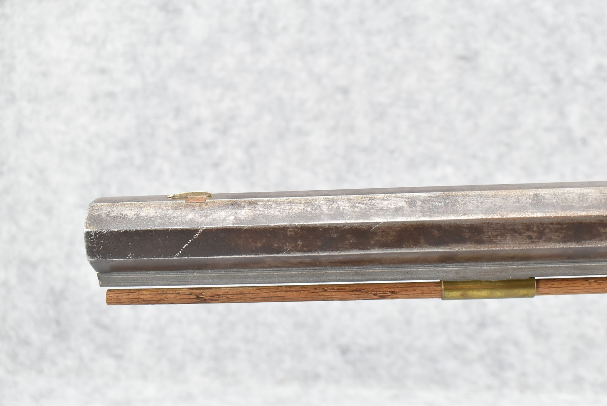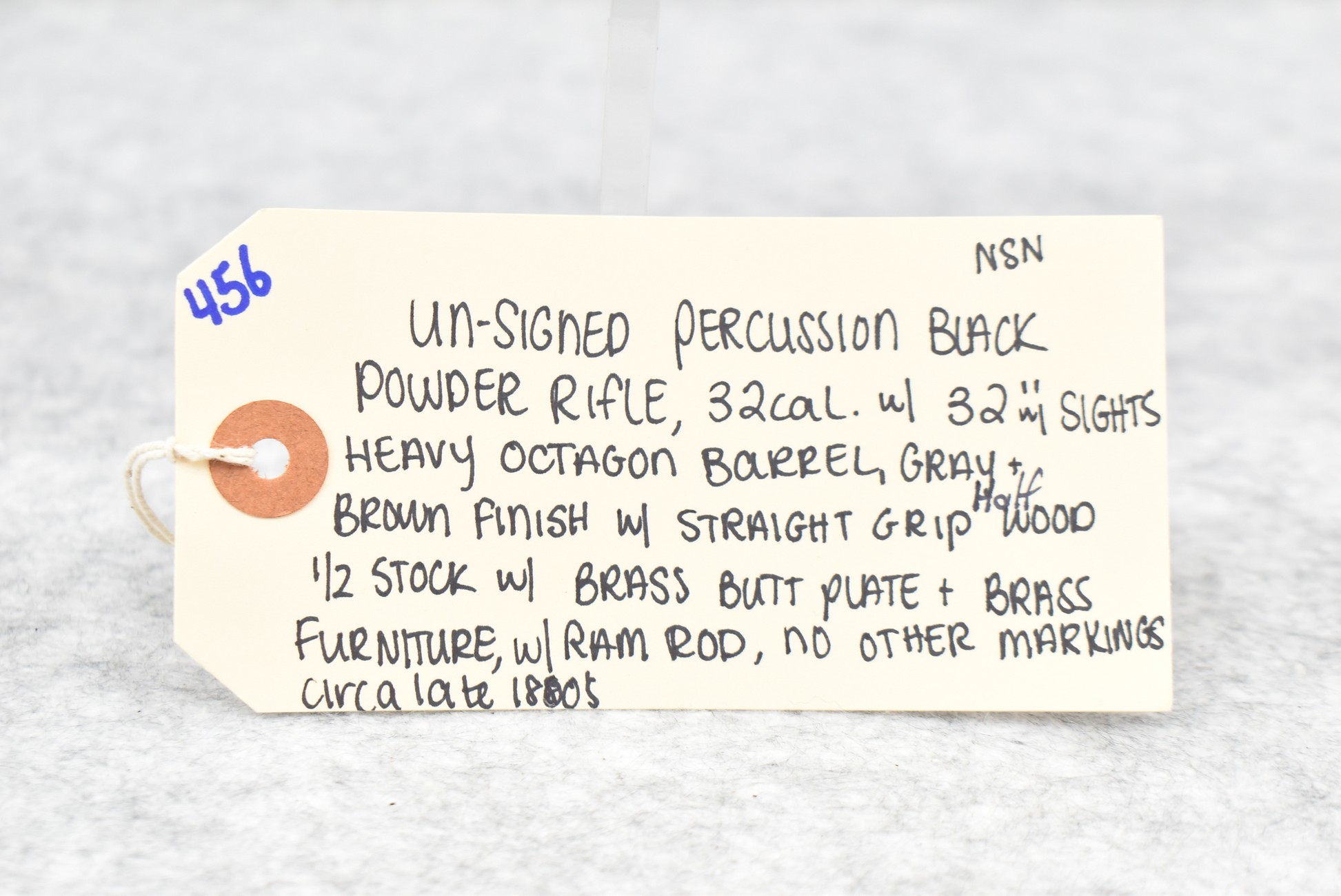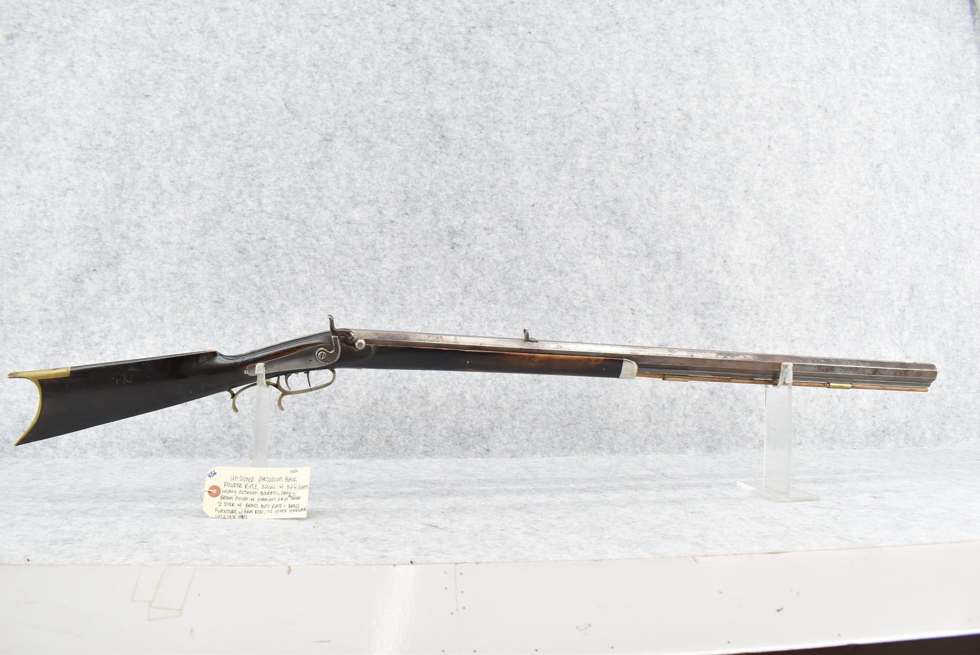 456. Unsigned – 32 Cal. Black Powder Percussion Rifle – w/32” Heavy Octagon Barrel w/Sights – Gray/Brown Finish – w/Straight Grip Half Wood Stock w/Brass Butt Plate & Furniture – w/Ram Rod – No Markings