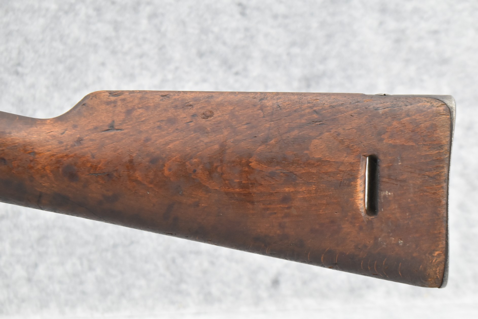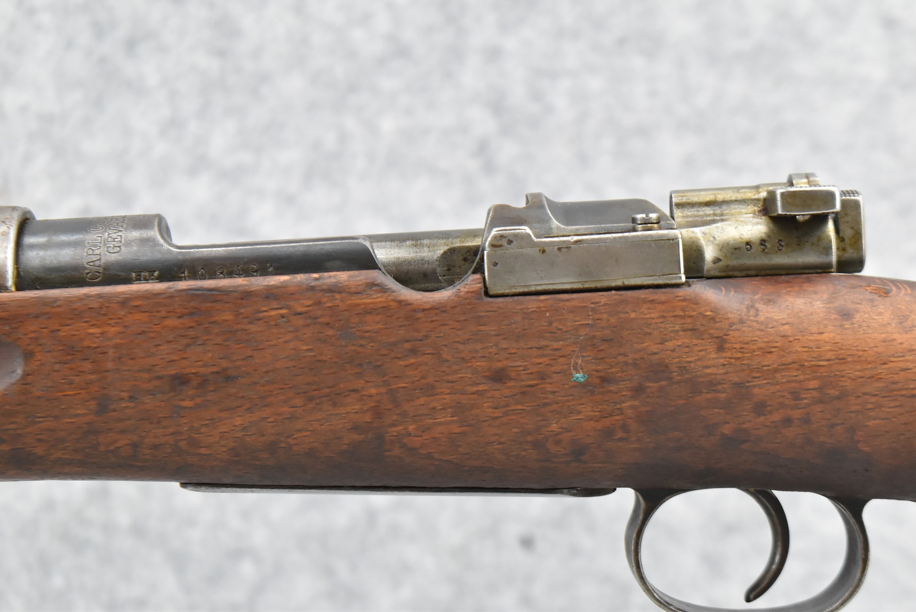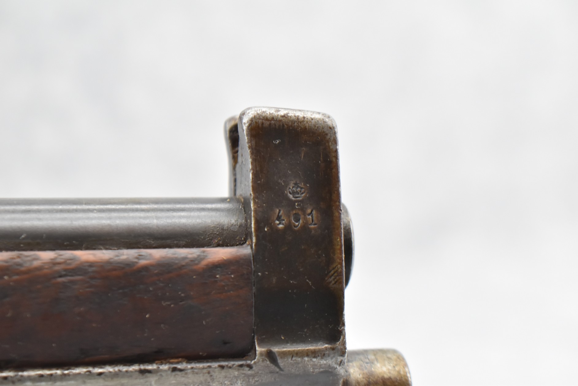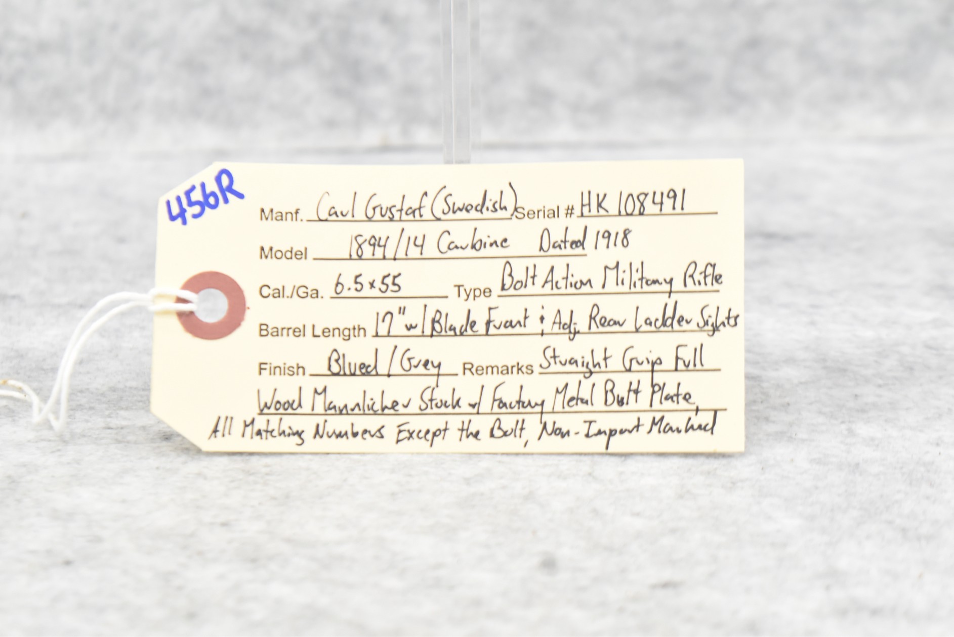 456R. Carl Gustaf (Swedish) – Mod. 1894/14 Carbine – 6.5×55 Cal. Bolt Action Military Rifle – w/17” Barrel w/Blade Front & Adj. Rear Ladder Sights – Blued/Gray Finish – w/Straight Grip Full Wood Mannlicher Stock w/Factory Metal Butt Plate – All Matching Numbers Except the Bolt – Dated 1918 – Non-Import Marked