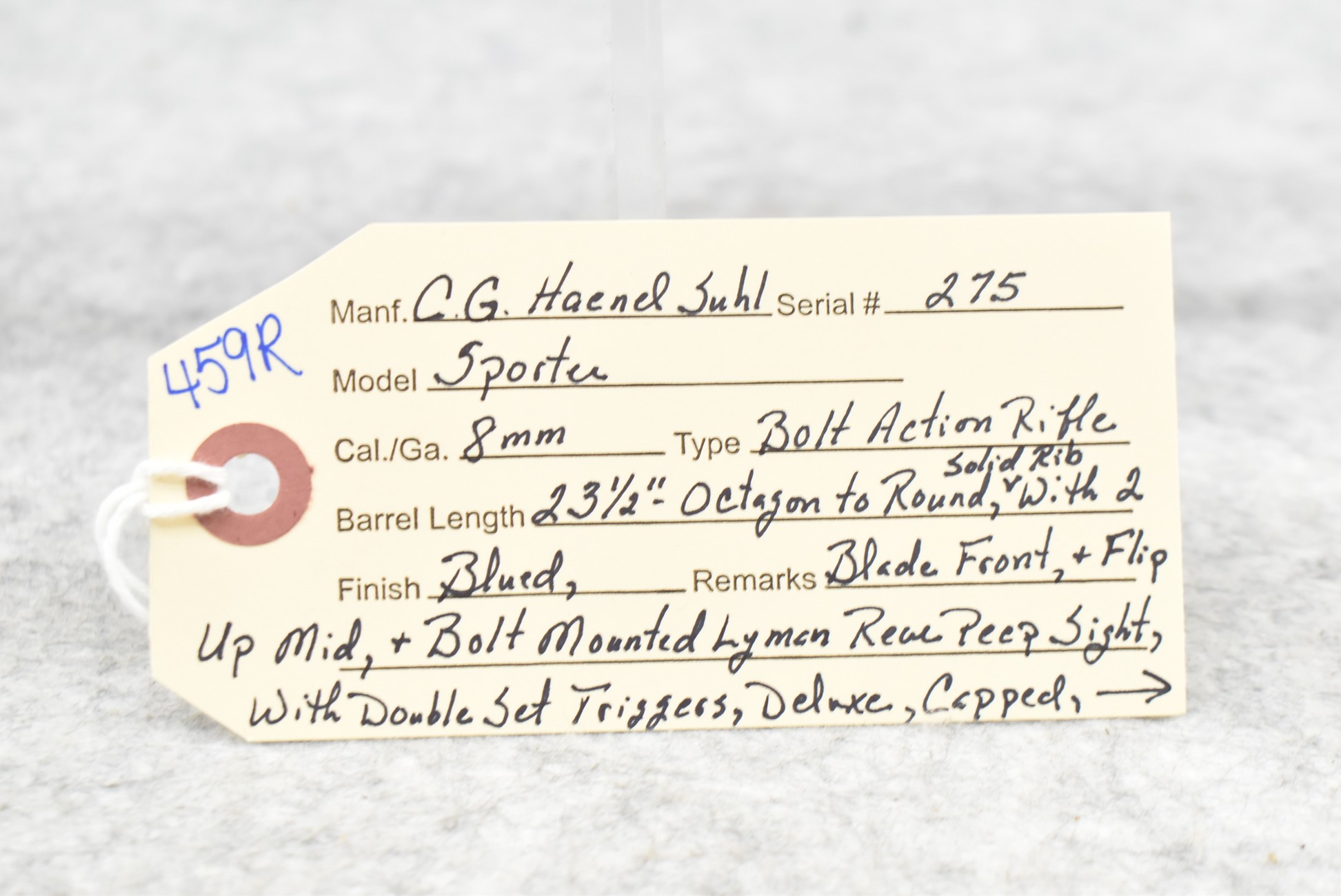 459R. C.G. Haenel Suhl – Mod. Sporter – 8mm Cal. Bolt Action Rifle – w/23 ½” Octagon to Round, Solid Rib Barrel w/2 Blade Front & Flip Up Mid Sights & Bolt Mounted Lyman Rear Peep Sight – Blued Finish – w/Deluxe Capped Pistol Grip Wood Stock w/Raised Cheek Piece w/Pachmayr Butt Pad – w/Sling Loops – w/Double Set Triggers