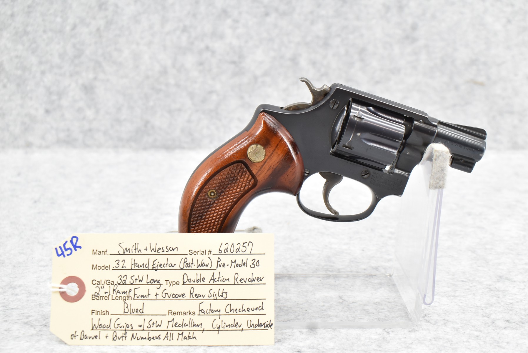 45R. Smith & Wesson – Mod. .32 Hand Ejector (Post-War) Pre-Model 30 – 32 S&W Long Cal. Double Action Revolver – w/2” Barrel w/Ramp Front & Groover Rear Sights – Blued Finish – w/Factory Checkered Wood Grips w/S&W Medallion – Cylinder, Underside of Barrel & Butt Numbers All Match