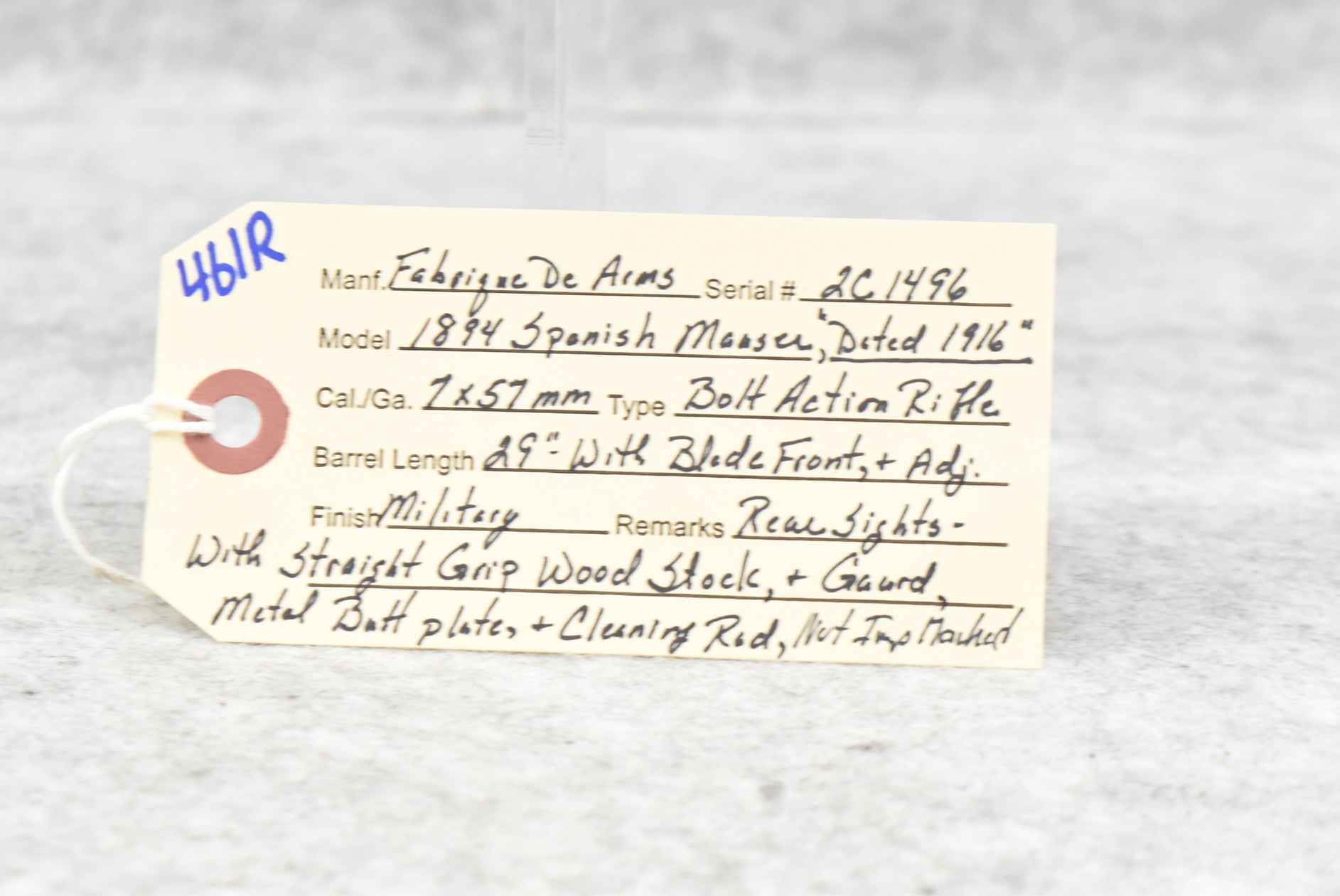 461R. Fabrique De Arms – Mod. 1894 Spanish Mauser – 7x57mm Cal. Bolt Action Rifle – w/29” Barrel w/Blade Front & Adj. Rear Sights – Military Finish – w/Straight Grip Wood Stocks w/Metal Butt Plate – w/Cleaning Rod – Dated 1916 – Not Import Marked